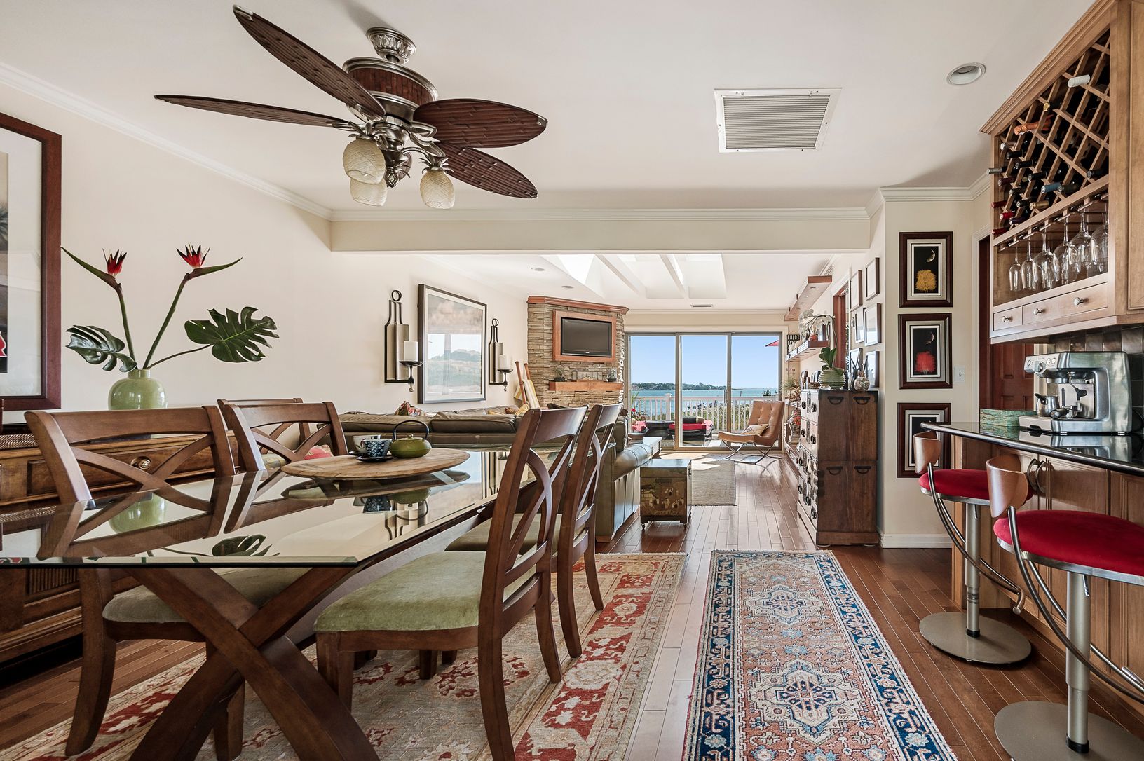 The second-story residence enjoys sweeping water views and natural light throughout, with skylights, high ceilings, and an open-concept living and dining area that connects seamlessly to a pri