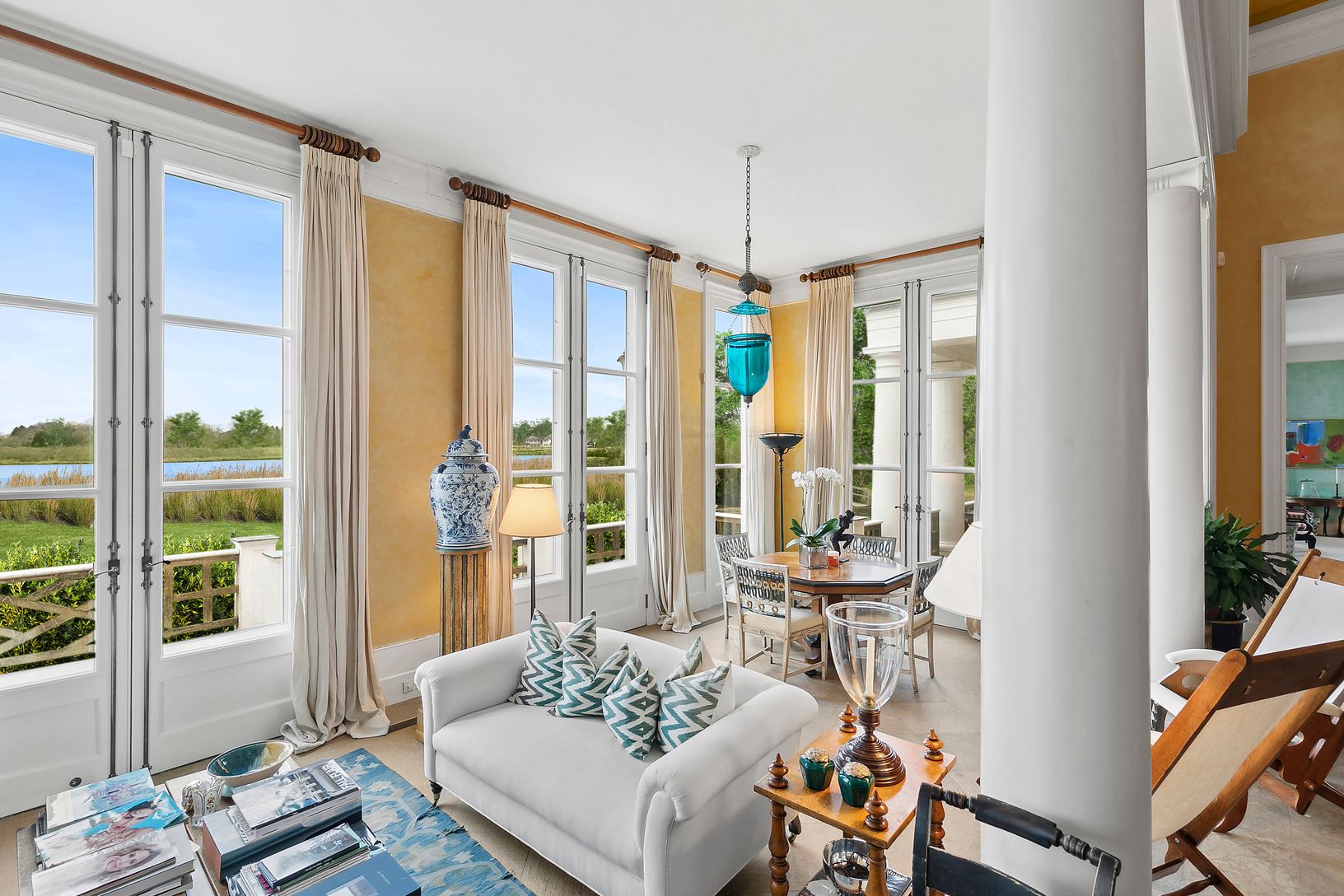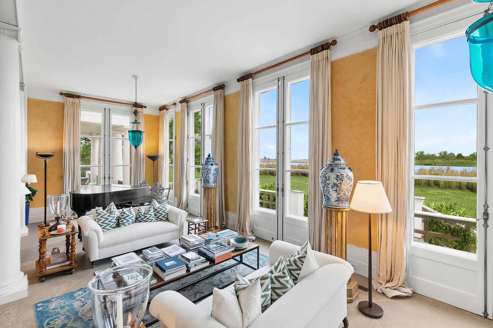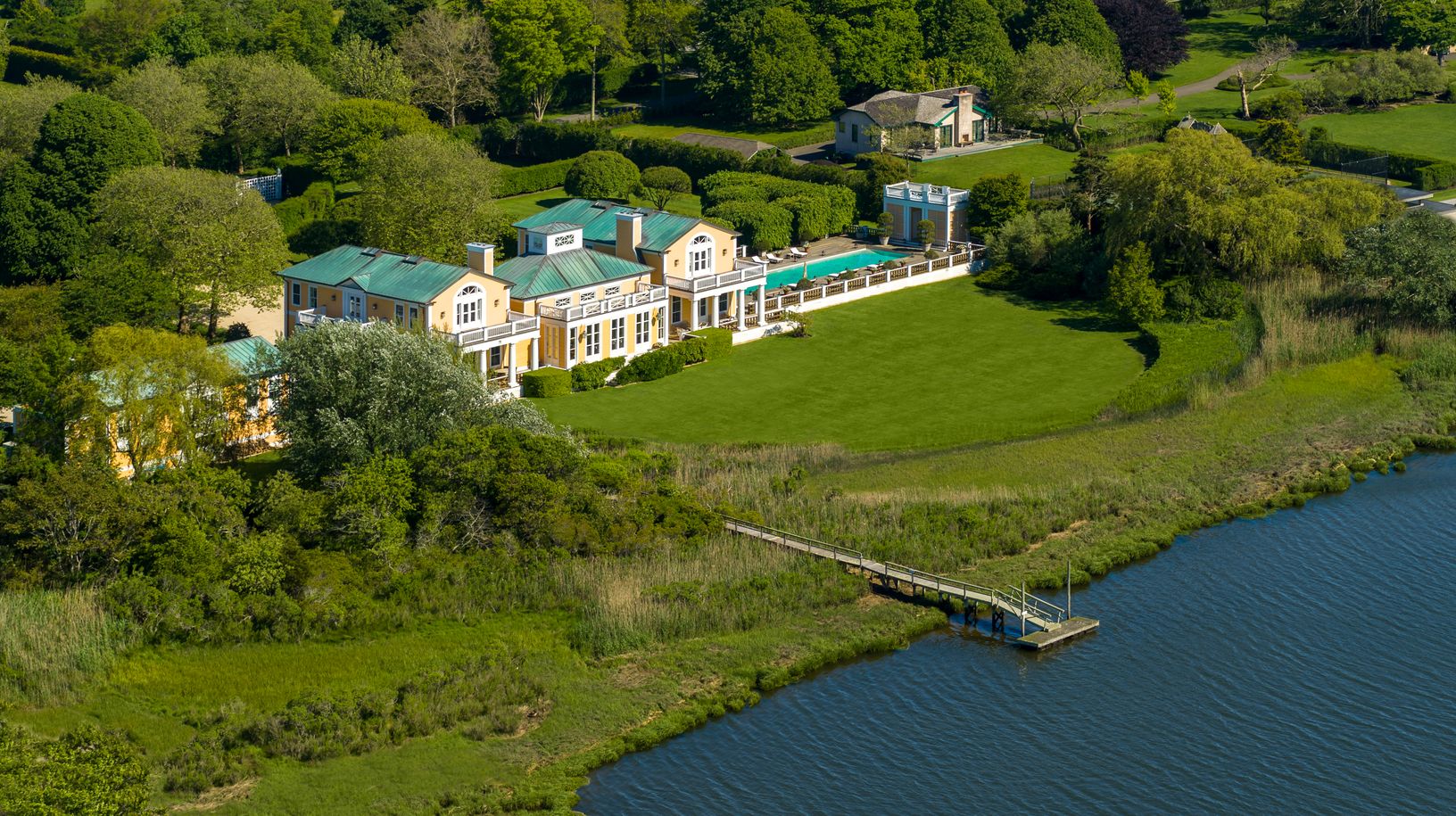 Southampton Village Estate Section: This glorious house was designed by world renowned architect Jaquelin T. Robertson for owners Ahmet and Mica Ertegun in 1990 and positioned on a 5.5 acre west facing parcel with 450 feet of frontage on Taylor Creek including a boat dock. The house of nearly 11,000 square feet is in excellent condition and features grand proportioned rooms with high ceilings throughout. There are ten bedrooms and twelve and a