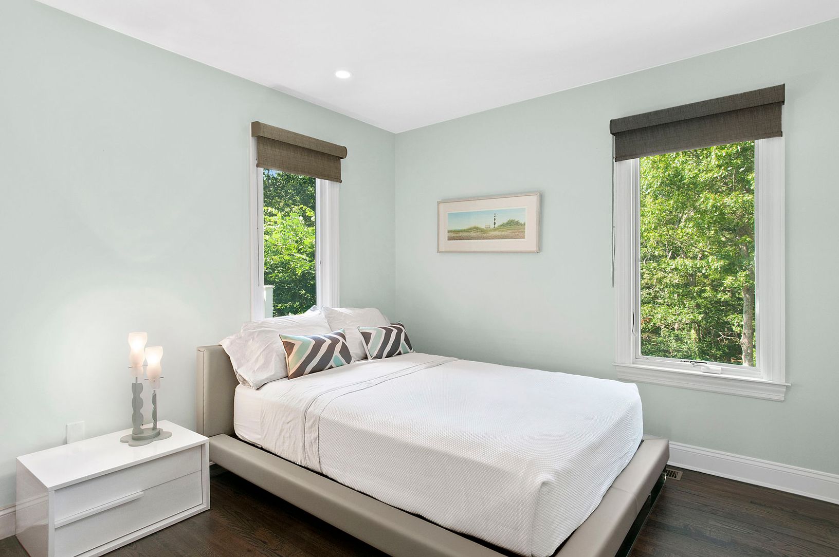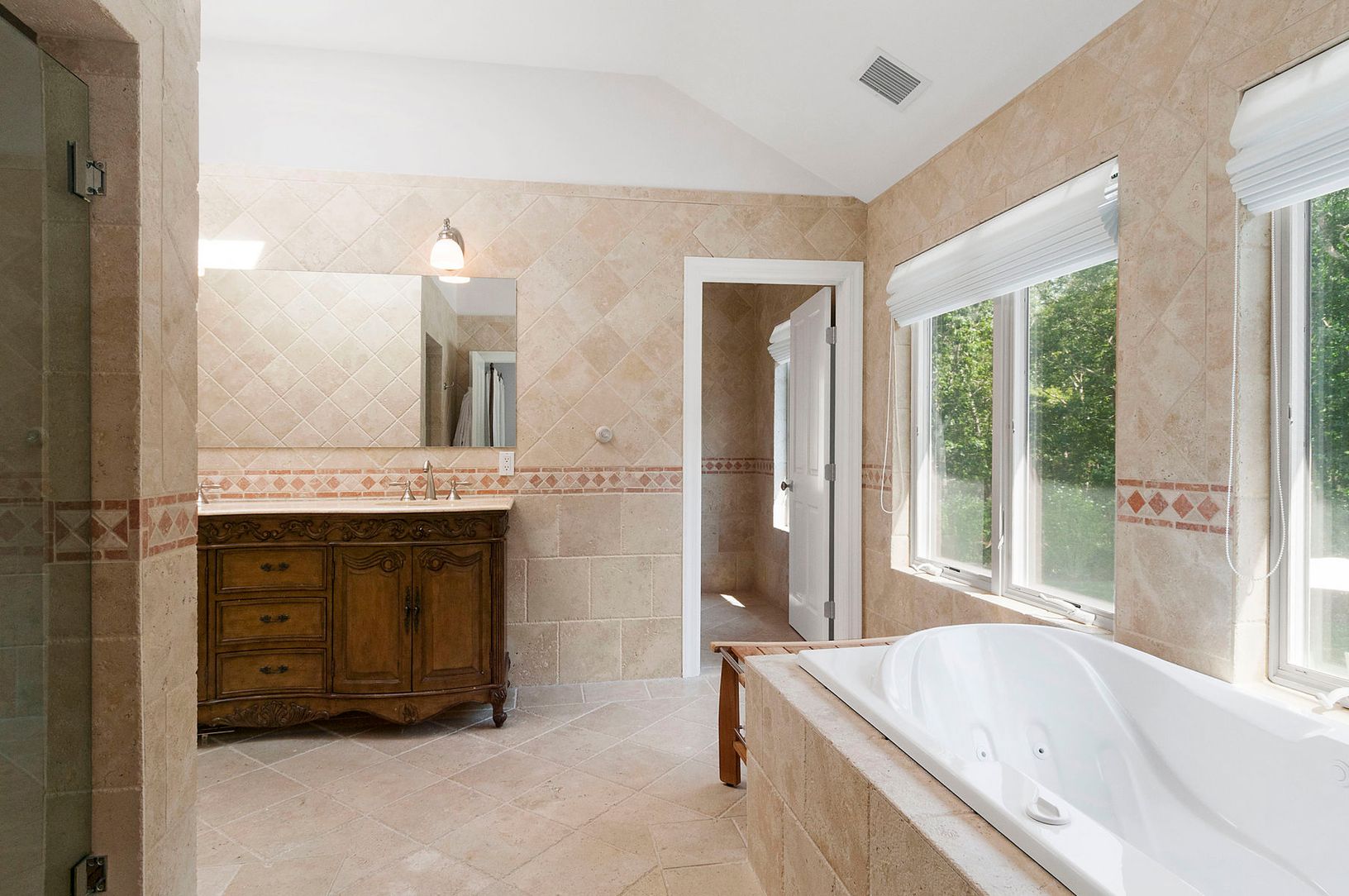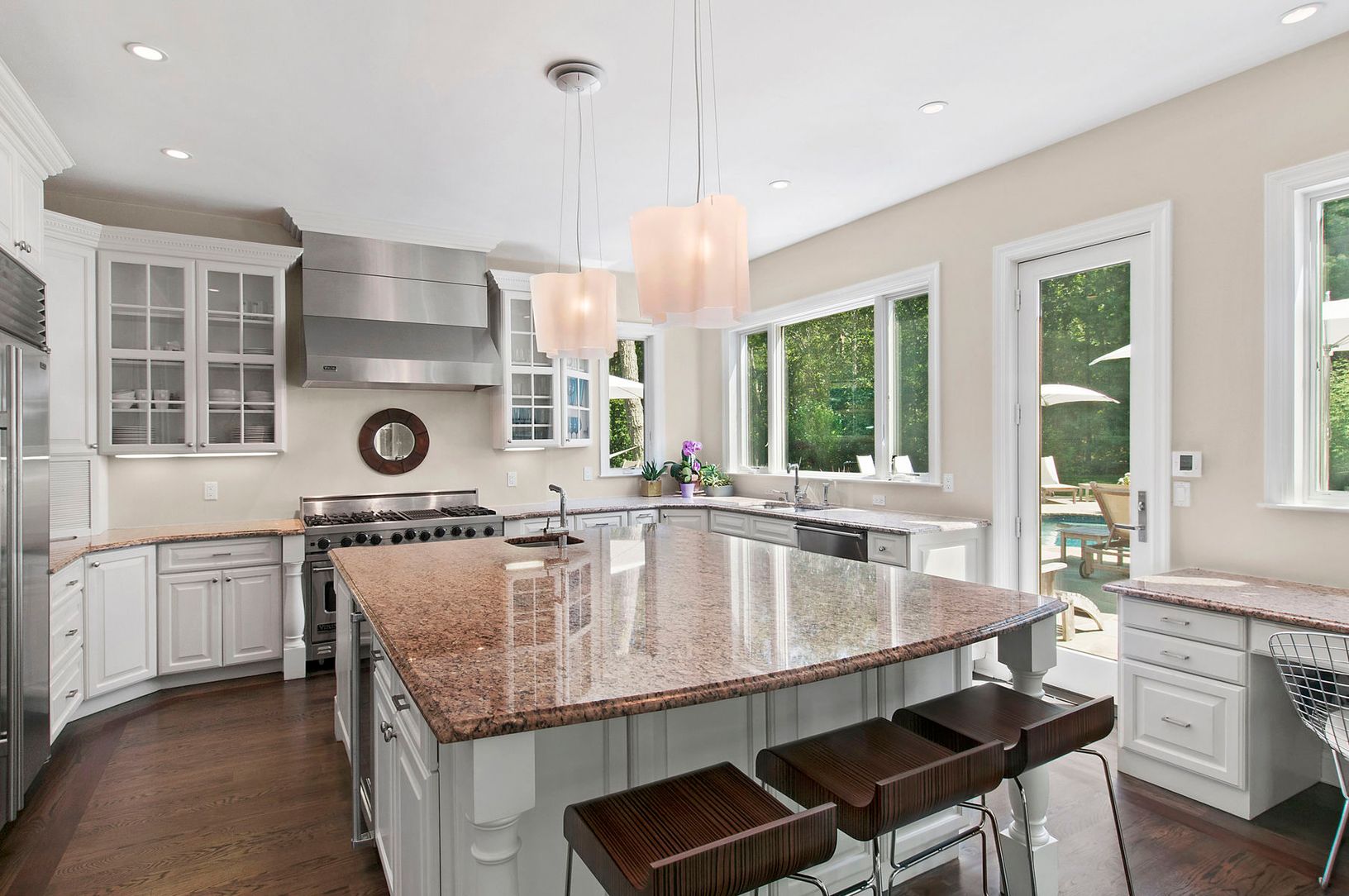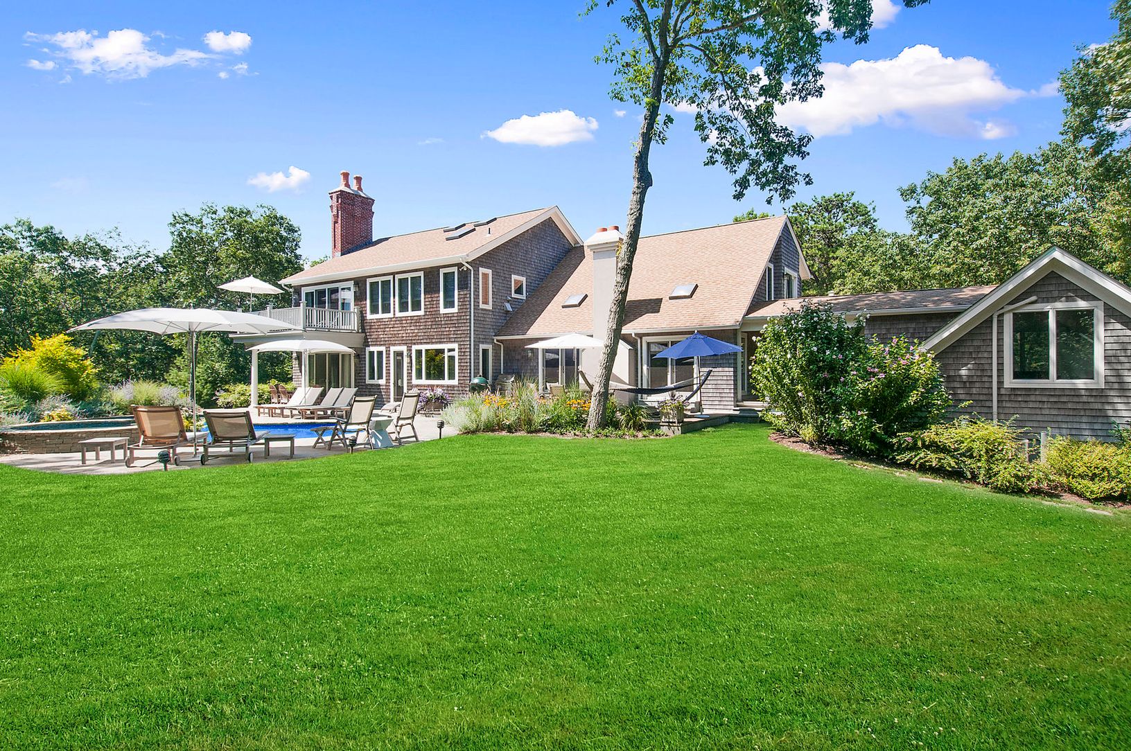 Peace, tranquility and privacy abound at this magnificent renovated East Hampton Estate home. Down a long private gated drive, this 5,000+/- square foot home offers 5 bedrooms all ensuite and 6 and a half baths nestled on 1.4 acres. The chef's kitchen boasts top-of-the-line Viking appliances, two dishwashers, wine fridge, plus a separate beverage center and a large island with granite counter-tops. The property has a saltwater hot tub that flo