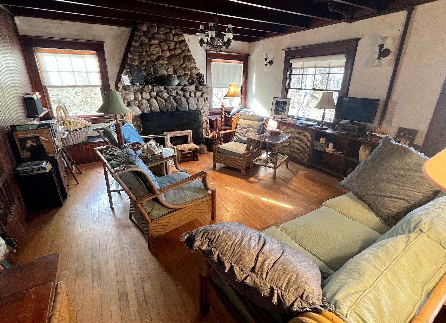 Set way back from the public street and shaded by spectacular specimen trees, "Armaroy-By-The Sound" is a classic circa 1920 Adirondack-style lodge with period details intact situated on 1.3 lush acres with 140' of spectacular Long Island Sound beachfront. With the house set high above the beach and well back from the top of the bluff, it is perfectly protected from wind and flood. On the first floor, the house offers 2 bedrooms 1 1/2 baths, c