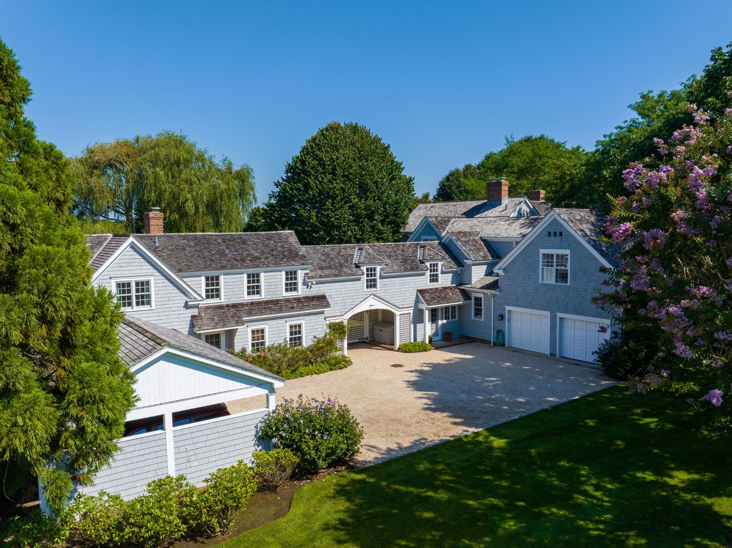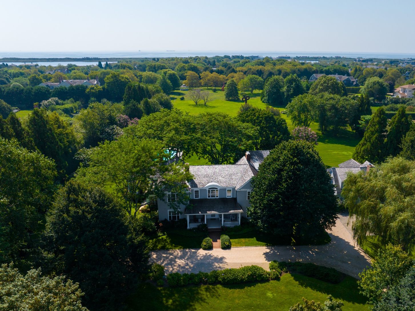 This prestigious and picturesque property on Flying Point Road is what Hampton's dreams are made of. You can enjoy the bay breeze and ocean sounds while taking in the park-like views. This is a rare opportunity to buy one of the most beautiful properties available south of the highway. A traditional, shingle-style residence sits on a 2.34-acre lot with stunning water views. It includes an attached guest house, pool, pool house, and a dock acce