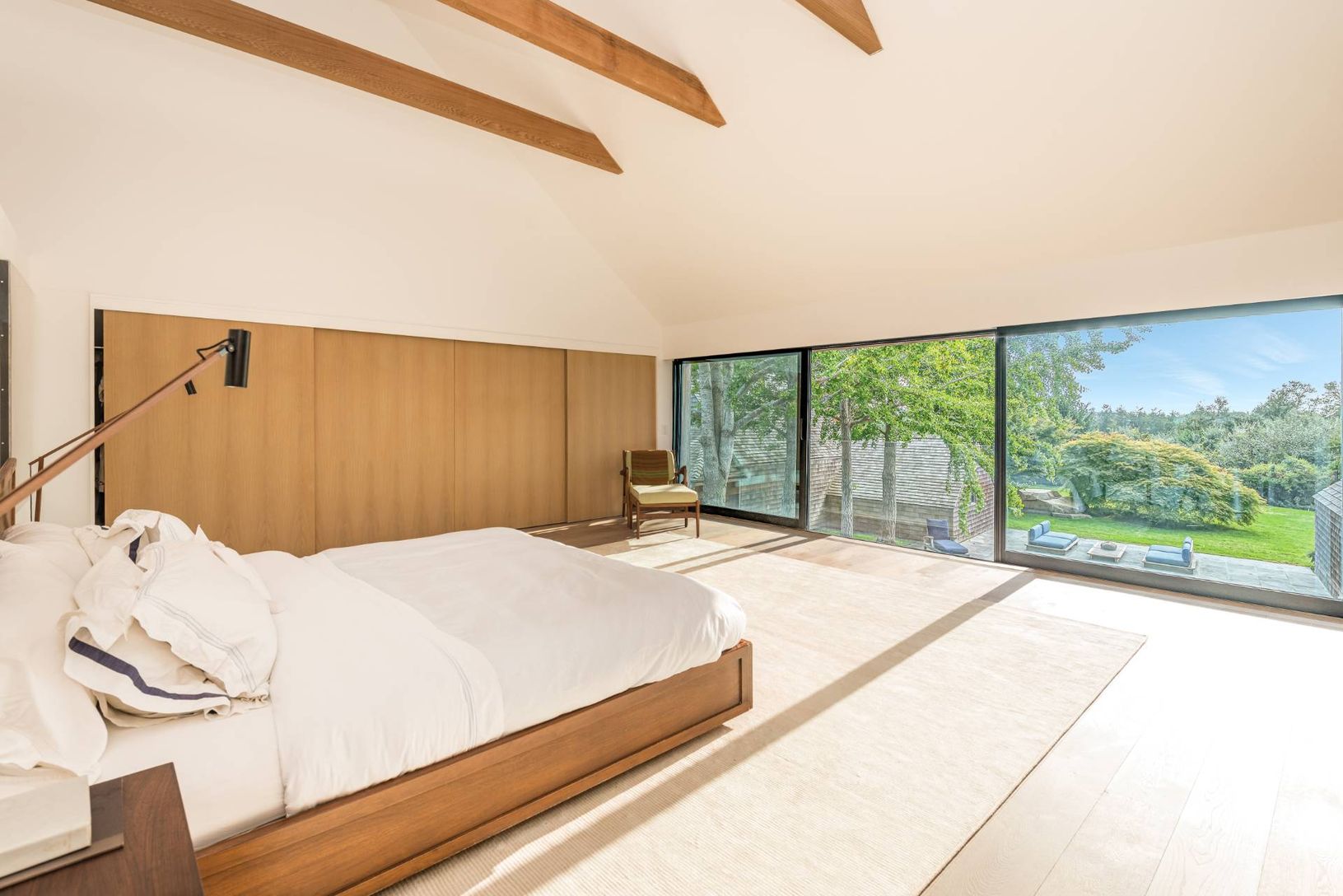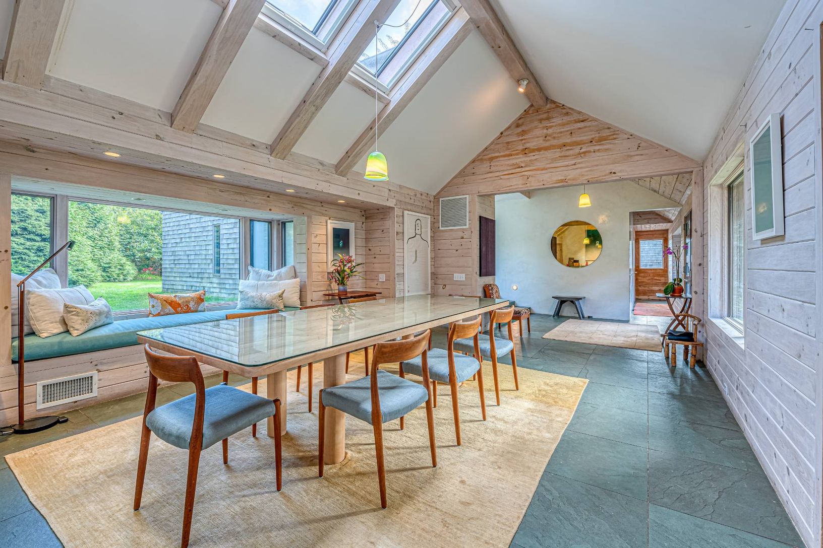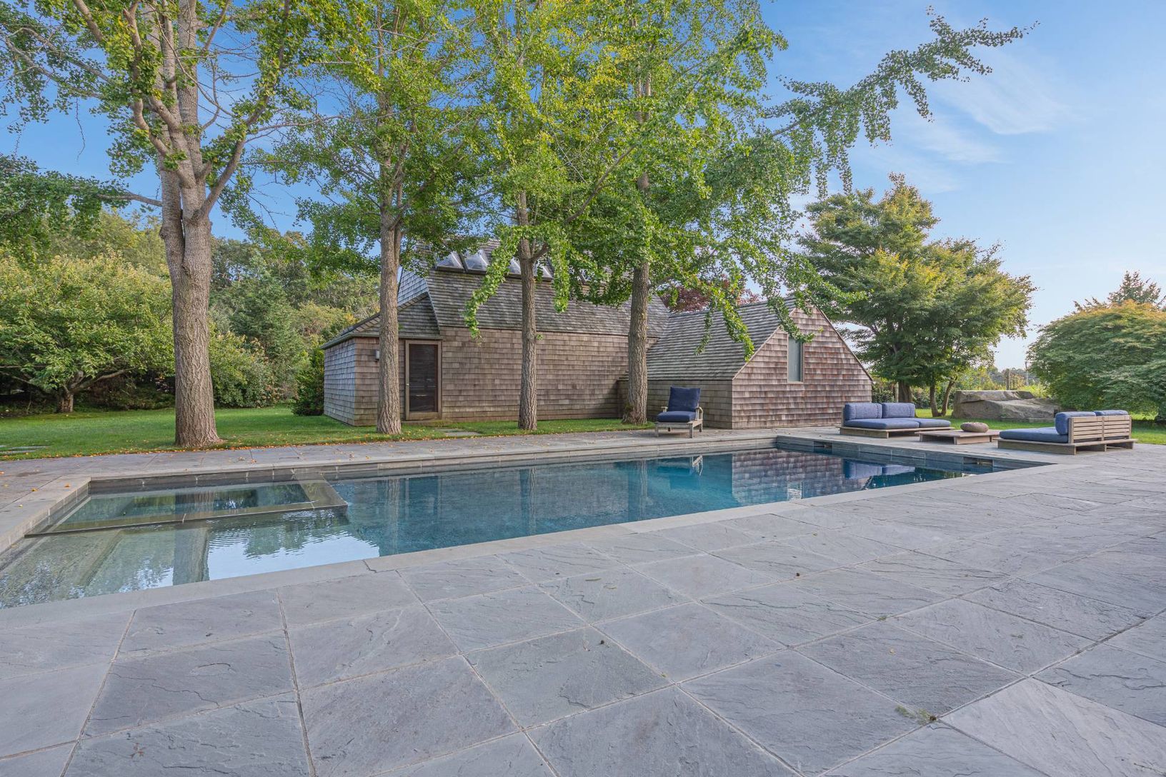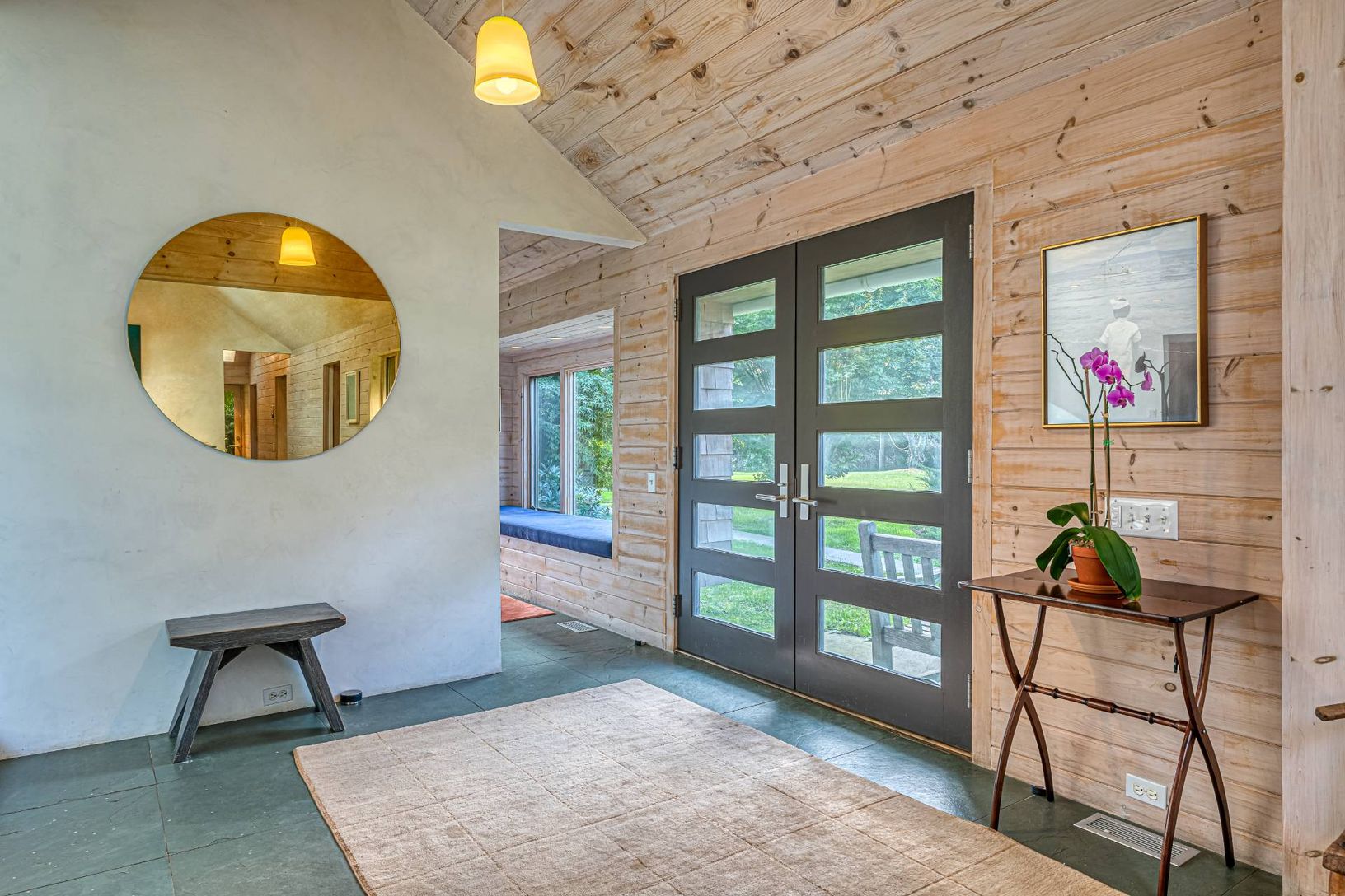 New to the market, enjoy this rare collector's opportunity to own the renovated and restored former home of pioneering architect, Norman Jaffe, situated on a stunning, exceptionally private 1.1-acre, flag lot on Lumber Lane in Bridgehampton. Revel in the signature hallmarks of the Norman Jaffe's famed design aesthetic that defines - to this day -- the modernist era of Hamptons living: strong geometric lines, warm interior finishes including na