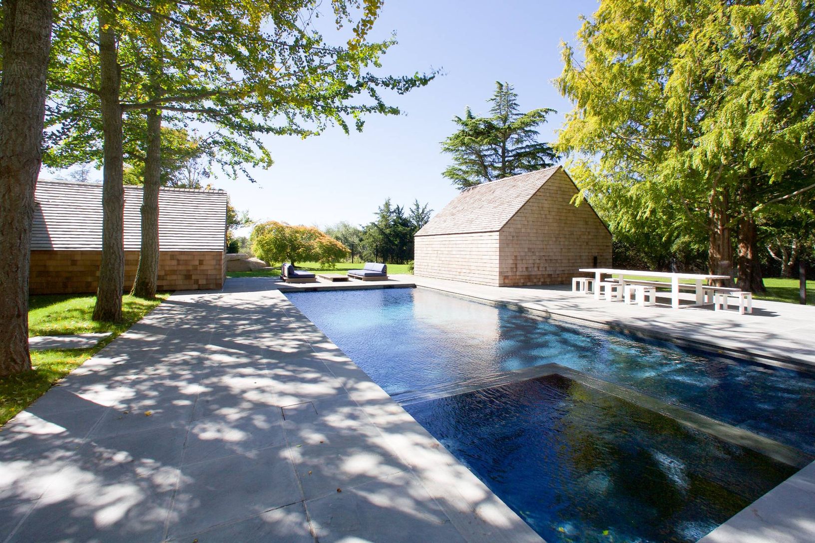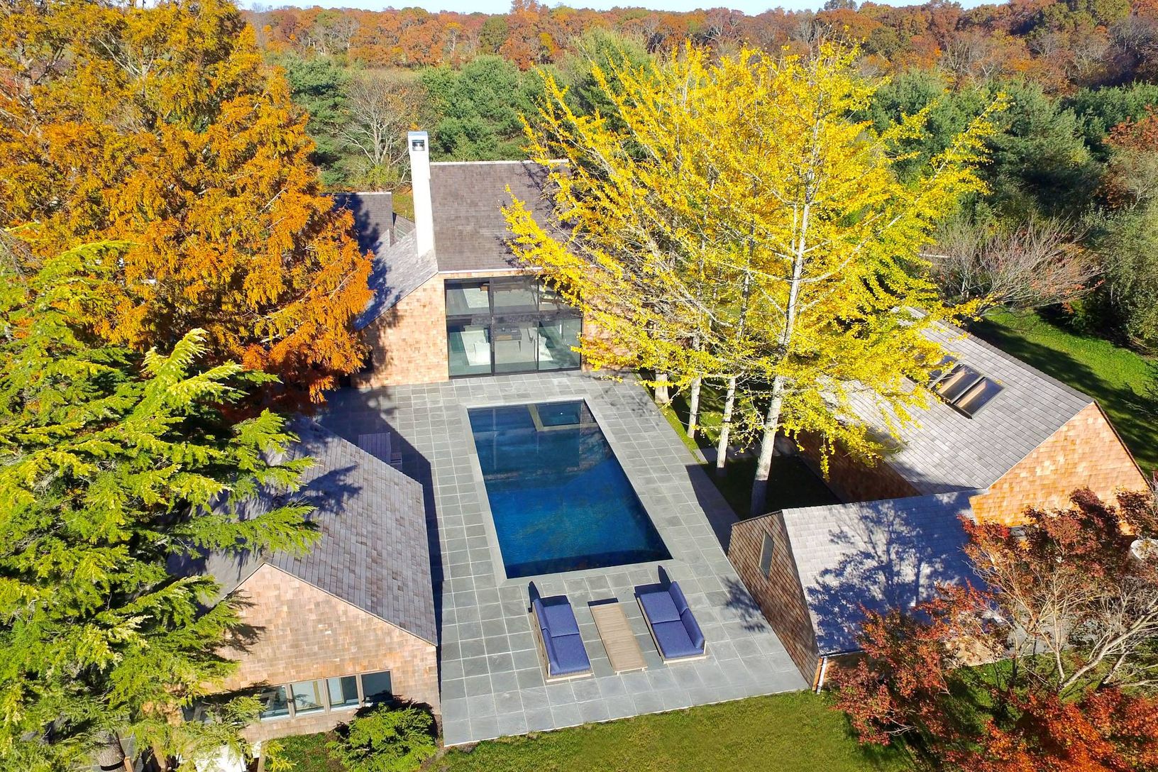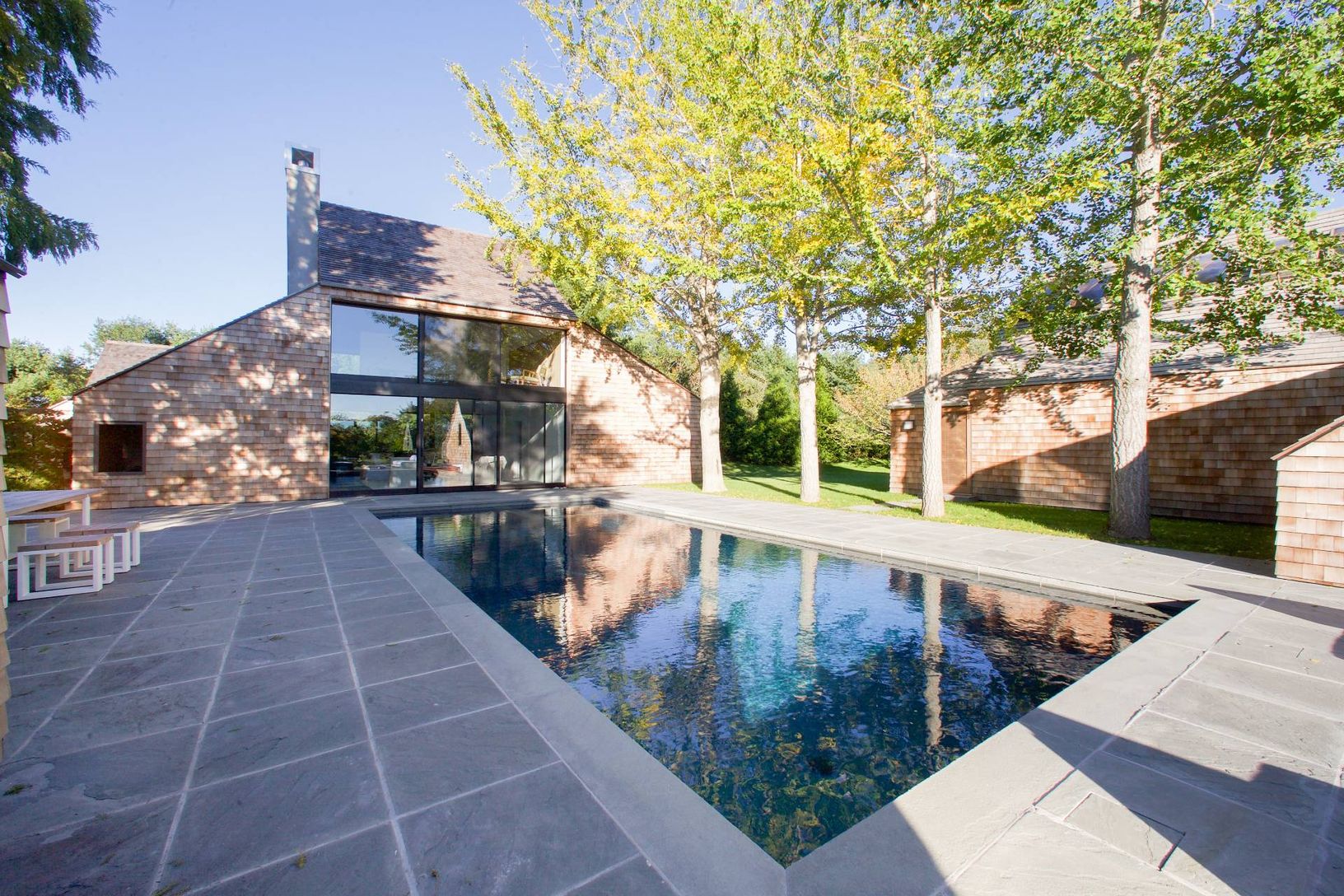 This is a rare opportunity to own the renovated and restored former home of renowned architect, Norman Jaffe, situated on an exceptionally stunning private 1.1-acre, flag lot on Lumber Lane in Bridgehampton. Innovative for his use of natural materials and passive solar forms of design, and urban design, the aesthetic remains true to Norman Jaffe's famed rustic modern beach house. The main house features wood plank walls and ceilings and flame-