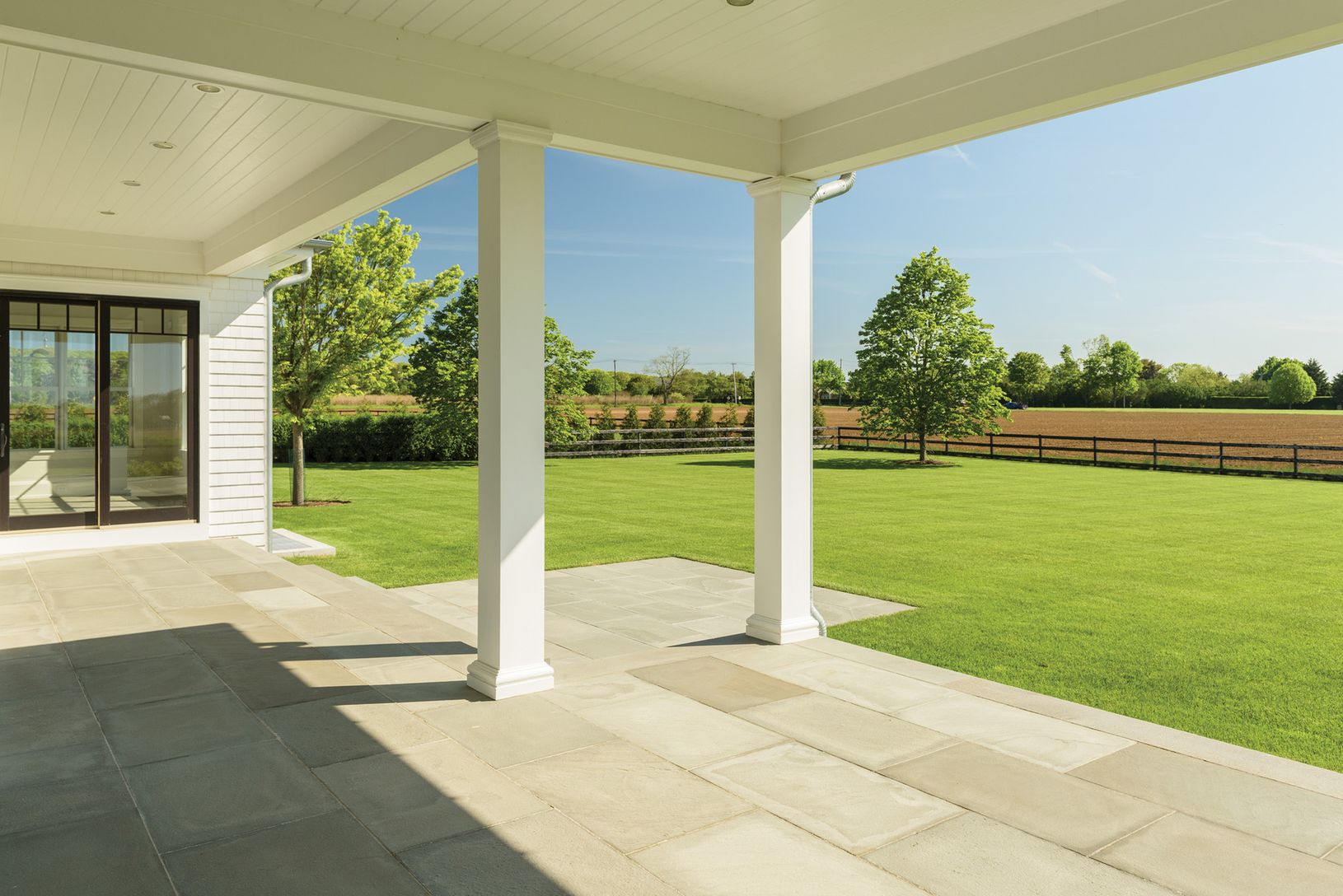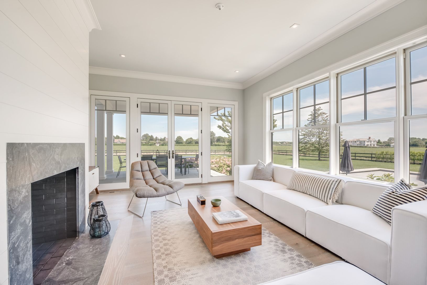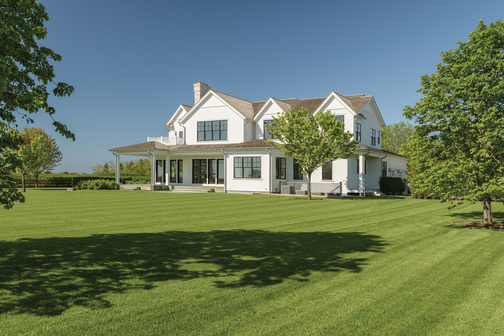 Located just outside Southampton Village overlooking 50+/- acres of farm field reserve, this 5,400+/- sq. ft. new construction home (plus finished lower level), by highly regarded Cardel Development on 1.6 acres has six bedrooms, all en suite, seven full and two half baths. The new home has sweeping vistas of fields and sky from its 750+/- sq. ft. of covered porches and light-filled interiors. A grand entry foyer sets the tone. Ideal for enter