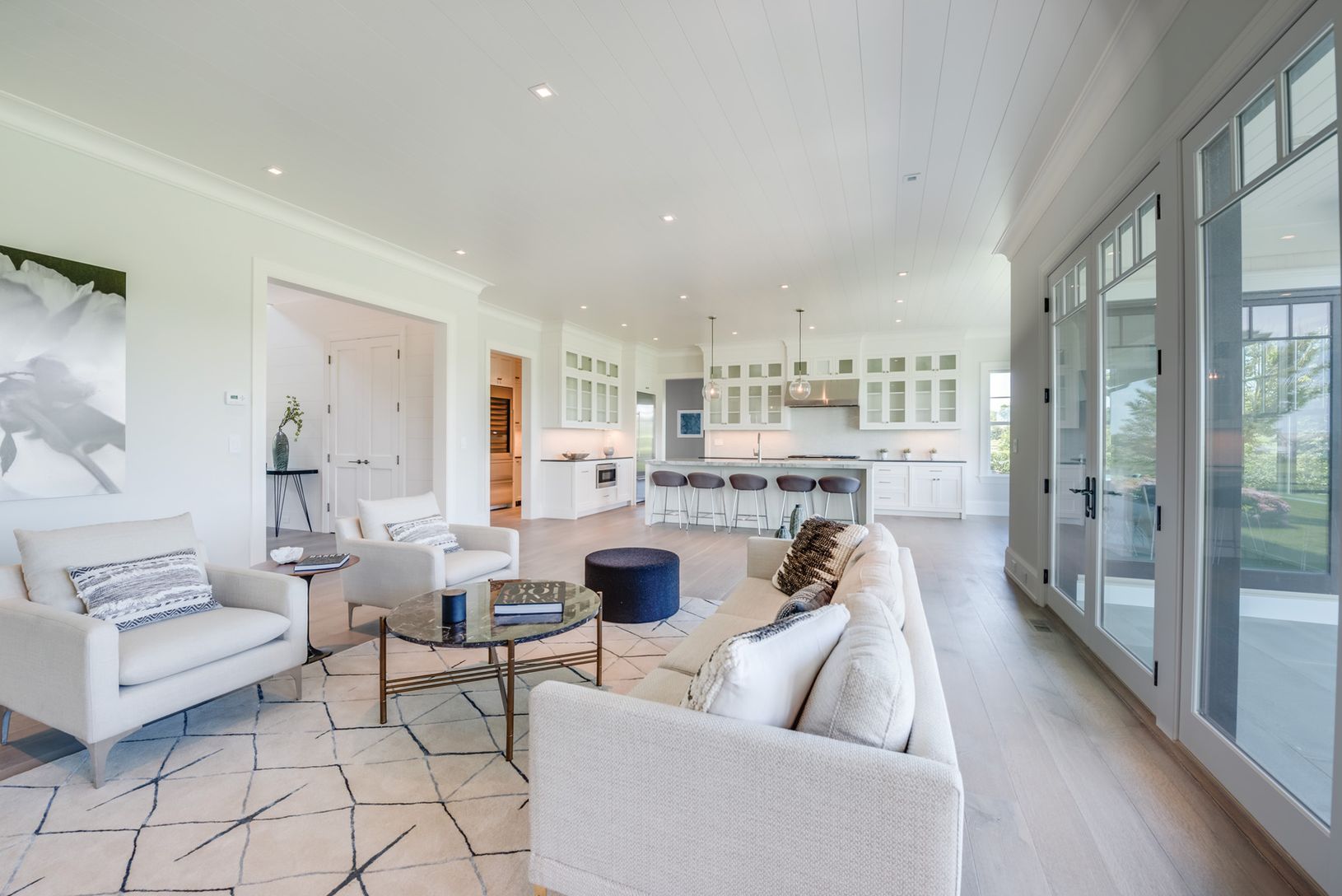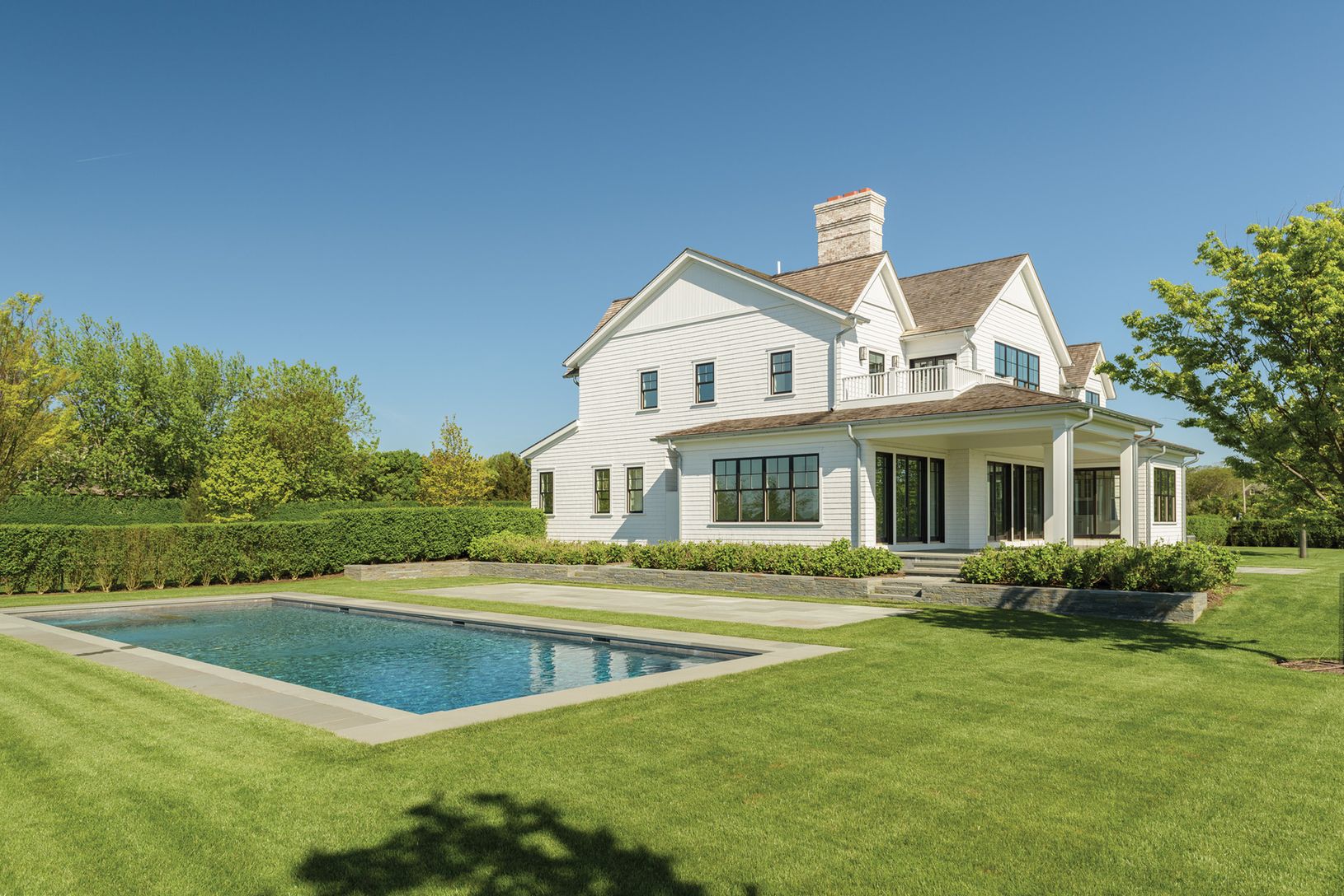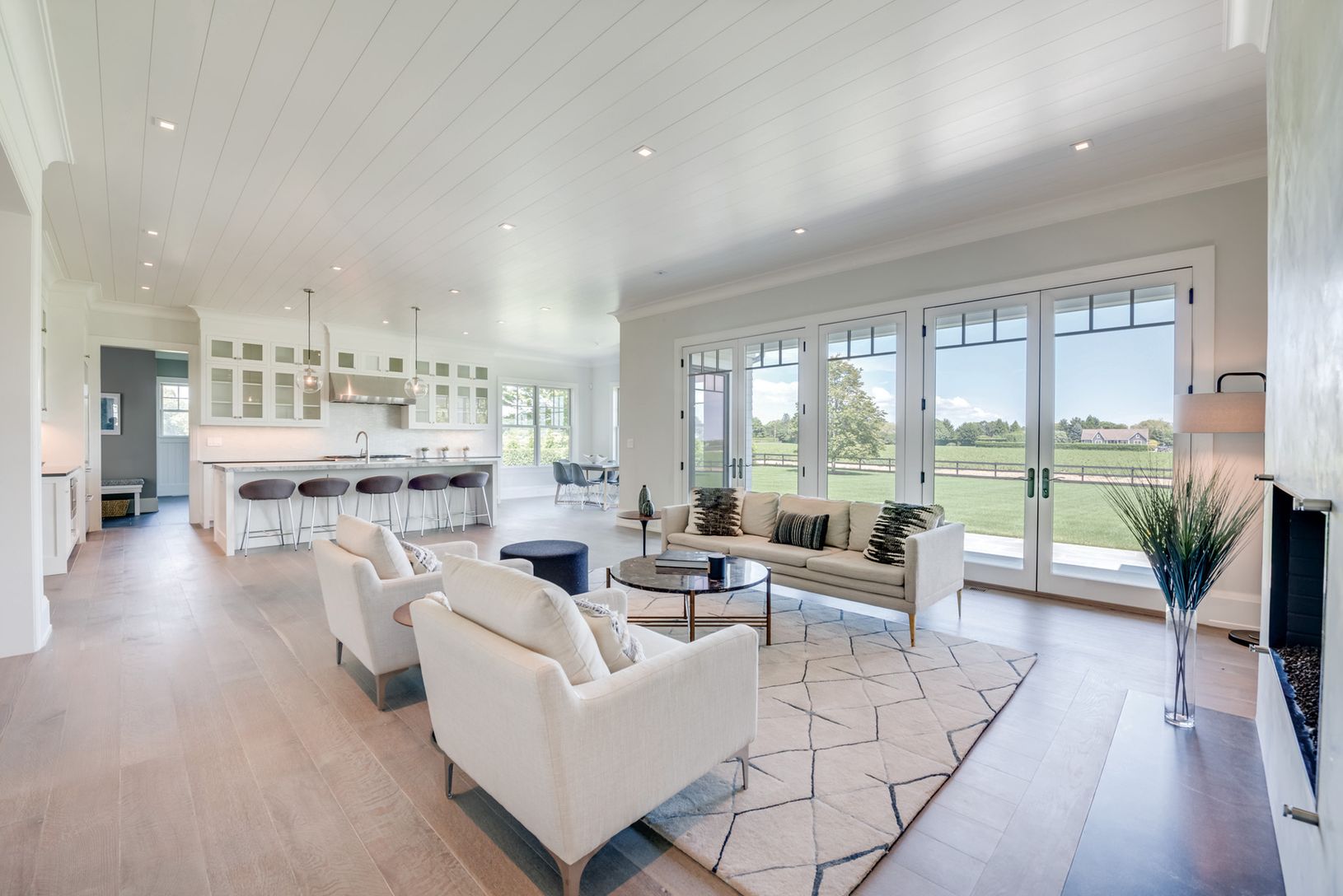 Located just outside Southampton Village overlooking 50+/- acres of farm field reserve, this 5,400+/- sq. ft. new construction home (plus finished lower level), by highly regarded Cardel Development on 1.6 acres has six bedrooms, all en suite, seven full and two half baths. The new home has sweeping vistas of fields and sky from its 750+/- sq. ft. of covered porches and light-filled interiors. A grand entry foyer sets the tone. Ideal for enter