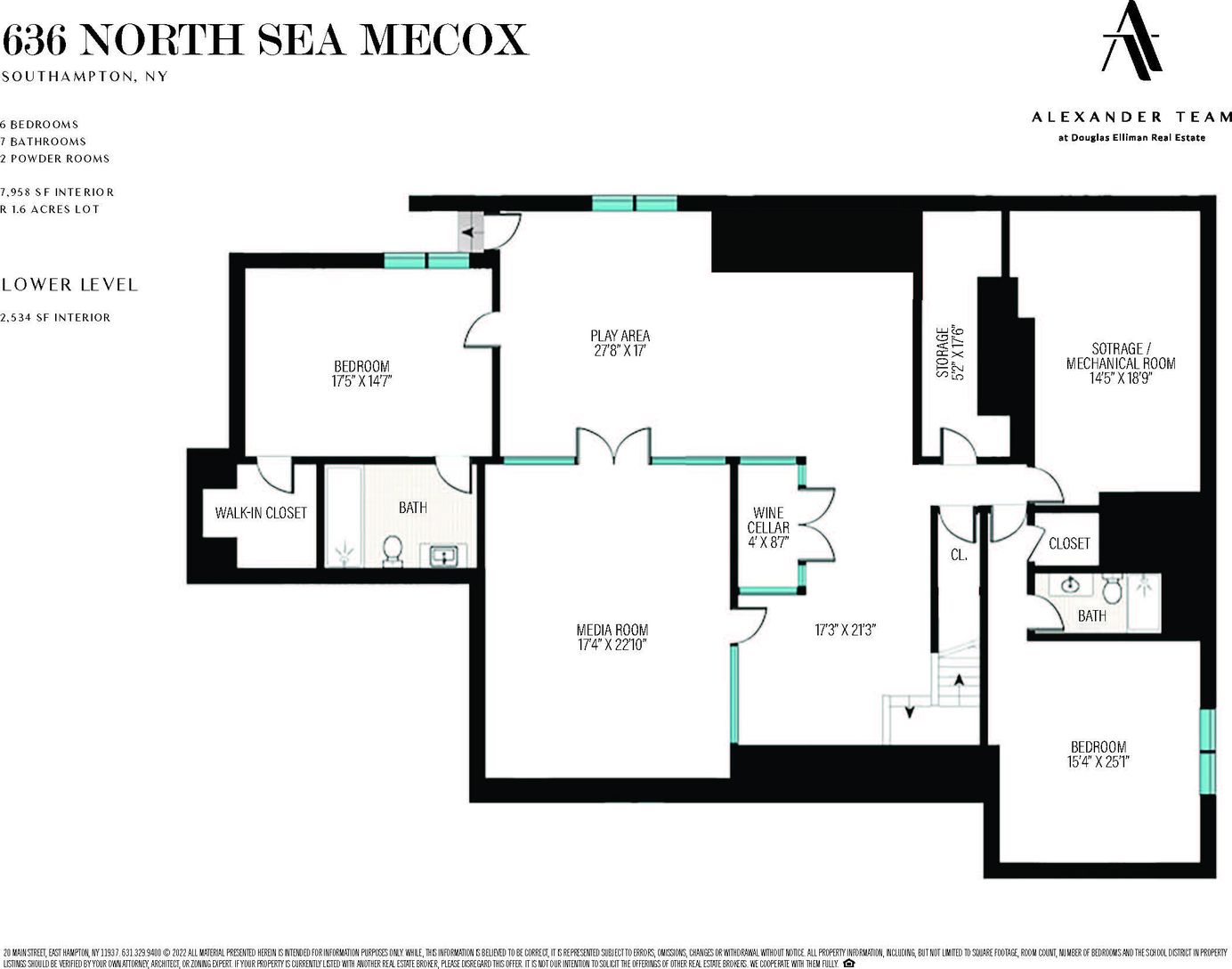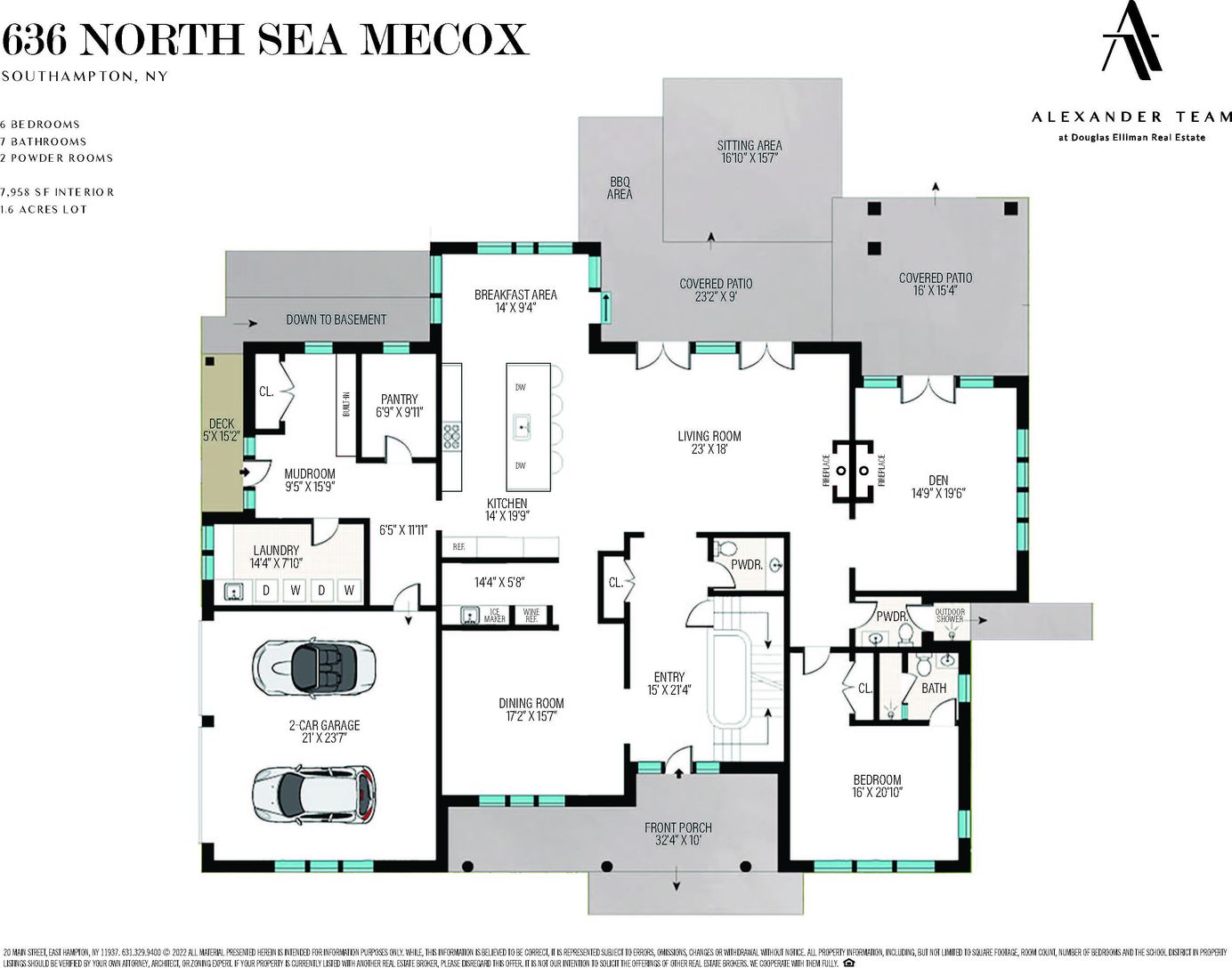 636 North Sea Mecox is a stunning 7,500 sf custom-built home sitting on 1.6+/- pristine landscaped acres surrounded by 50+/- acres of protected agricultural reserve. Ideally located close to Southampton Village and only five minutes from Flying point and all Southampton Village beaches. The post-modern home on 3 levels includes seven bedrooms, seven full bathrooms (two half baths) and a finished lower level. The entire home boasts exceptional