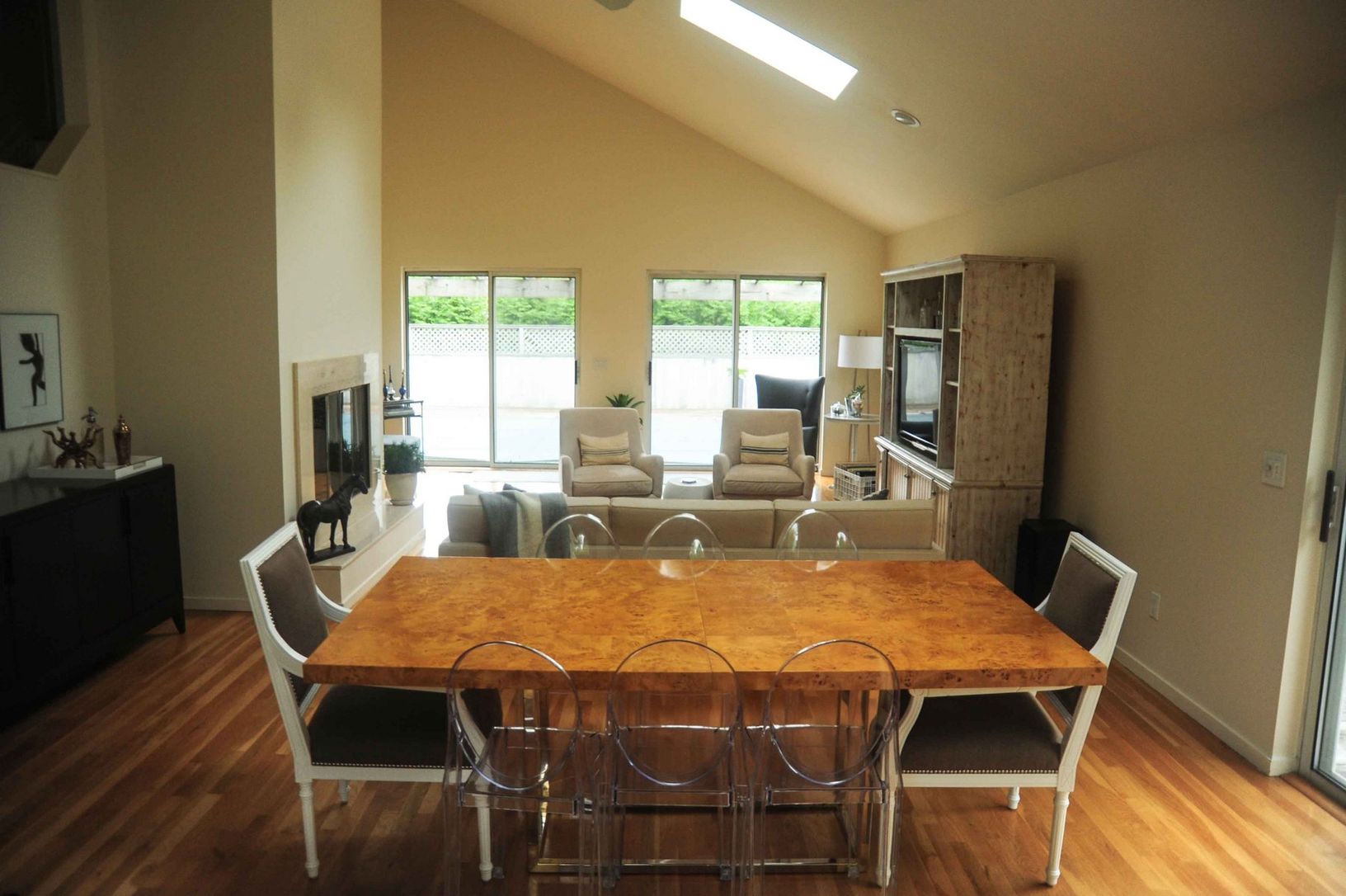 Two guest bedrooms, cathedral living/dining area with walls of glass that