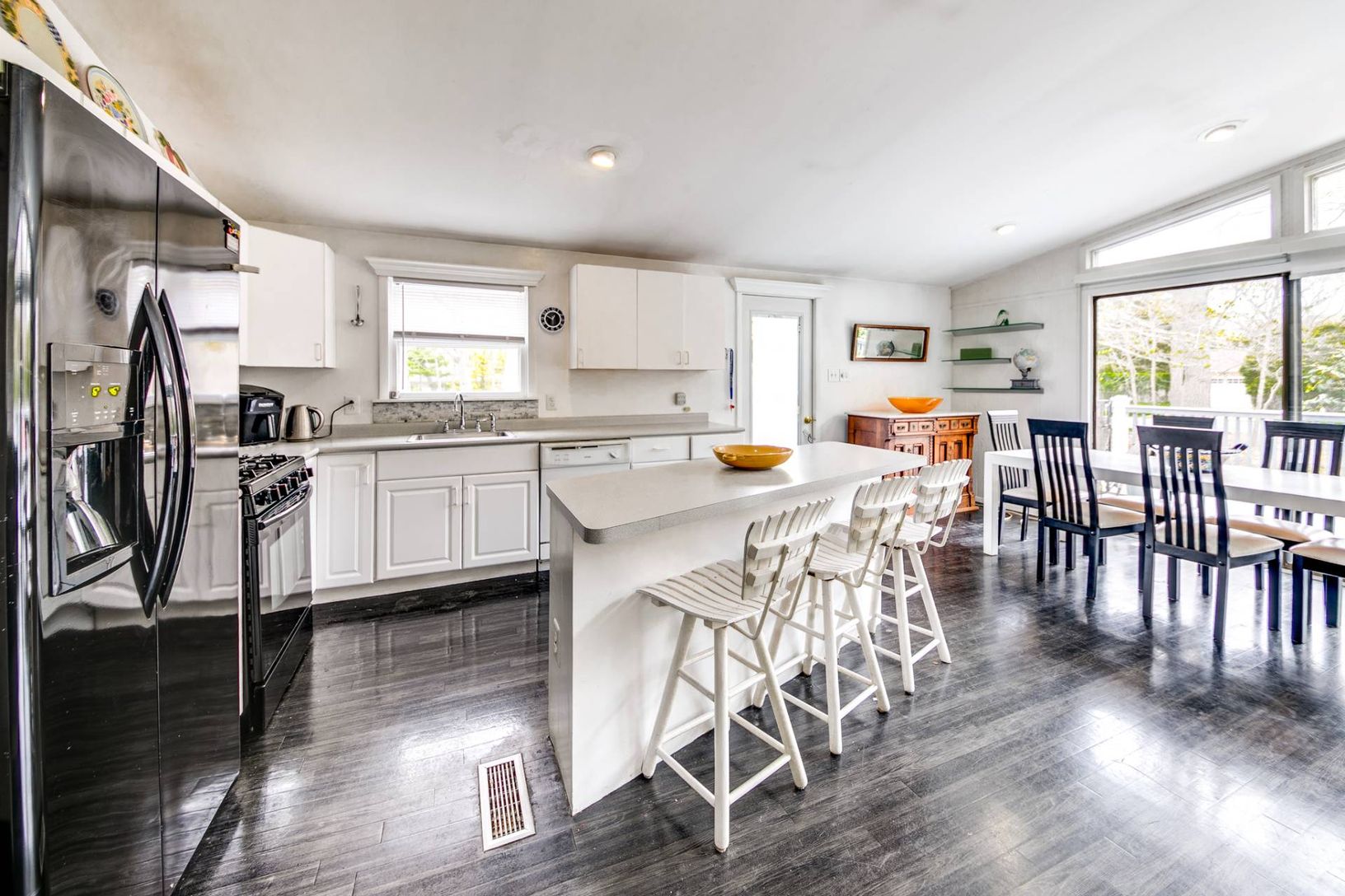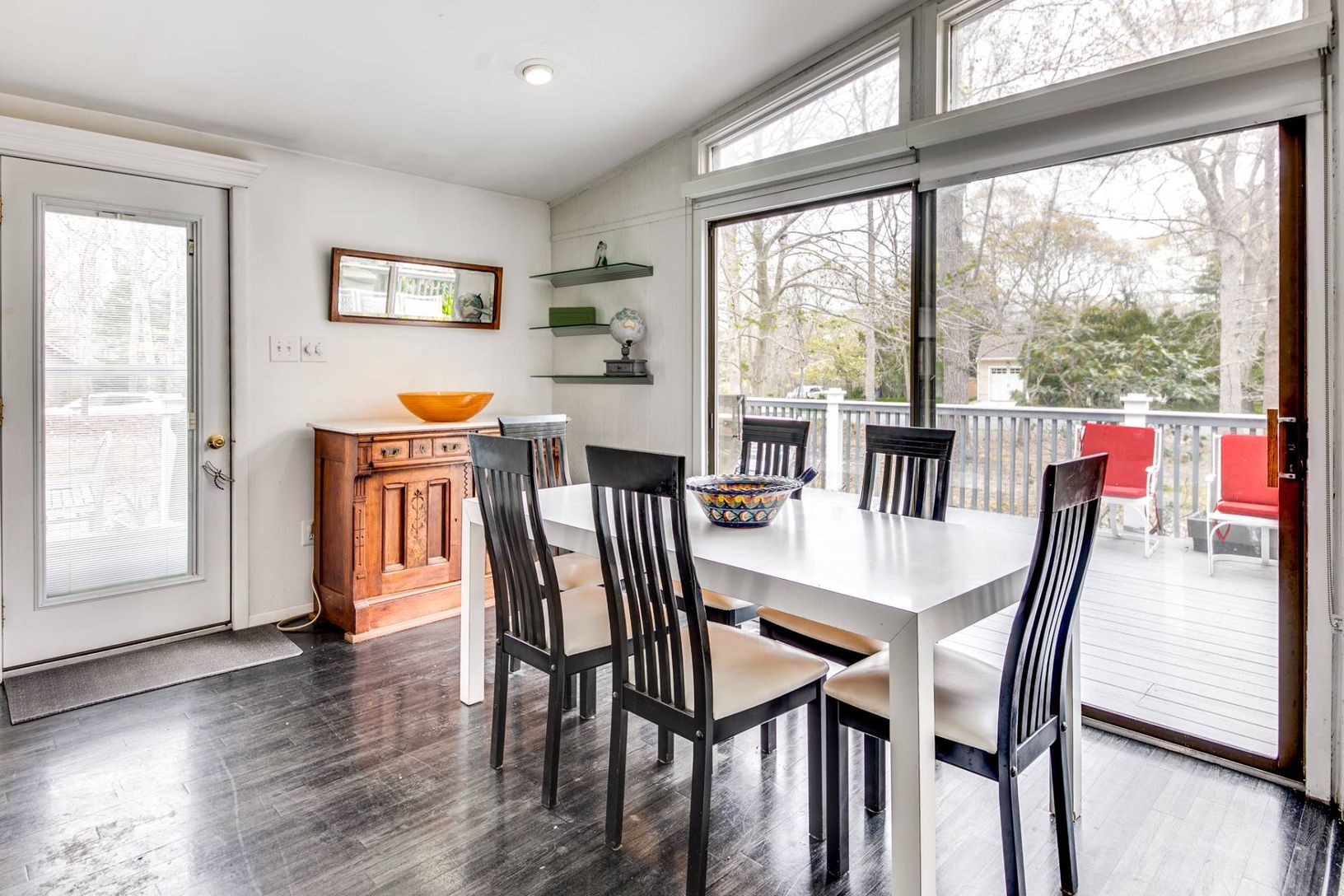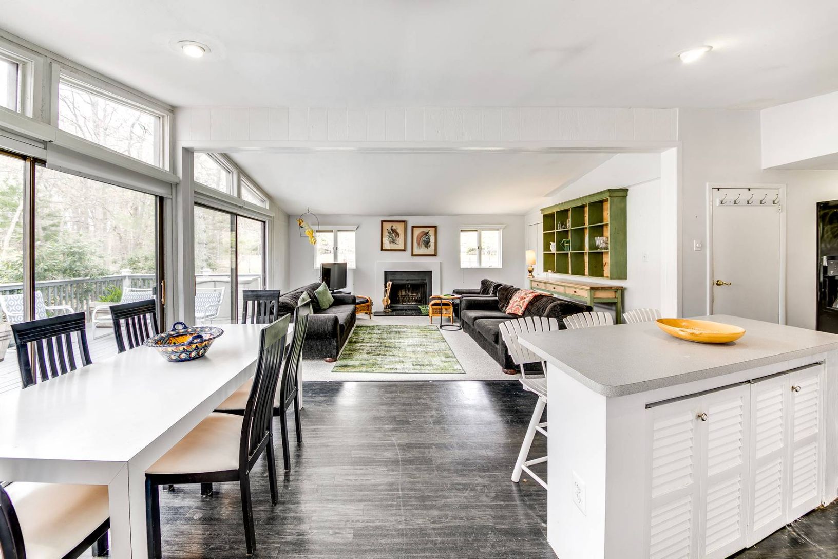 Welcome to this fully furnished & charming three-bedroom, two-bath home nestled on a half-acre property in the heart of Springs, East Hampton. With approximately 1,200 square feet of living space, this residence offers a clean, open kitchen layout featuring stainless steel appliances, living room with wood burning fireplace with natural light from three sides. The property includes access to an unfinished basement, ideal for storage or as