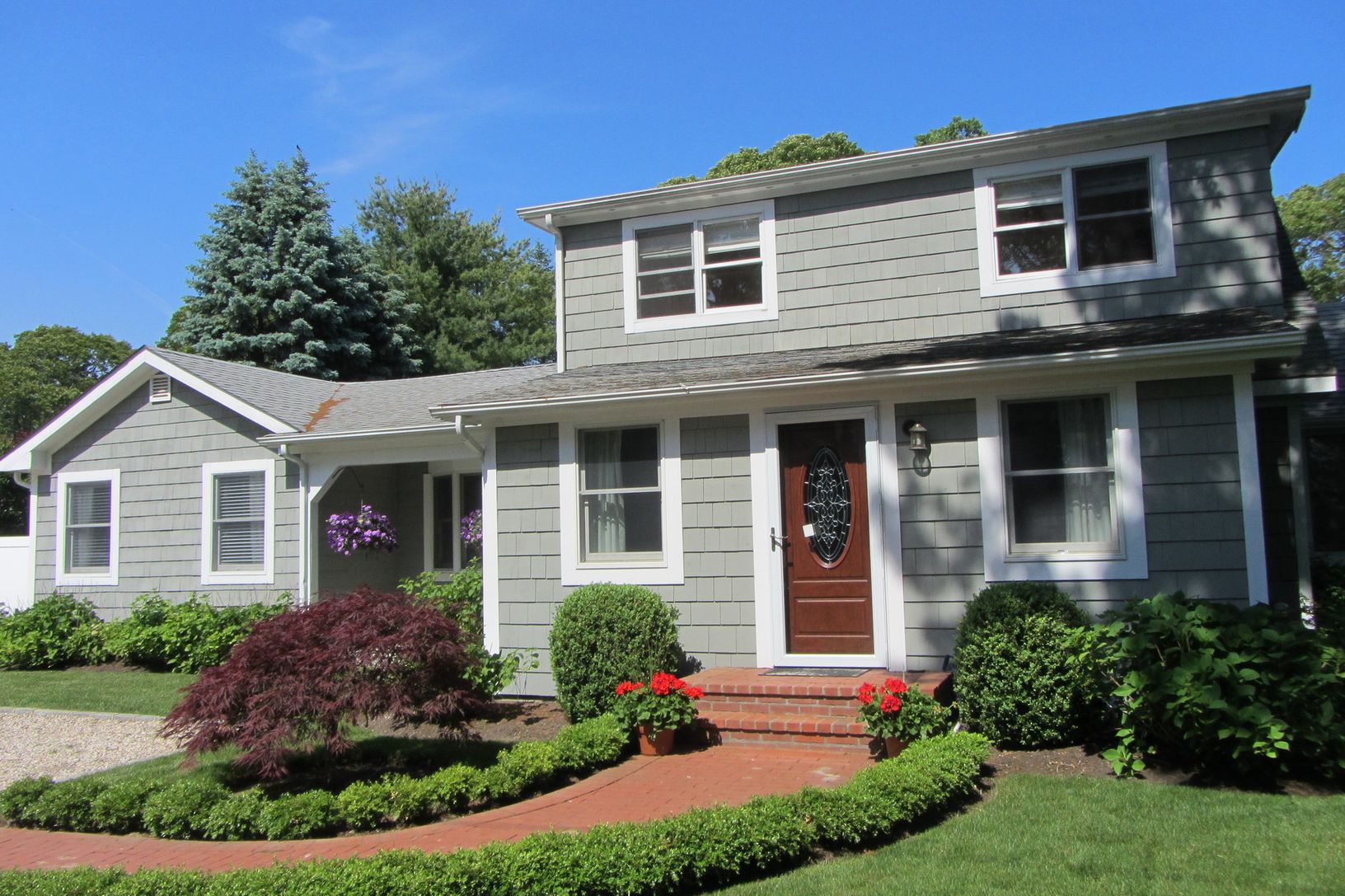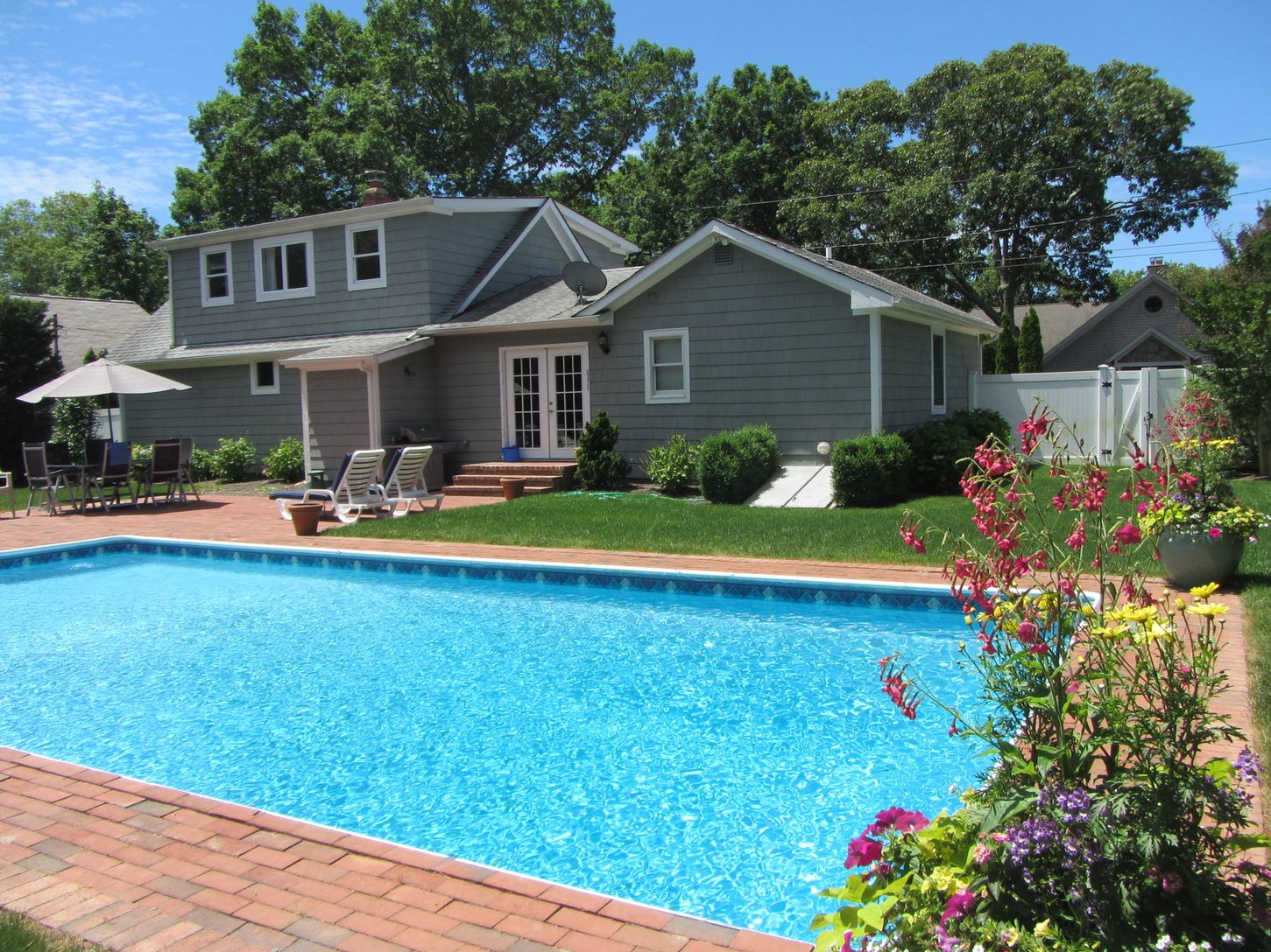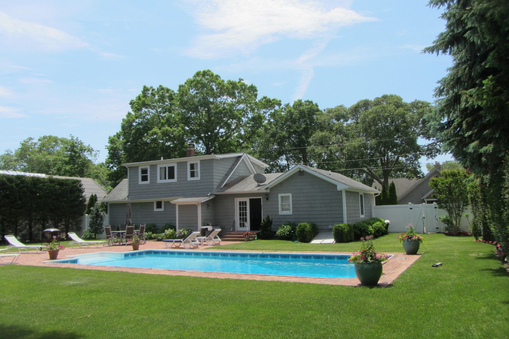 Aquebogue: Hamptons Style weekend home with bayview from front lawn; inground swimming pool and poolhouse... Main residence features fine craftsmanship and attention to detail. LR, EIK, DR, MBR suite w/bath, additional bedroom and bath - upstairs, 2 bedrooms with jack'n'jill en suite full bath. Full basement with laundry. Spacious yard and fully fenced in garden surrounding sumptuous pool. Bay Beach just around the corner - sublime settin