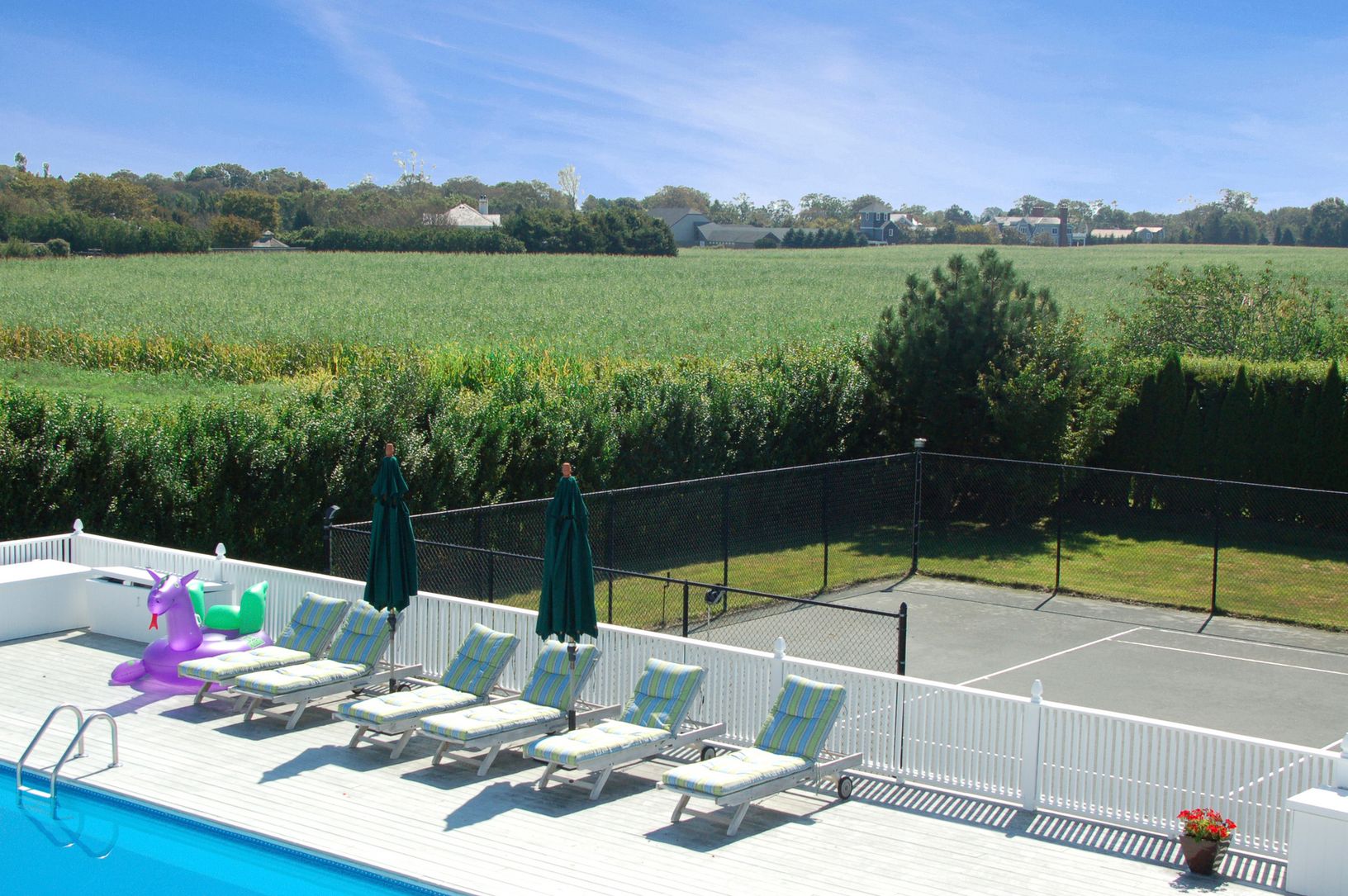 This private contemporary retreat in Water Mill South, enjoys a fully hedged, gated property with protected reserve farm field views. Luxurious essentials include five bedrooms and six baths, a private master suite with private teak deck, master bath with steam shower, air jet tub, and beautiful vanity area. An oversized living room with fireplace flows into the dining room.. Contemporary Italian kitchen with subzero refrigerator, Viking pro