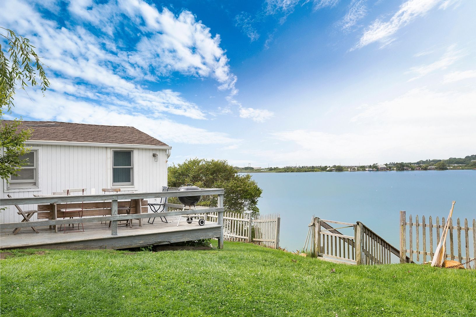 There is direct access to the lake, with steps leading to the water where you can kayak, swim, paddle board or take a canoe across
