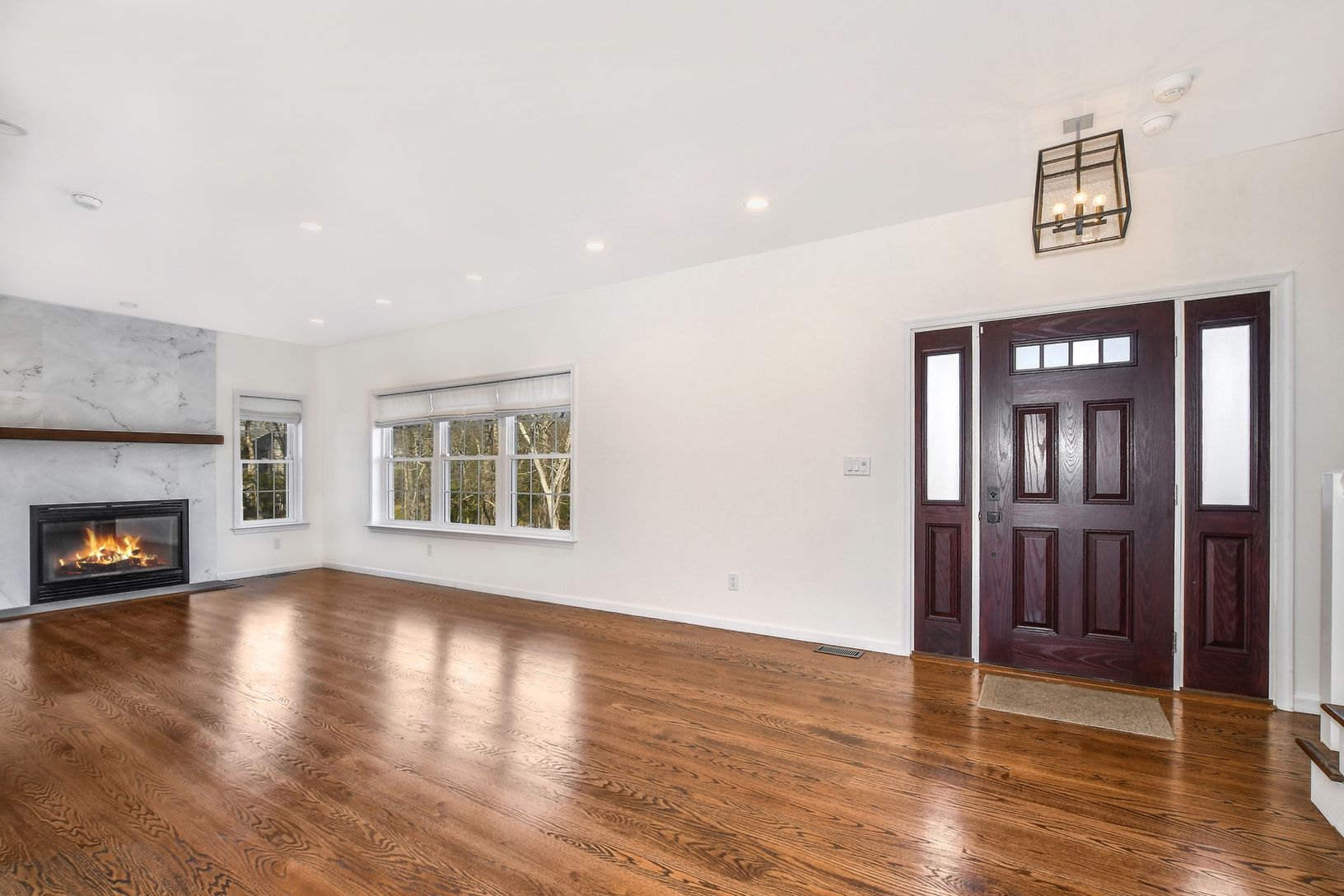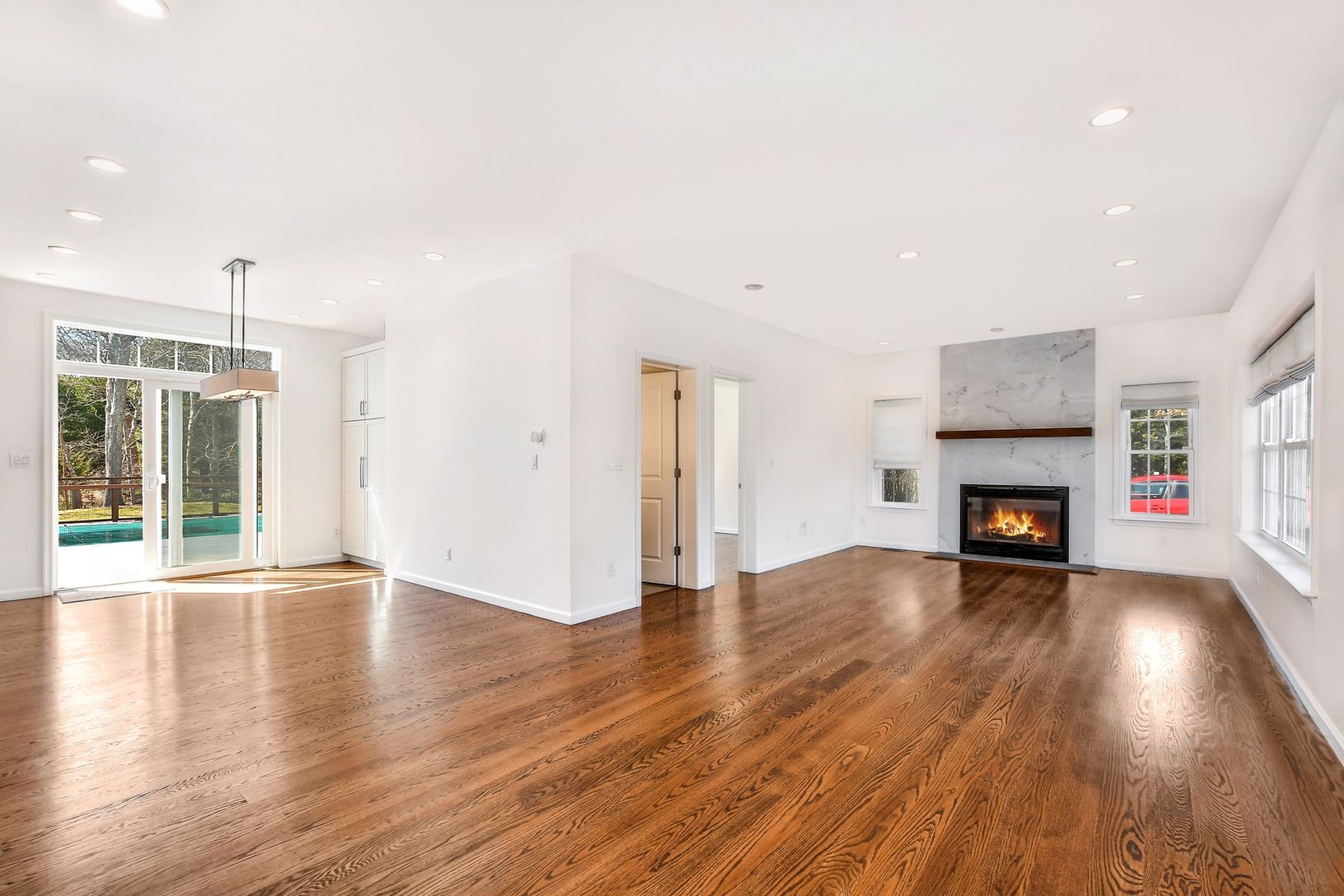 The living room, with marble wood burning fireplace, flows seamlessly into the cook's kitchen offering stainless steel appliances, shaker cabinets, granite counter tops an