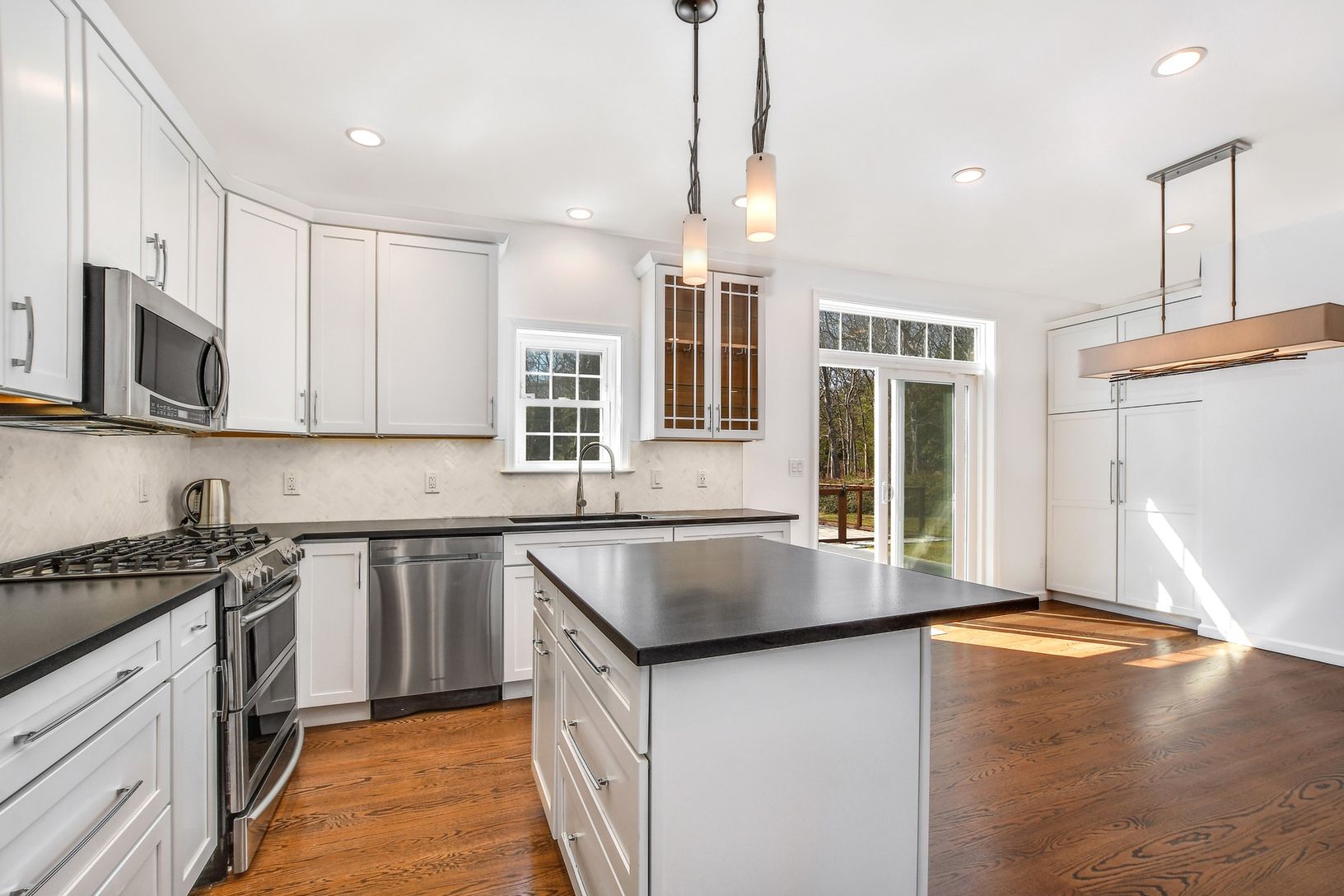 A newly constructed residence, poised comfortably on an elevated acre close to Sammy's bay beach and Three Mile Harbor, in East Hampton's nearby Northwest. This four-bedroom, four bath home has an open floor plan with oak floors, designer finishes and custom upgrades.
