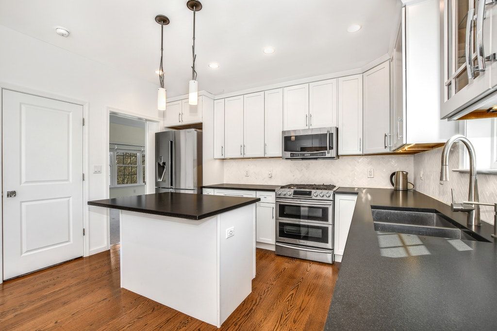 The living room, with marble wood burning fireplace, flows seamlessly into the cook's kitchen offering stainless steel appliances, shaker cabinets, granite counter tops an