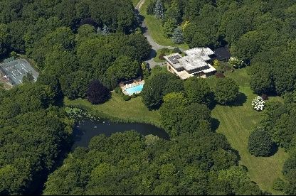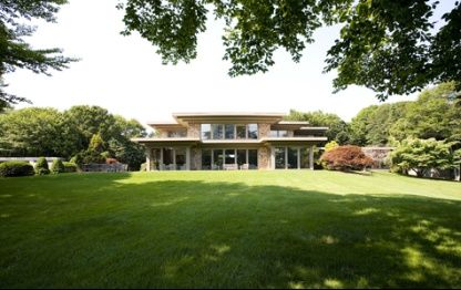 This truly unique, exquisite Frank Lloyd Wright inspired 10,000 +/- sq.ft. modern residence constructed of stone and cedar with floor to ceiling windows offering spectacular views over sprawling lawns and specimen trees as well as over a one acre pond filled with Koi. The elegant gunite swimming pool and pool house and the Har-tru tennis court are sited tastefully away from the view. The double height interior is light filled and from eve
