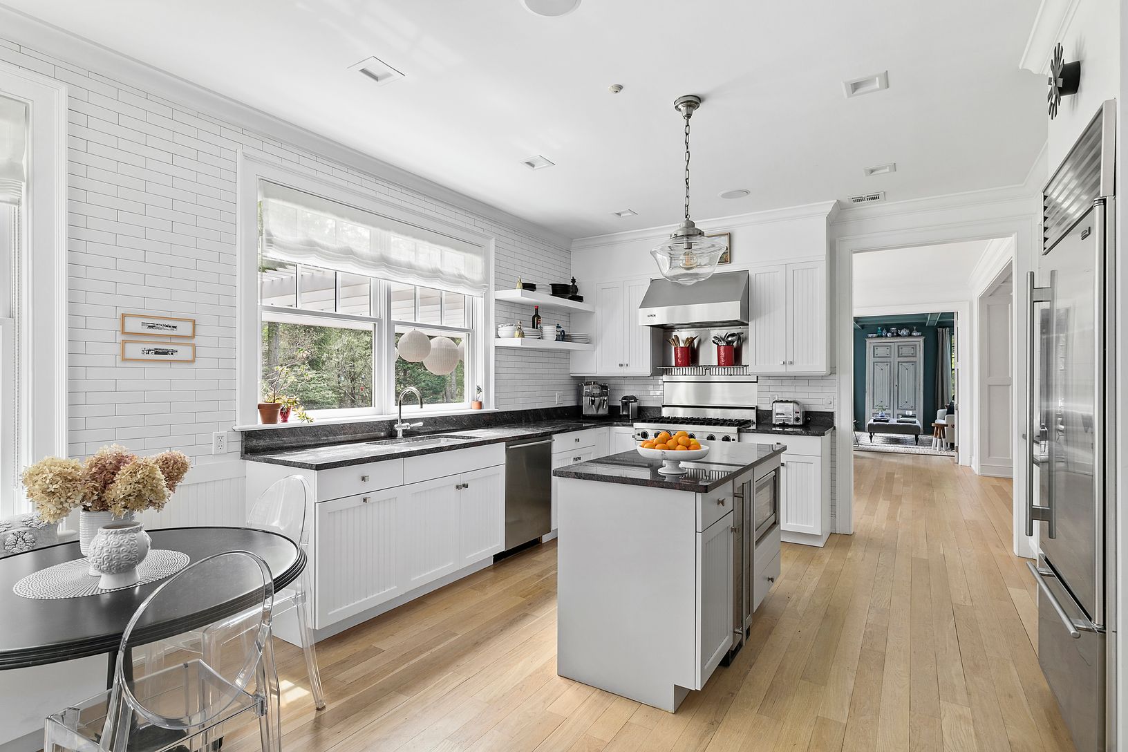 As you pass through the entry gate to this one-of-a-kind property you are greeted by this classic yet chic Hampton traditional. Expertly designed by Larry Kane, this 5-bedroom home is sited on 2 rolling acres and offers the best value on the market today. The entry leads you to the open floor plan that flows seamlessly from room to room and beyond to the outdoor oasis. A gracious living room centered around a wood-burning fireplace sits adj