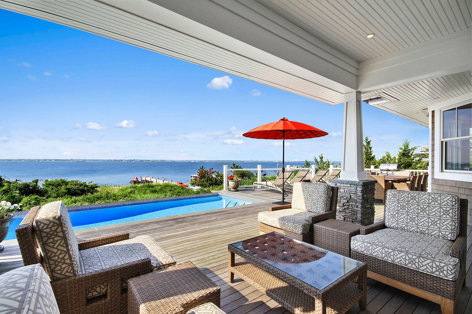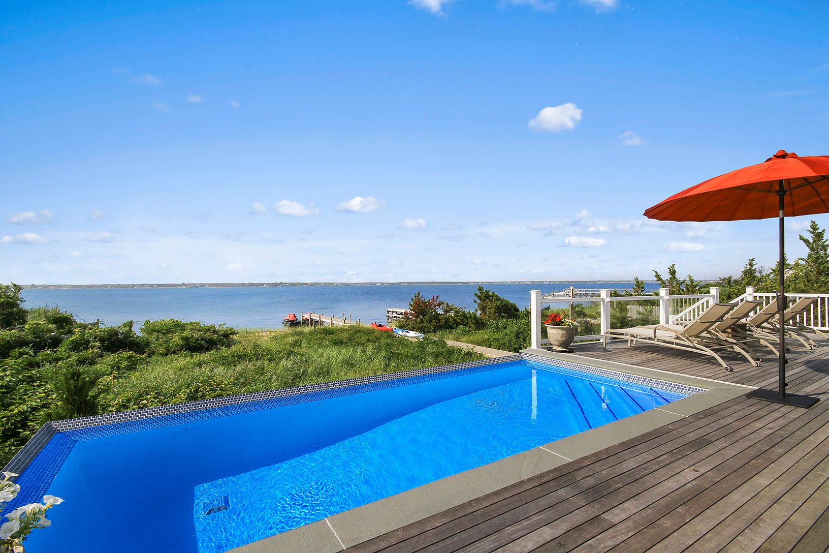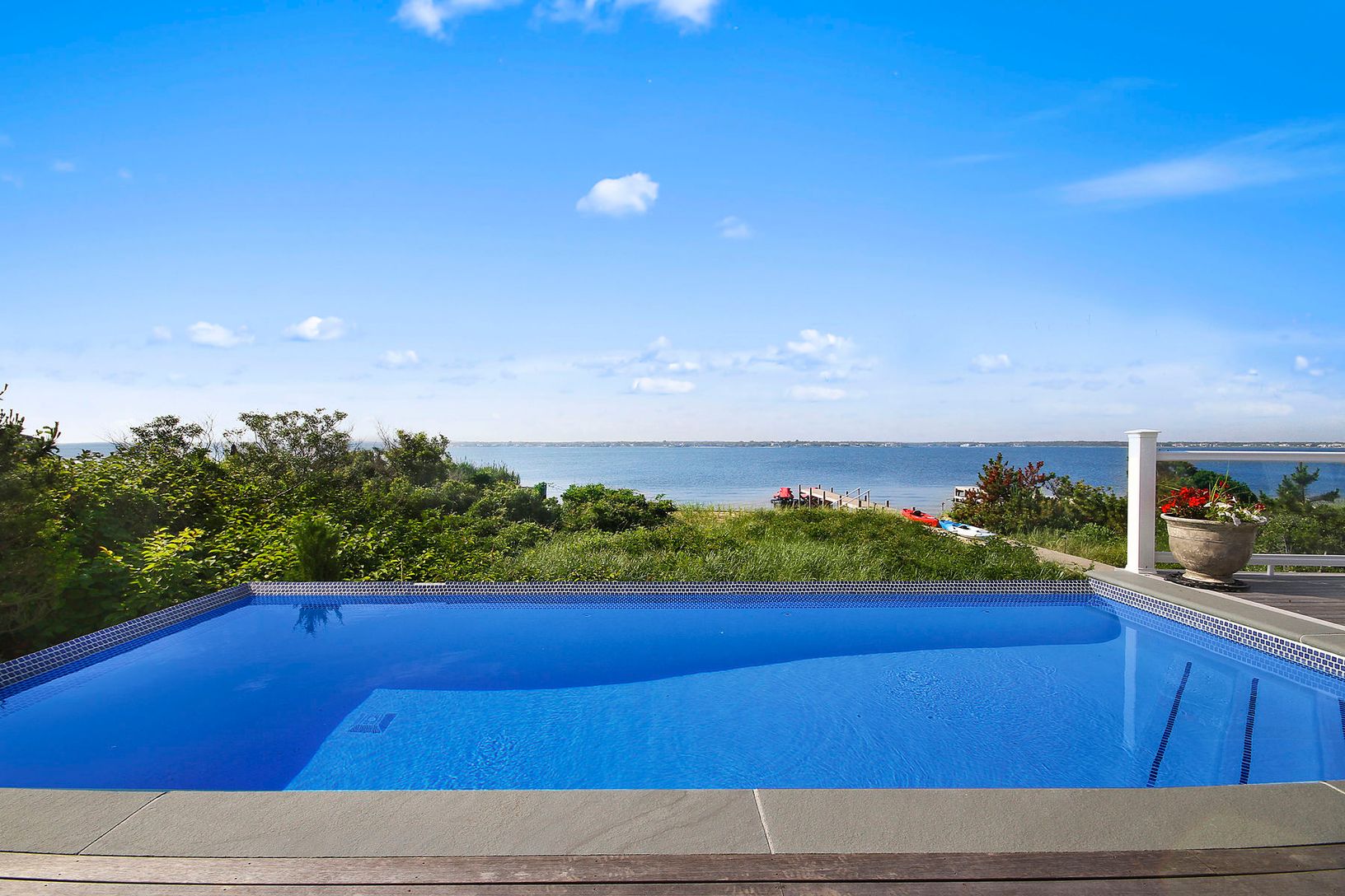 This 1-year-young Westhampton bayfront Post Modern offers nearly 3,800 square feet of easy, breezy living in the Hamptons. Combining an elegant design with sleek sophistication and state-of-the-art technology (Control 4 system to control music, lights, pool, thermastats and more), the home was designed to capture waterviews from every angle. The .57 acre property features 80 feet of prime Dune Road bay frontage, a sandy beach for sunning and j