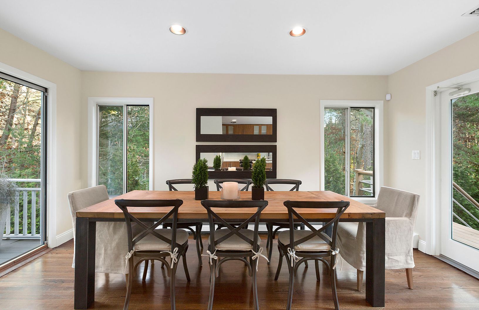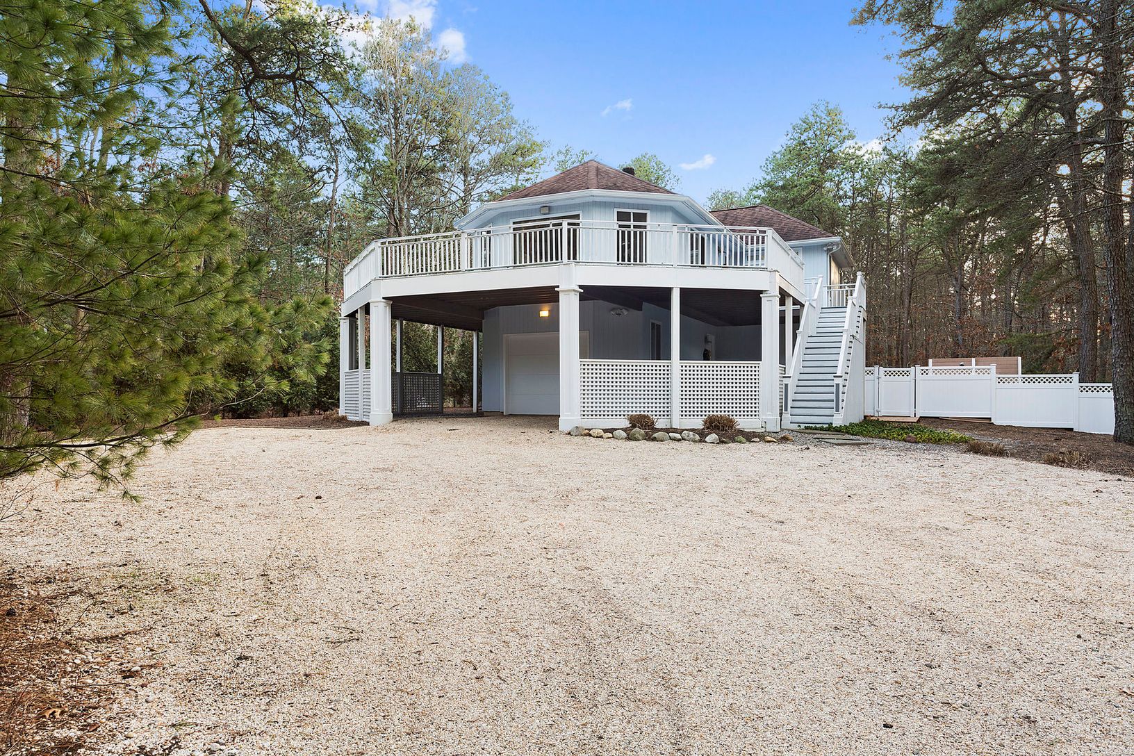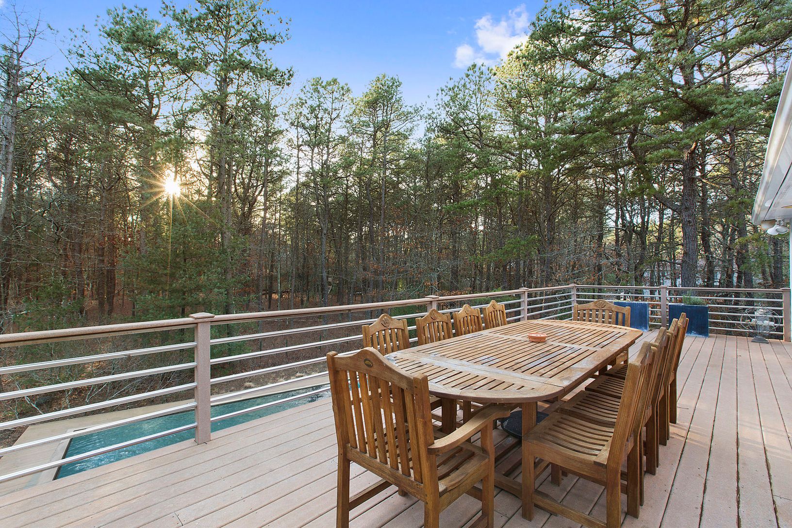 This unique modernist home is nestled among the white pines on a quiet country road. The home is designed around the great room which is anchored by a large wood-burning fireplace and surrounded by walls of windows and a wrap around entertaining deck. The kitchen, with its high end appliances, is ideal for your summer dinner parties and sits adjacent to a dining area with room for 8 as well as a large back deck overlooking the grounds for al