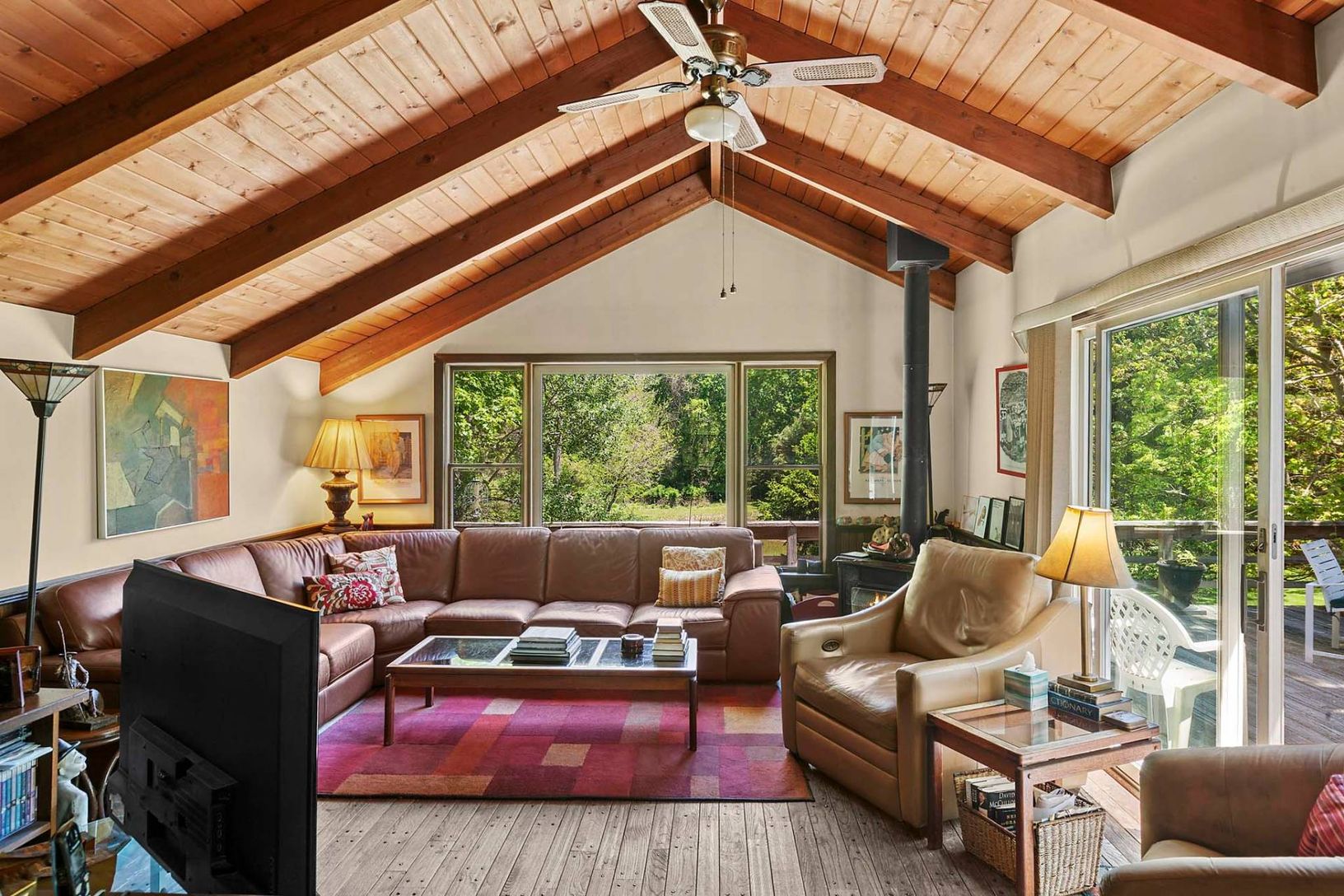 Set on the gentle slope of a spring-fed pond, this Shelter Island residence, similar in ways to a duplex, reveals itself not all at once, but in a series of calm, considered gestures. One enters by way of a circular drive that curves around an old maple and up a short path to a home that understands the value of sunlight, privacy, and practicality. Inside, the main floor offers a living room where light from the west falls generously across bo