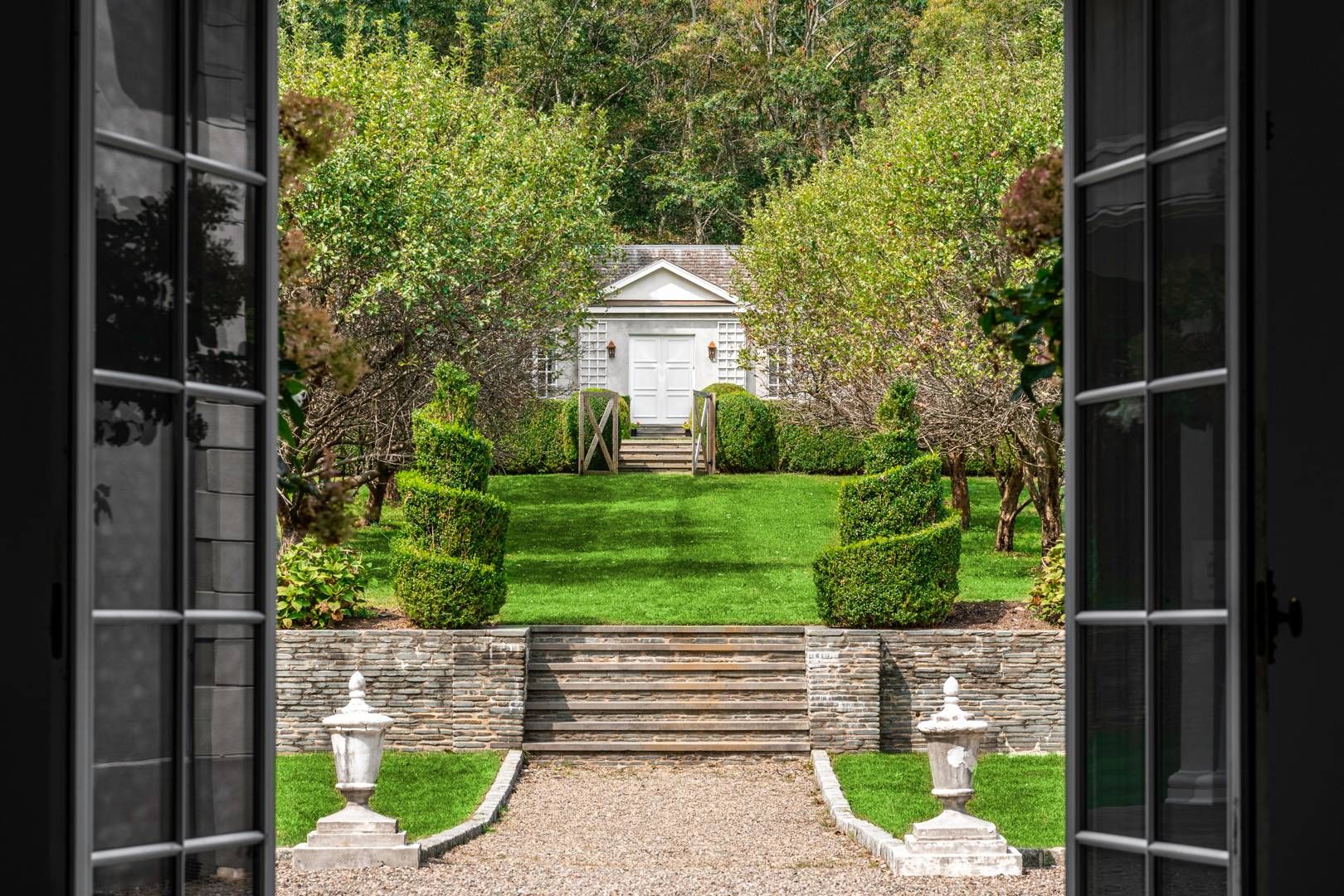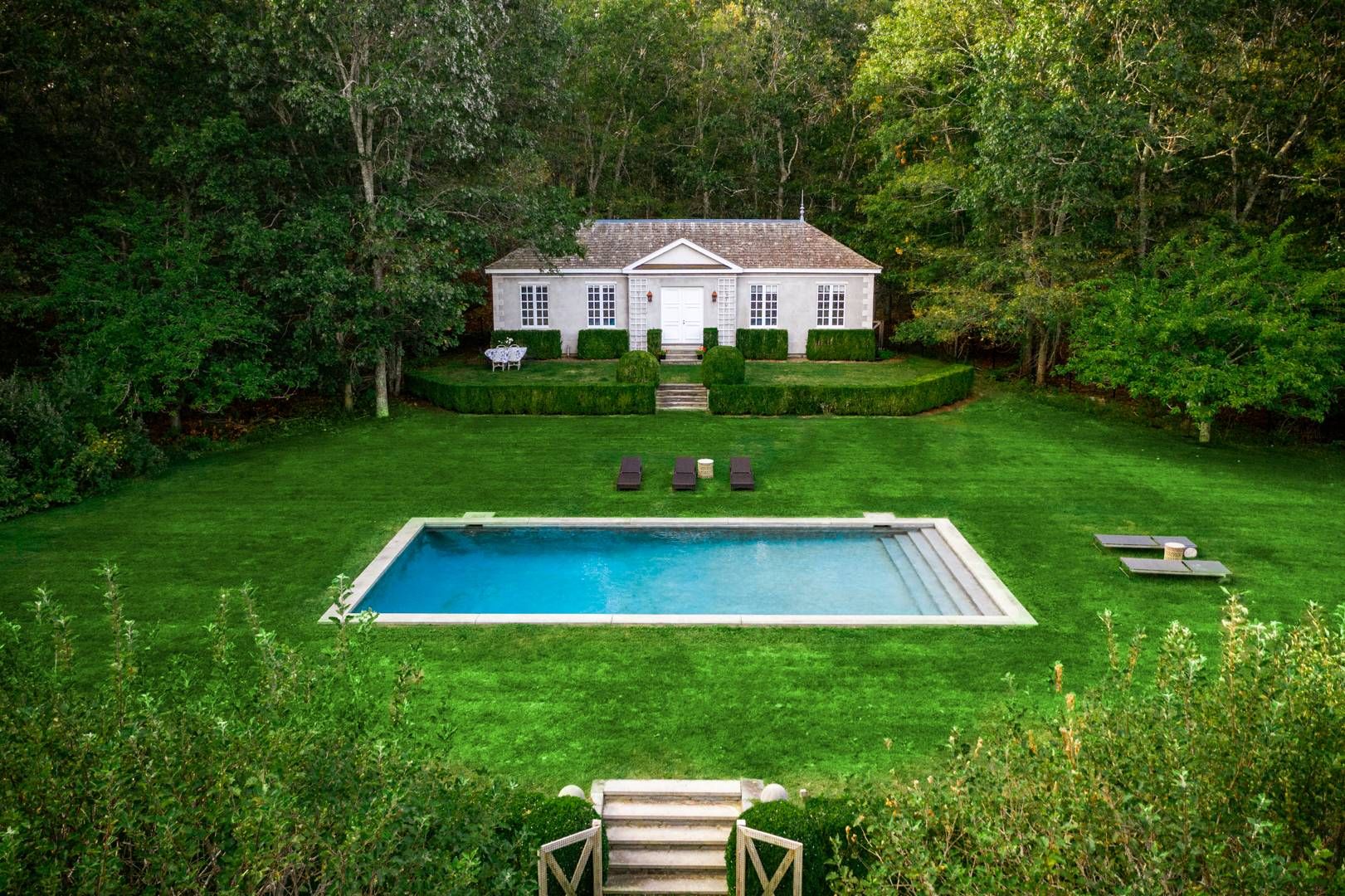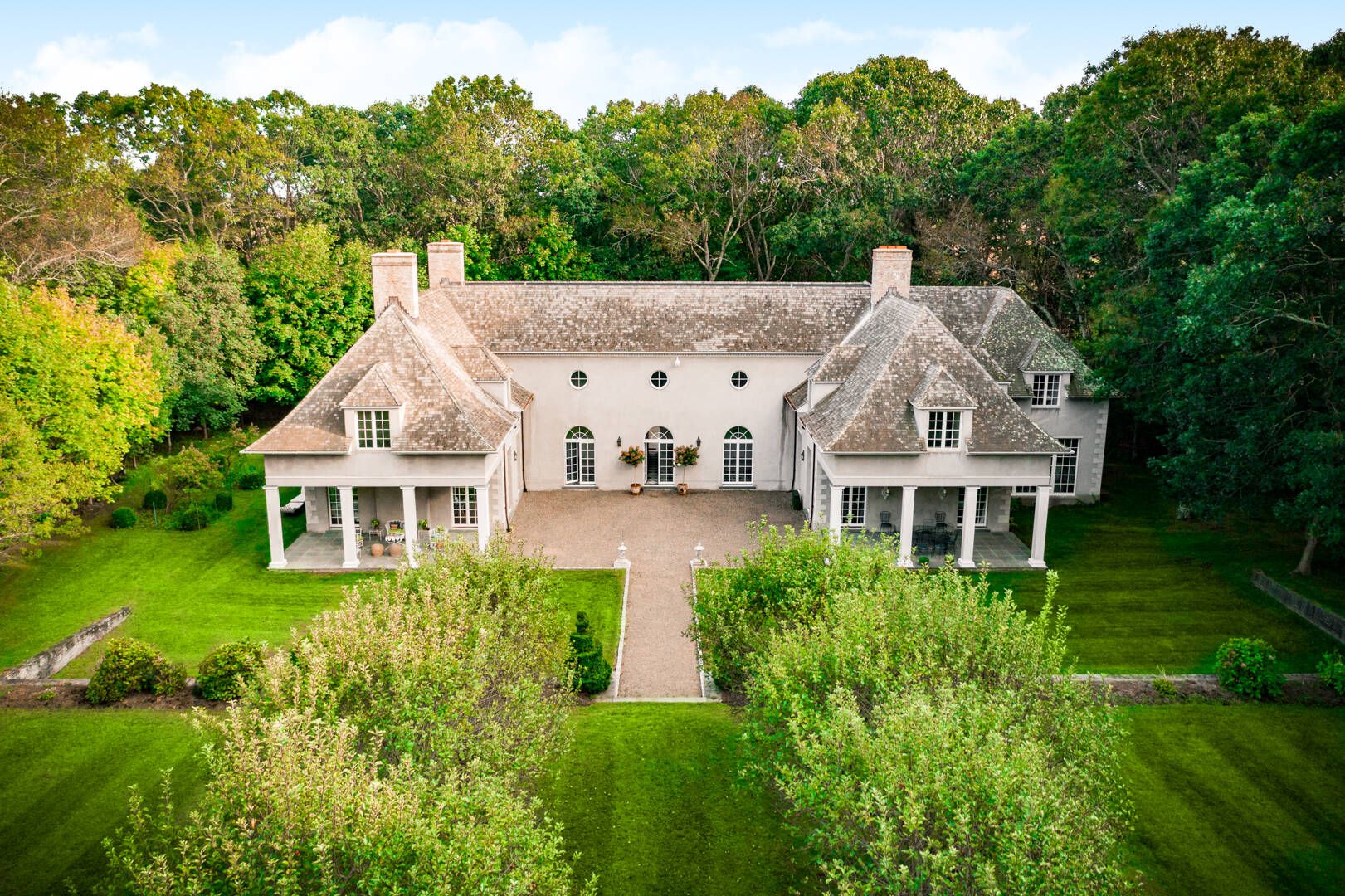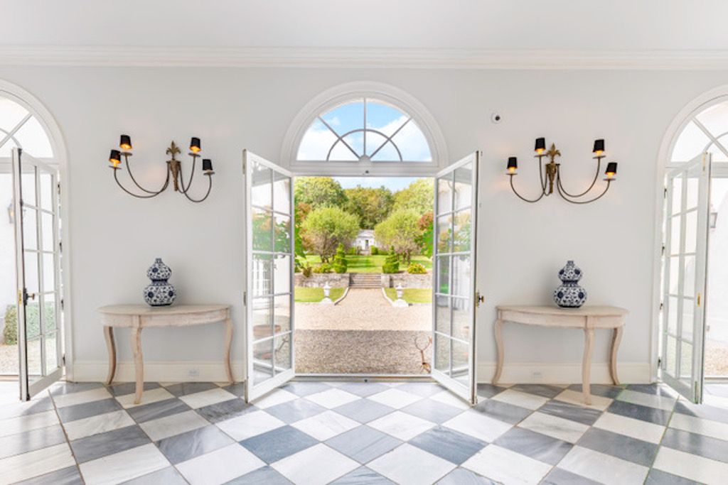 662 & 672 Noyac Path, Water Mill: Inspired by the quintessential countryside estates in the manner of David Adler and Charles Platt, this exquisite classic country compound is one of the most unique and tasteful retreats in the Hamptons. Upon entering the main house, you are immediately welcomed by the soaring ceiling heights and grand scale of the rooms with its many oversize custom mahogany windows. Dazzling imported architectural detail