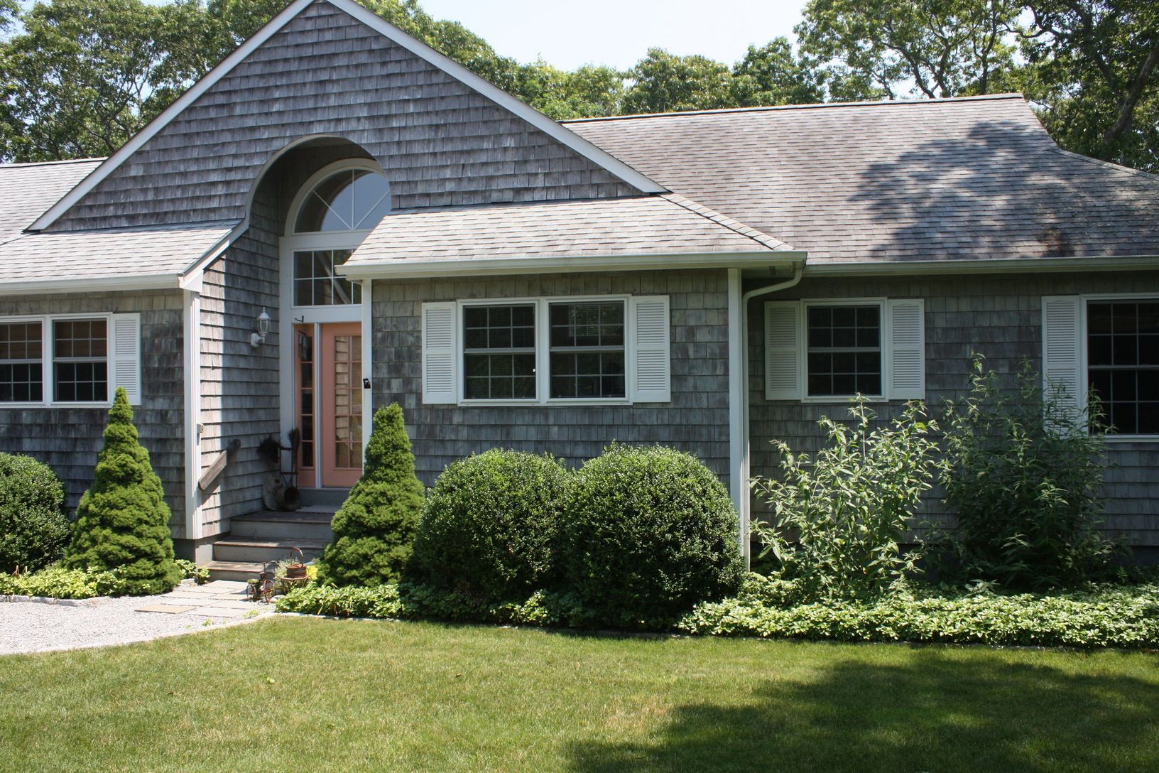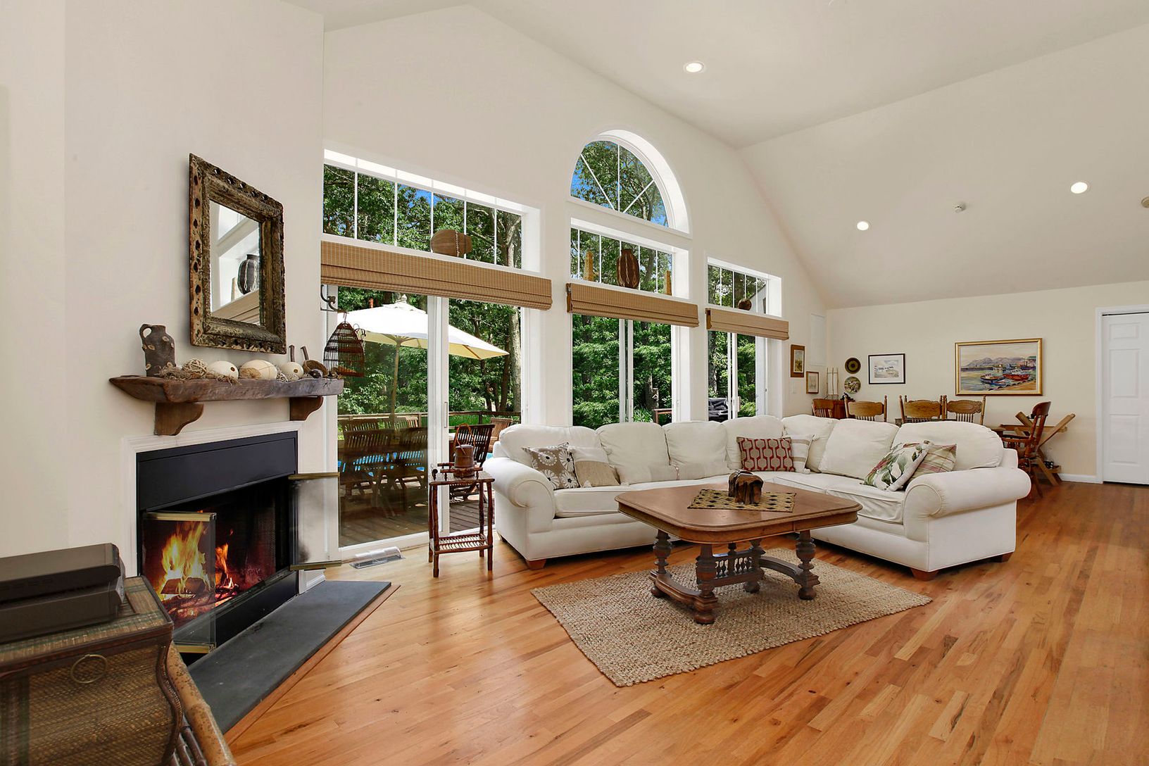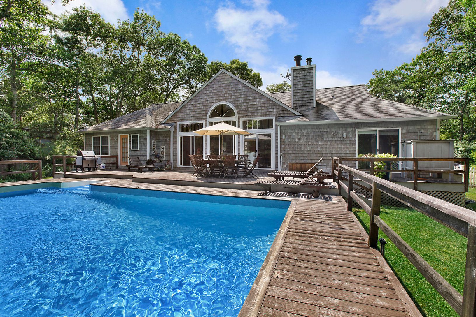 This beautiful four bedroom three bathroom home is nestled on a perfectly manicure half acre. The large deck area and sun lit pool have full privacy and quiet surroundings. Right around the corner is Three Mile Harbor beach and boat mooring area. Inside the home is an eye catching great room entry way with high vaulted ceilings with a fireplace and large windows overlooking the back yard. The en-suite master is on the north side of the hous