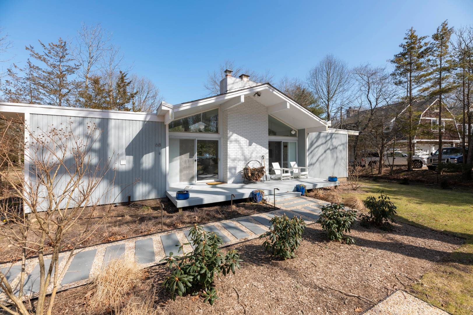 Located in the desirable Hampton Waters community on the shores of Three Mile Harbor, this recently renovated, well-maintained 1970's water-view modern beach house expresses classic midcentury style. Offering 1,003+/- sq. ft. of living space, its bright interiors with crisp, clean lines flow among light-filled open living areas with white walls and ceilings complimented by wood flooring. Glass doors open to a deck overlooking the rear grounds