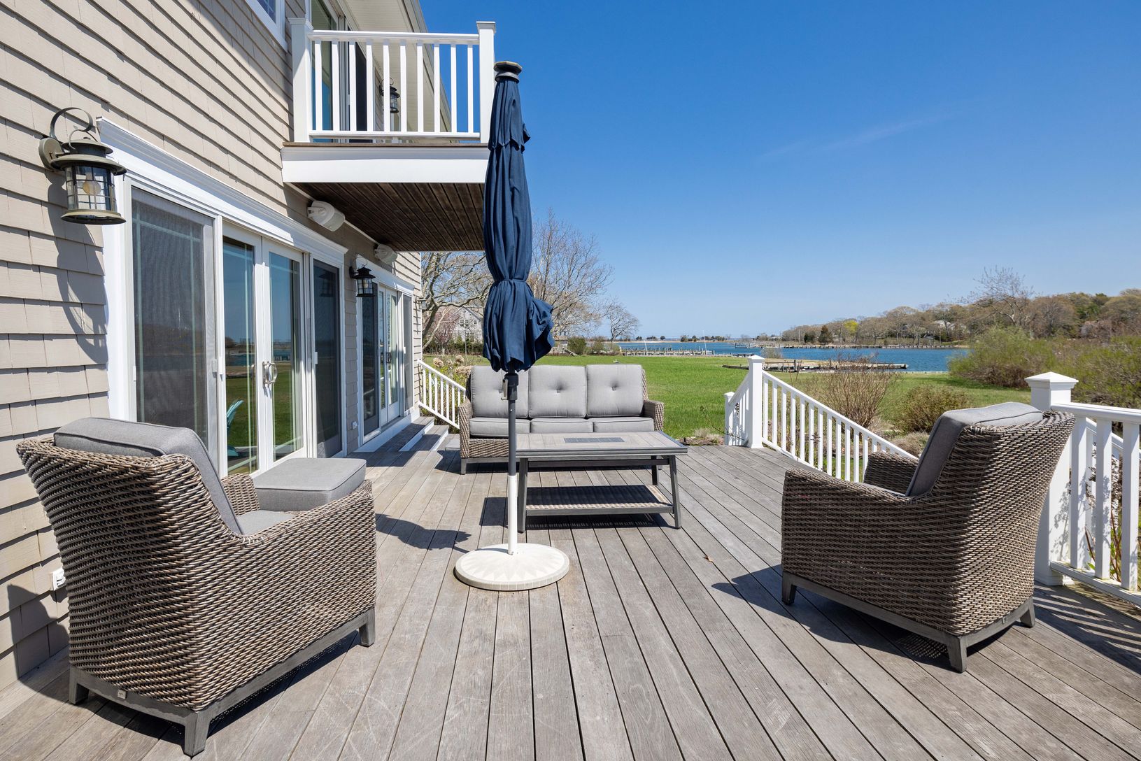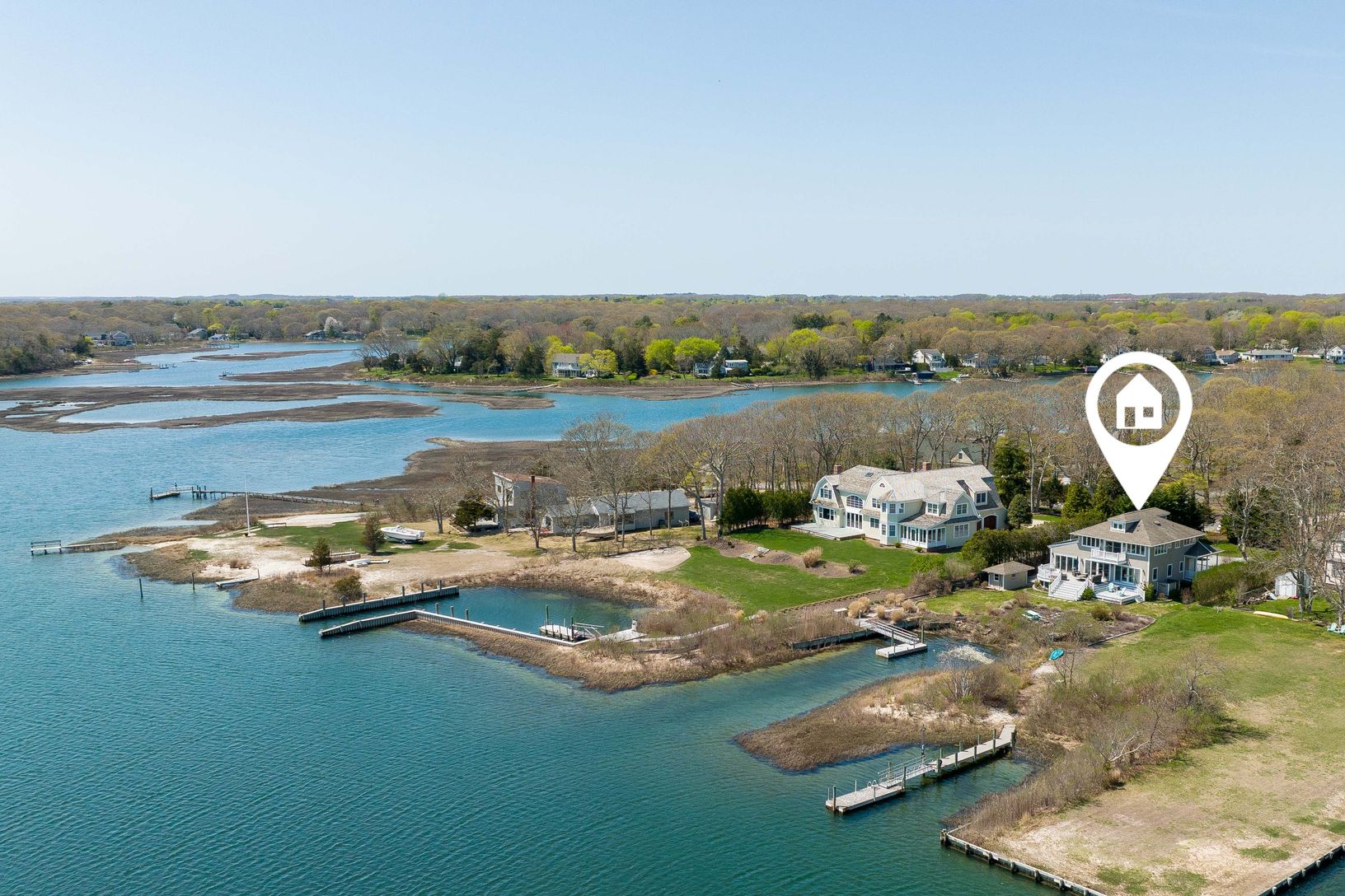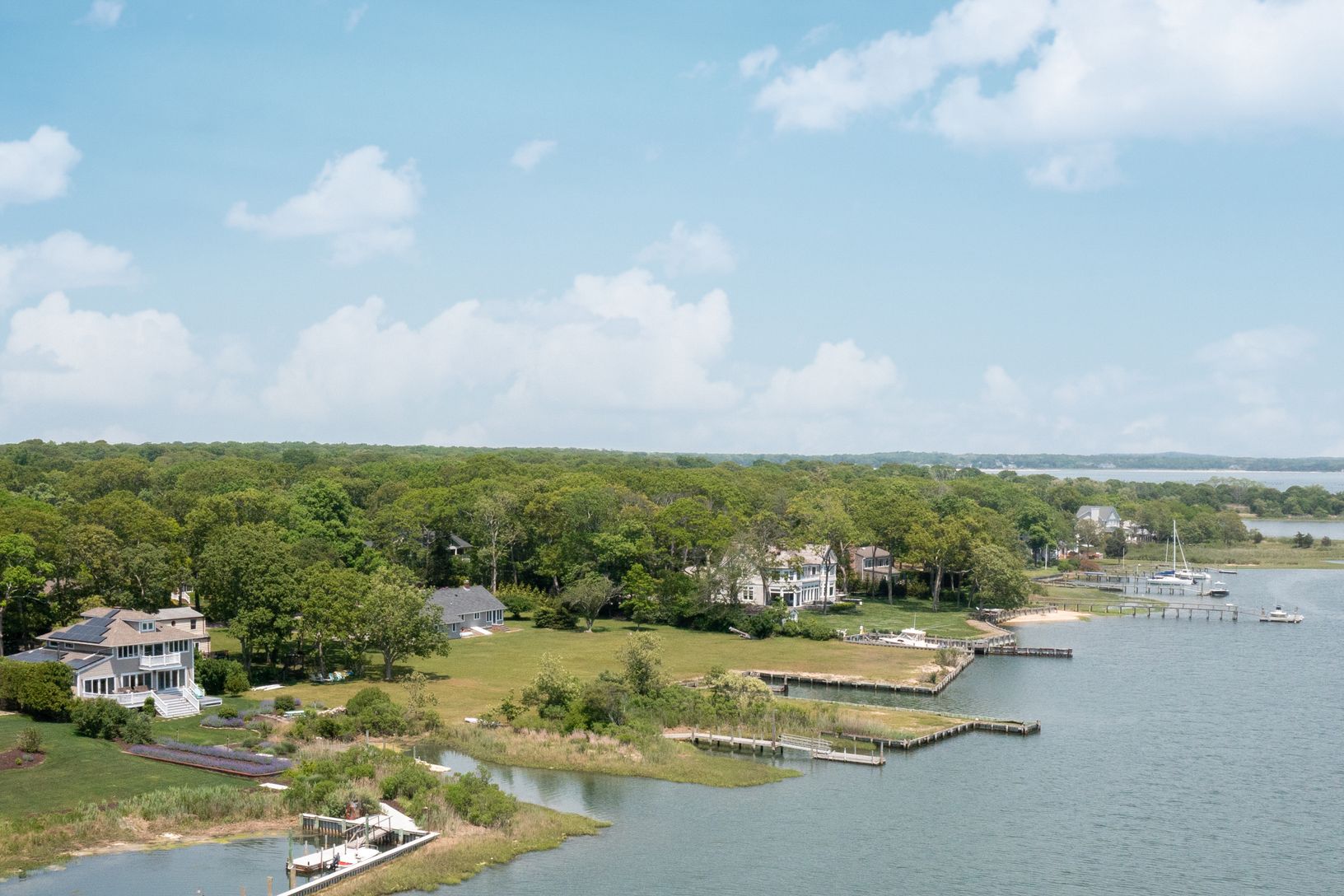 Set on a half acre, this custom-built boat-lover's home features a private dock and expansive views of Peconic Bay. Nearly every room in this shingle-style traditional home is showered with aqua blue light from the Bay, while framing beautiful views across to Robin's Island. Large windows light up every room with endless views, flanked by the custom kitchen, large pantry and light-filled breakfast/dining room on one side, and the richly-lite f