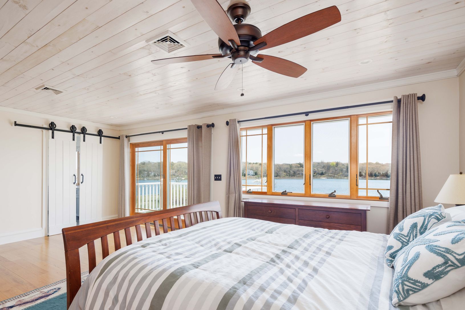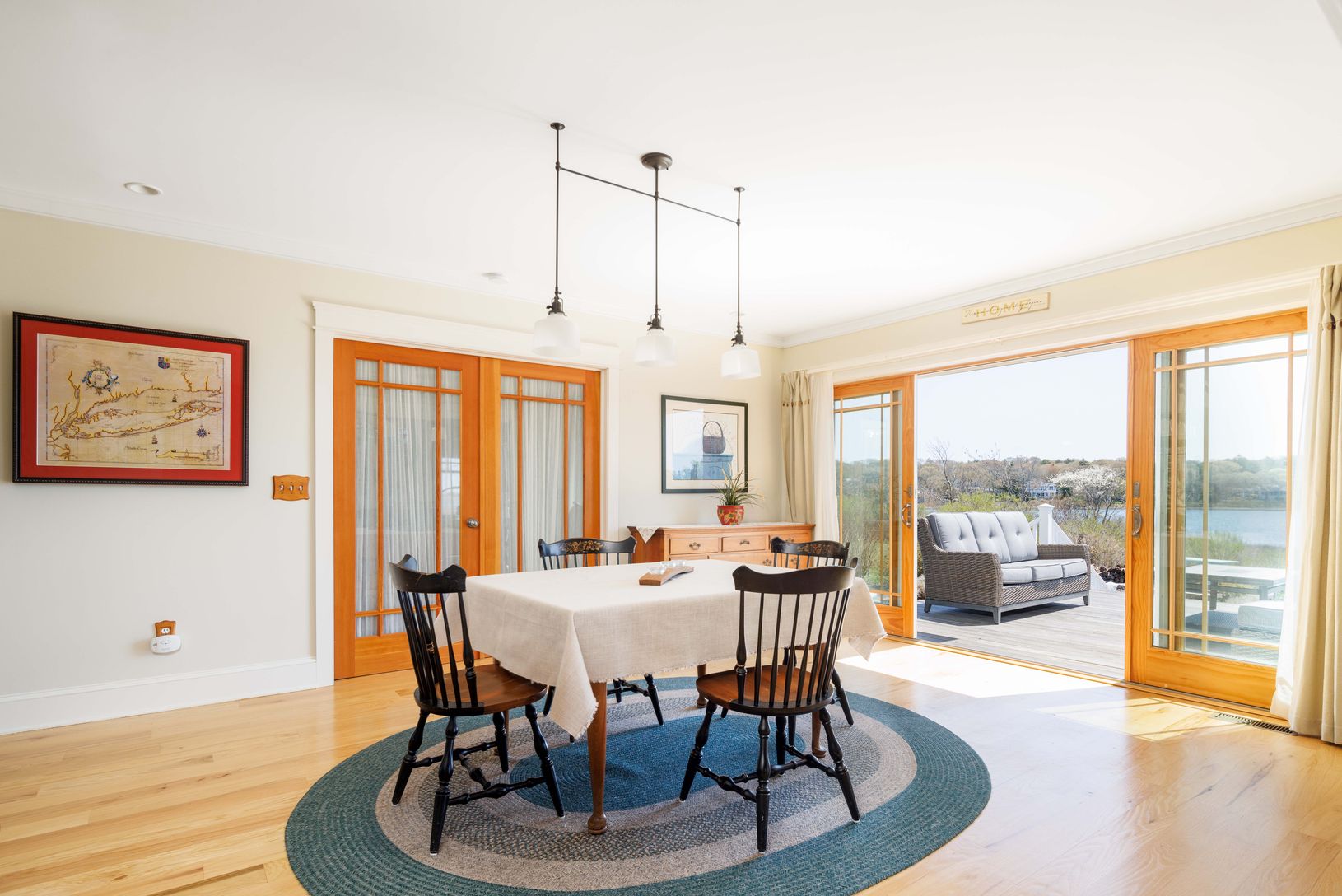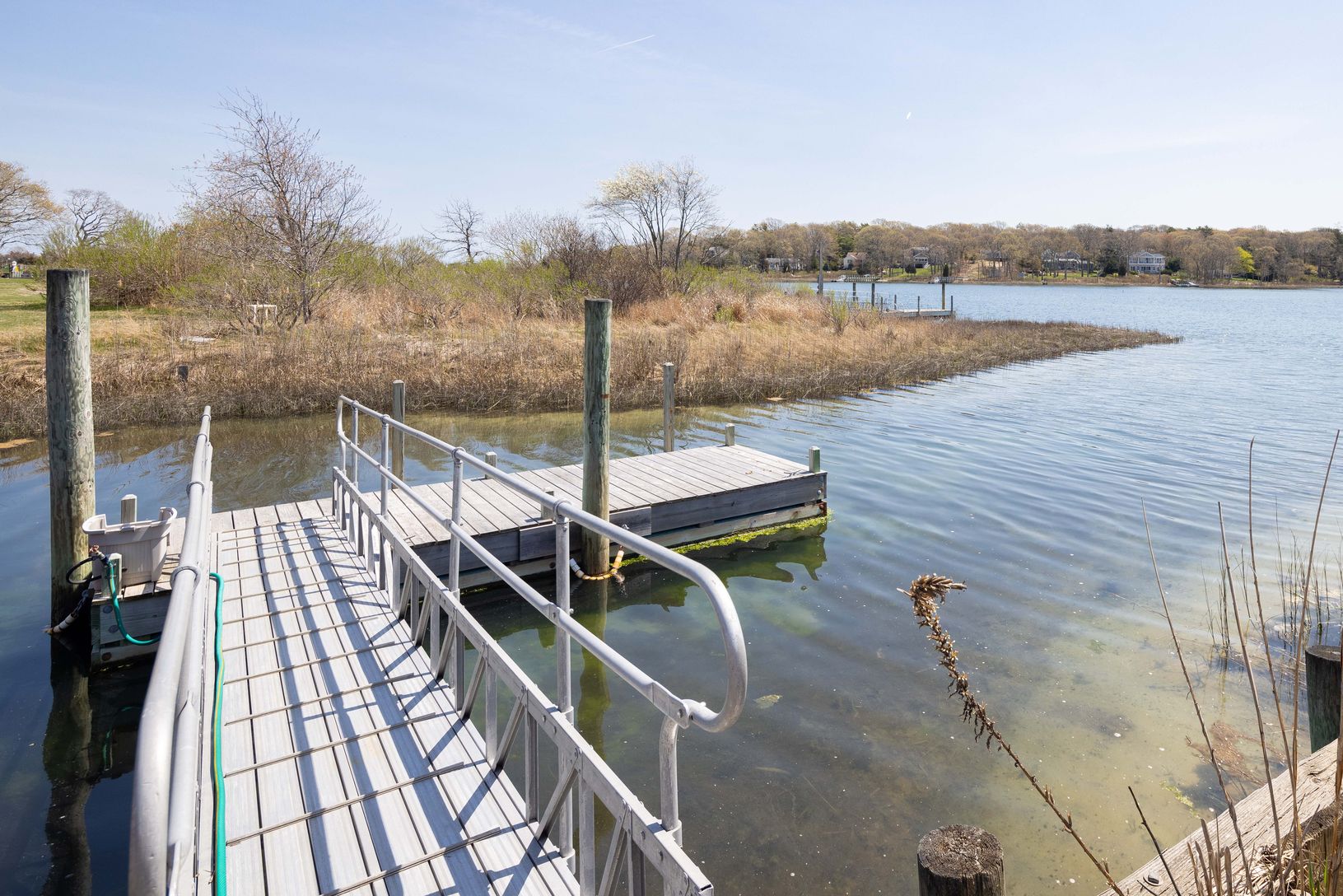 Set on a half acre, this custom-built boat-lover's home features a private dock and expansive views of Peconic Bay. Nearly every room in this shingle-style traditional home is showered with aqua blue light from the Bay, while framing beautiful views across to Robin's Island. Large windows light up every room with endless views, flanked by the custom kitchen, large pantry and light-filled breakfast/dining room on one side, and the richly-lite f