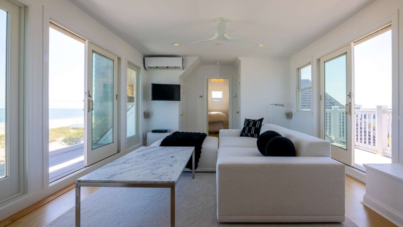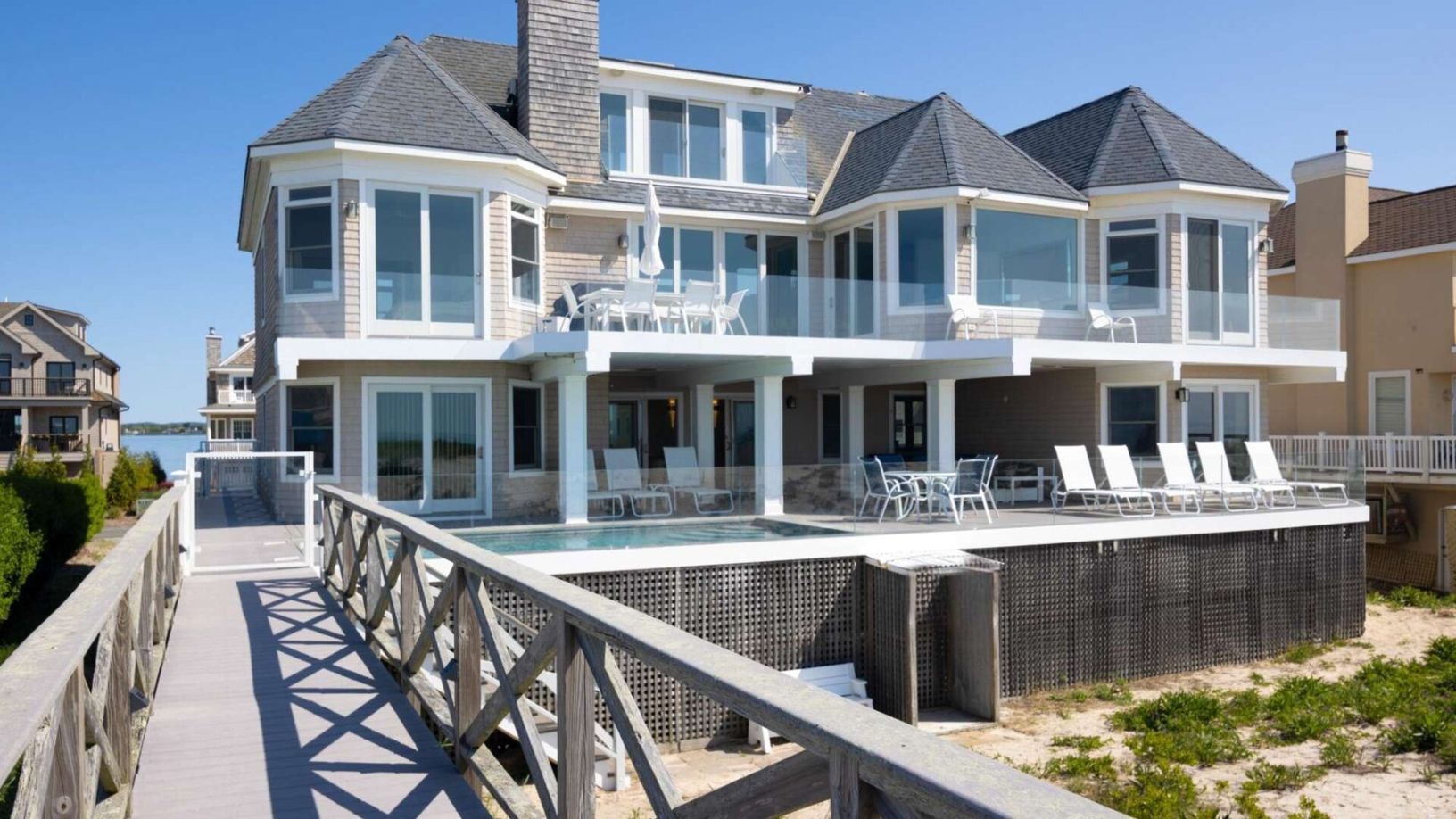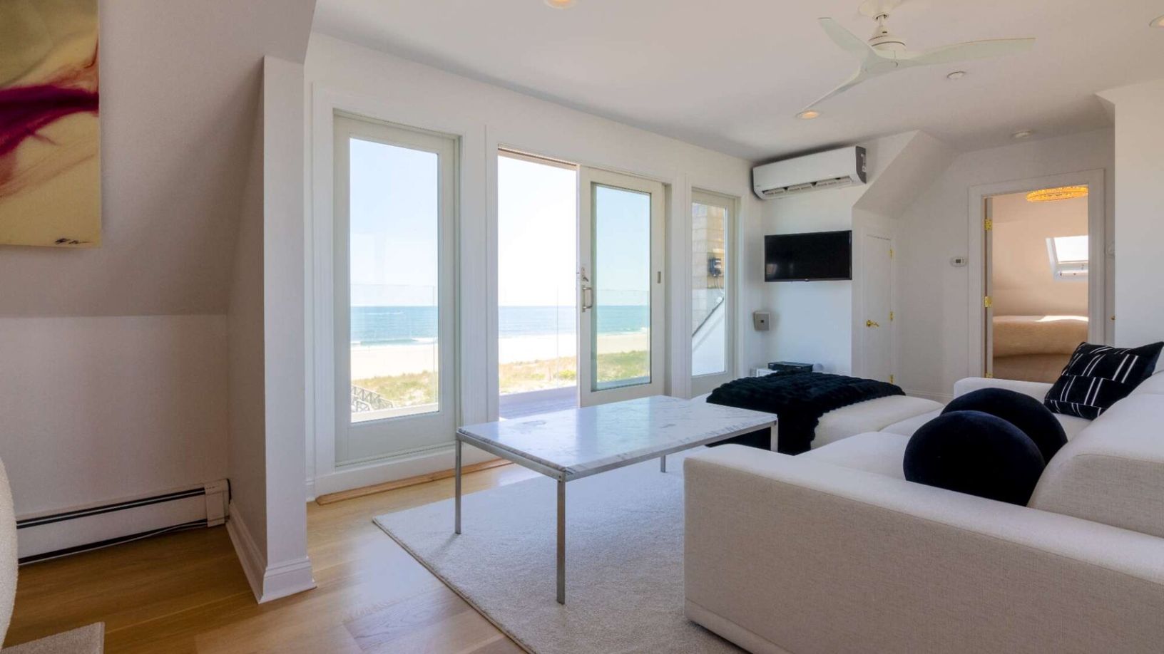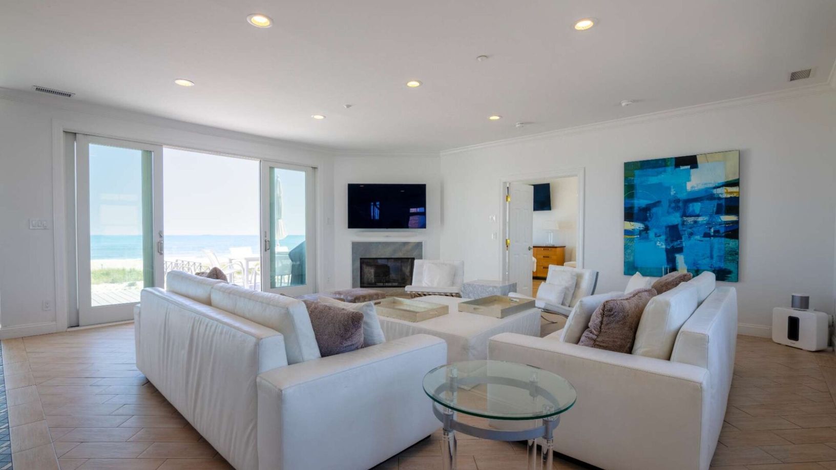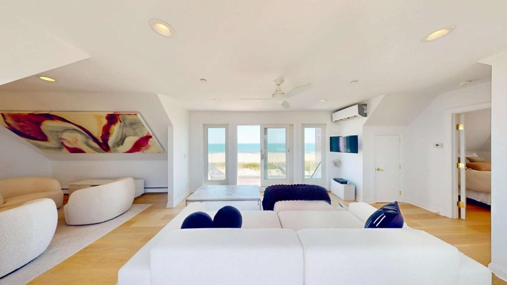 This expansive oceanfront home in Westhampton offers the ultimate getaway for families or large groups looking for a luxurious escape. Boasting a modern design, this stunning 8-bedroom, 7-bathroom retreat accommodates up to 16 guests and provides an unmatched coastal experience. The home is spacious and bright, with multiple sittin