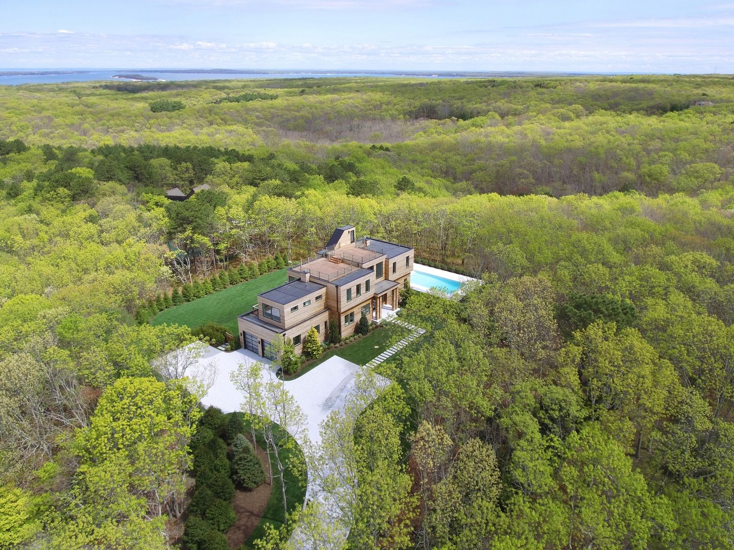 Life is more serene living above the tree tops. This New Hamptons Modern is perched high atop Little Noyac Path with spectacular panoramic water views of Peconic Bay from Robin's Island to Jessup Neck, to Connecticut and beyond. Masterfully constructed by George Kamper this property offers 6000 sf of luxury living space on three levels; a fresh alternative for buyers seeking modern design and clean finishes. Secluded and backing to 15 acres