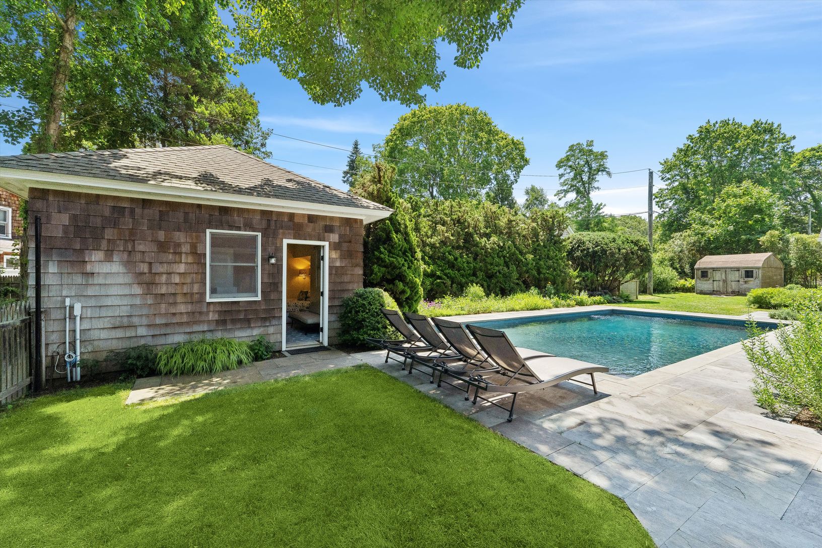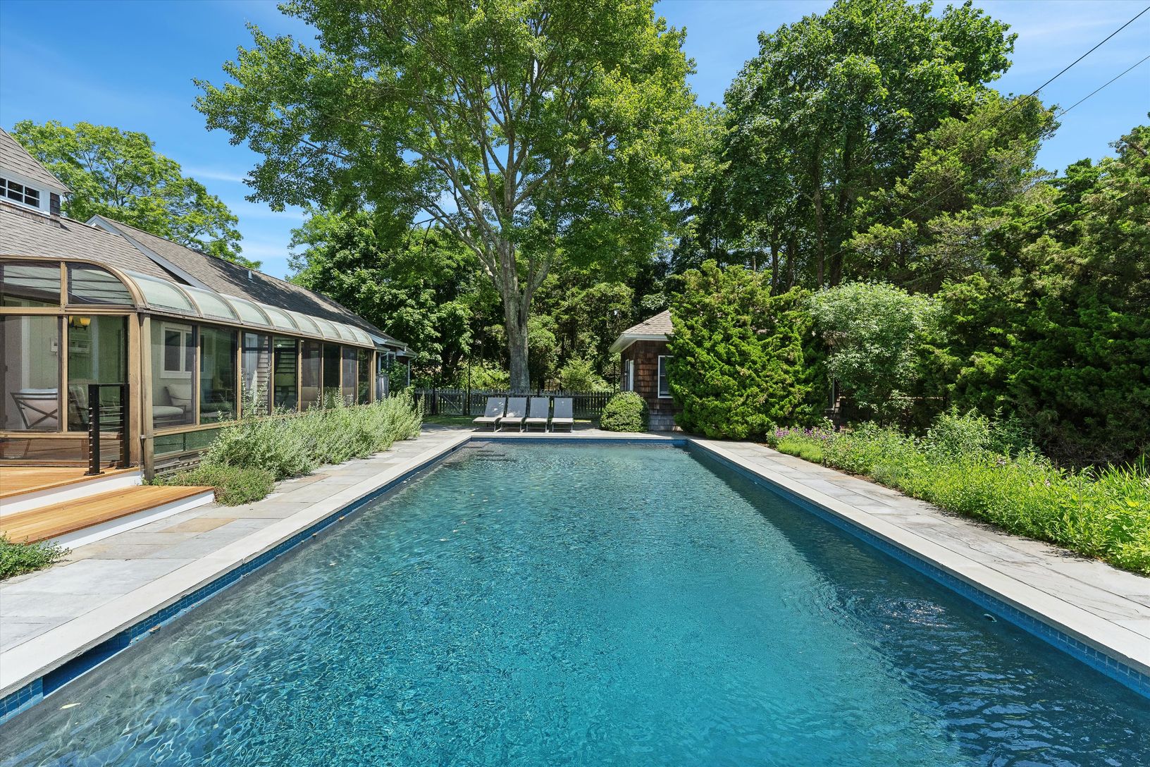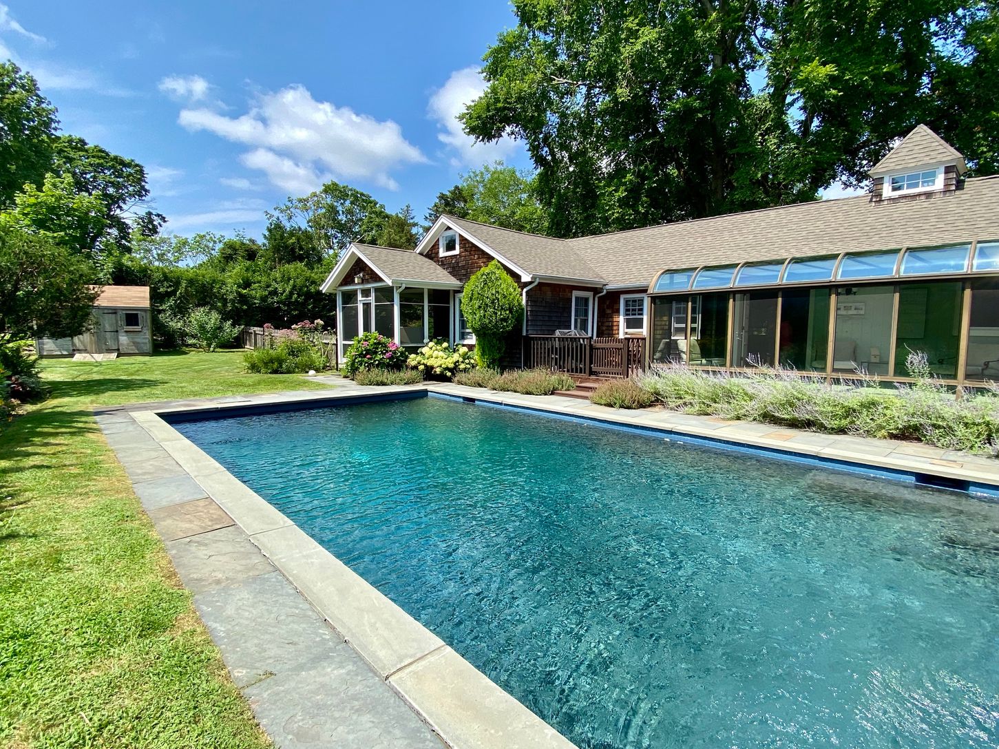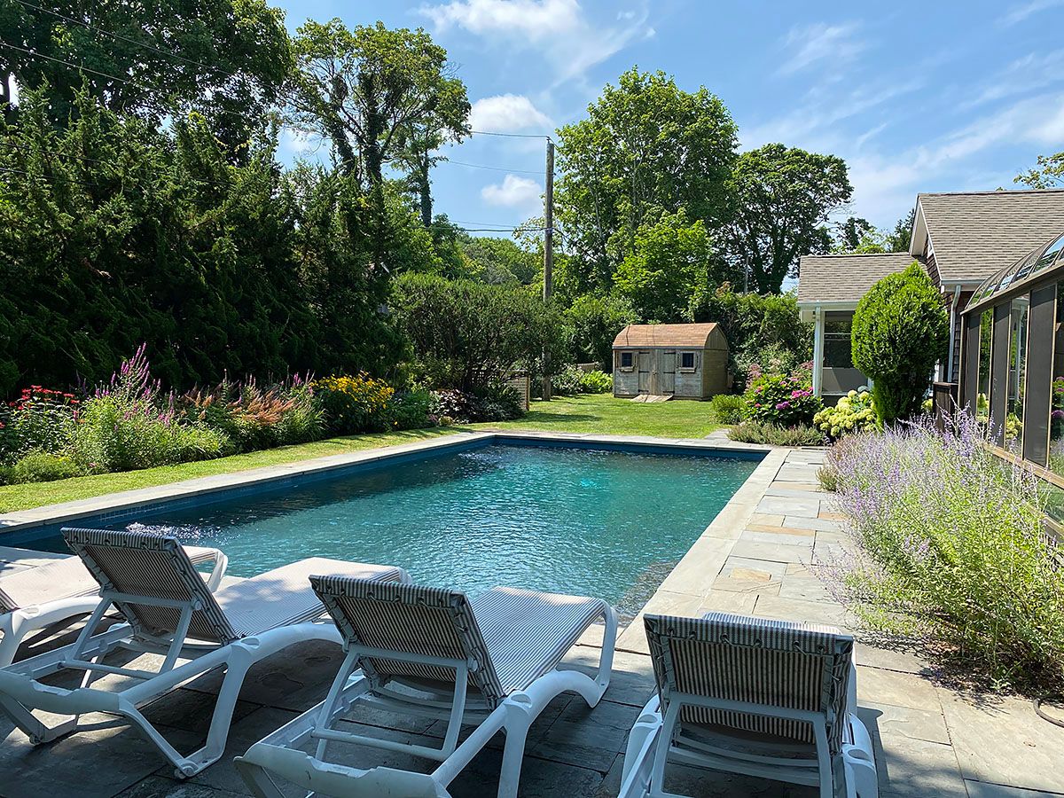 On a quiet lane in Quiogue, this 5 BR / 4 BR is the ideal summer retreat. Inside is an open kitchen, living room with fireplace, glassed-in sunroom, office with daybed, generous dining room, and four bedrooms including a master suite with a private screened-in porch. Outside there are beautiful gardens, wide lawns, a heated gunite pool, large screened in porch, and a pool/guest cottage with queen bed and bath. Basement level has ping-pong and