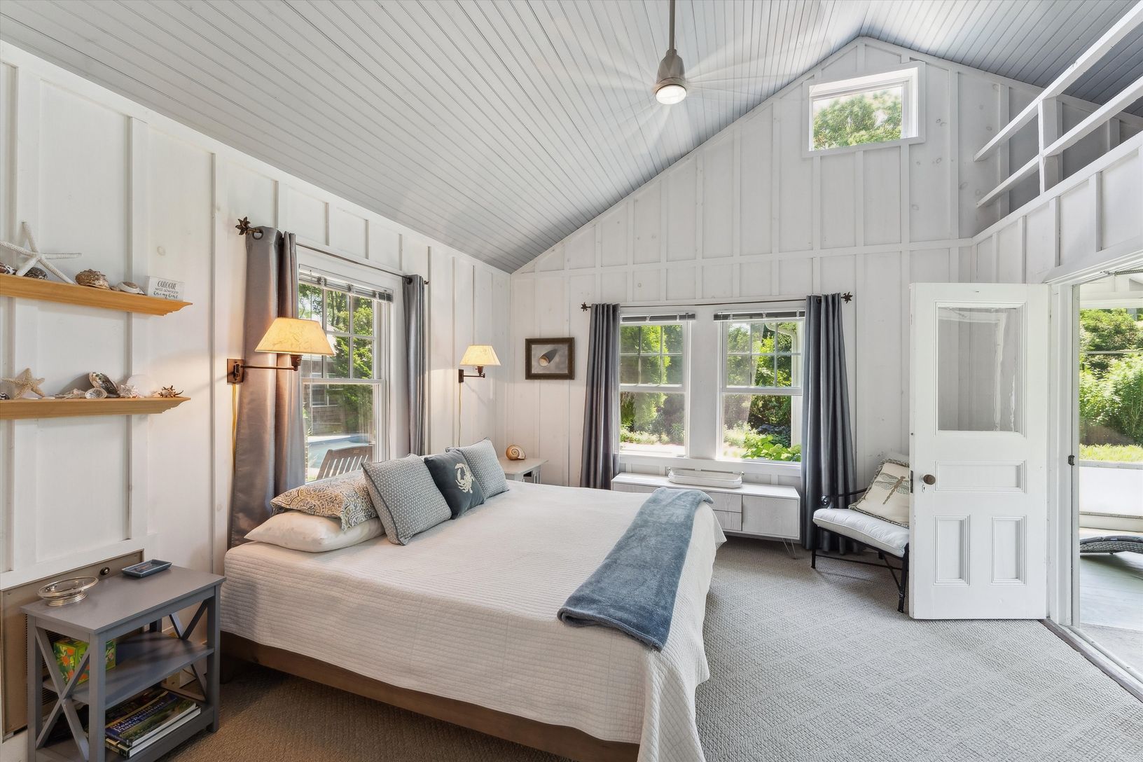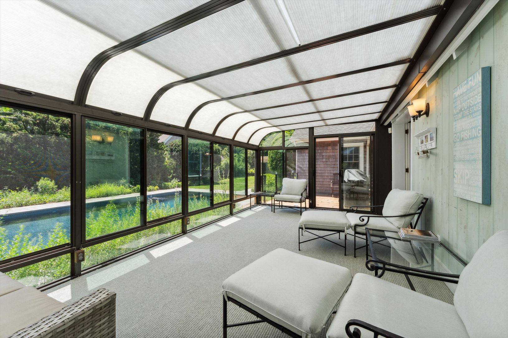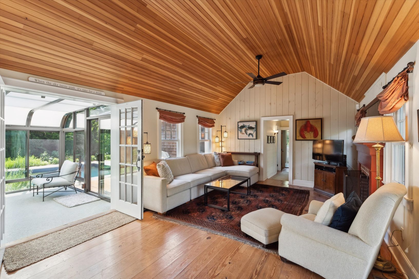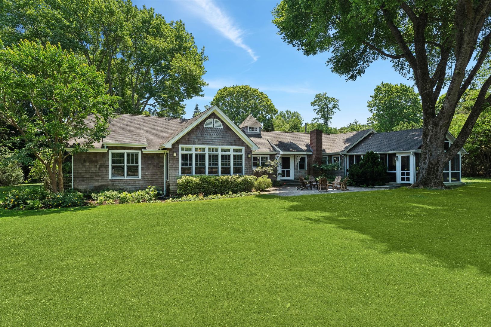 On a quiet lane in Quiogue, this 5 BR / 4 BR is the ideal summer retreat. Inside is an open kitchen, living room with fireplace, glassed-in sunroom, office with daybed, generous dining room, and four bedrooms including a master suite with a private screened-in porch. Outside there are beautiful gardens, wide lawns, a heated gunite pool, large screened in porch, and a pool/guest cottage with queen bed and bath. Basement level has ping-pong and