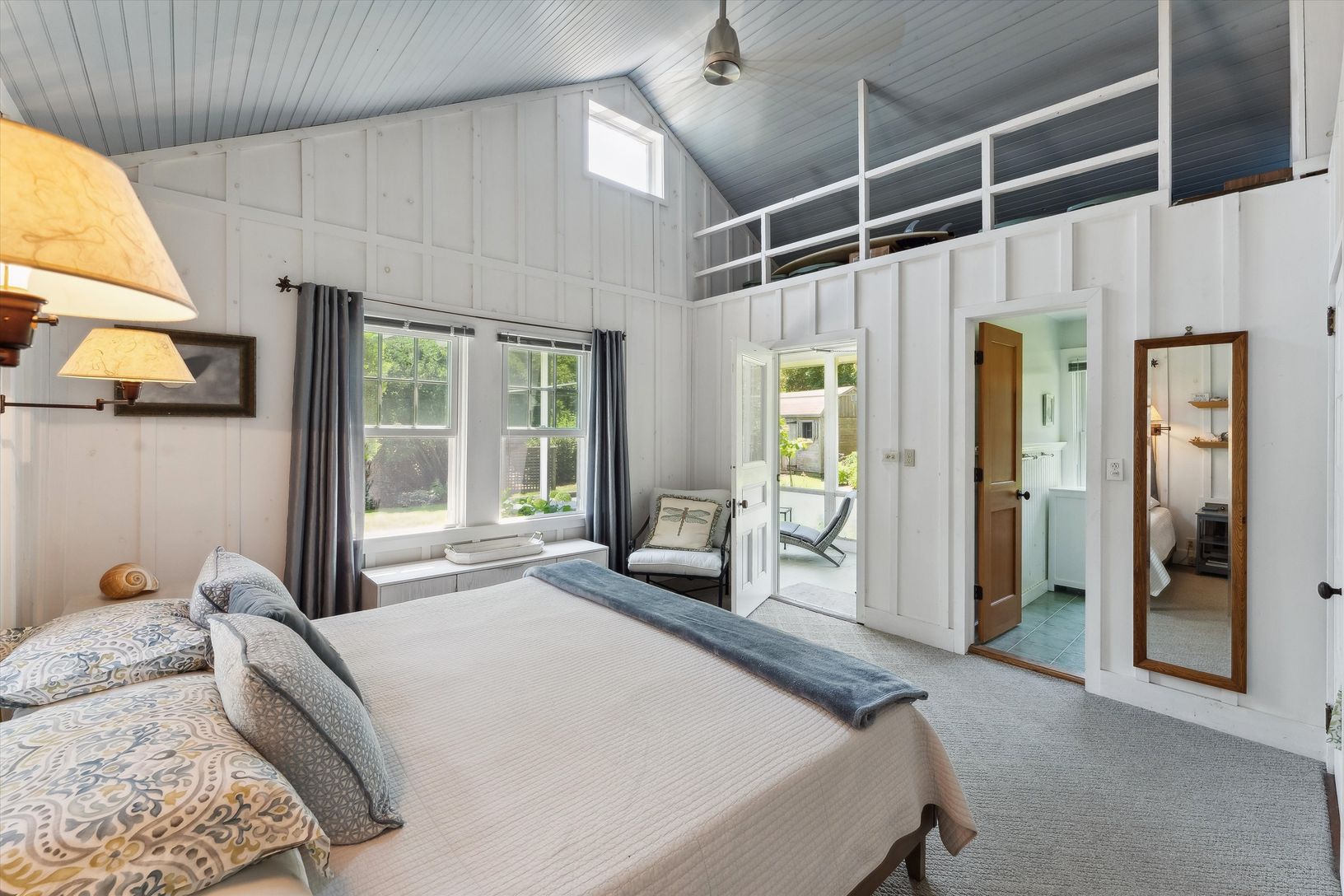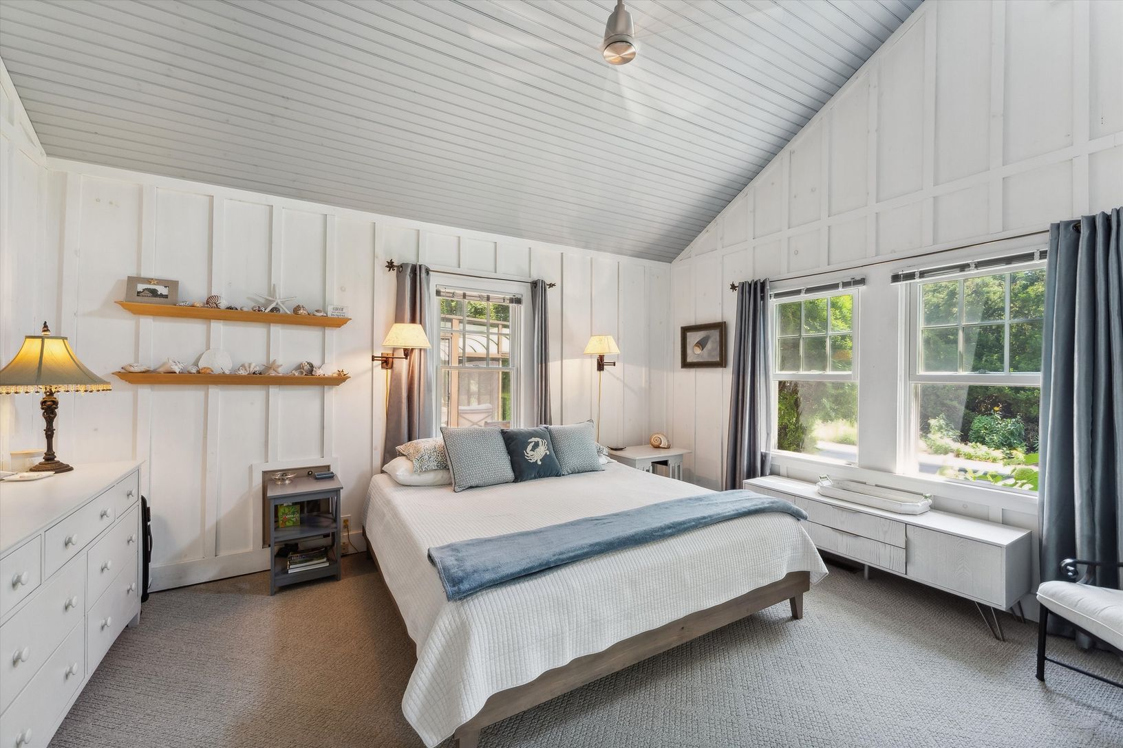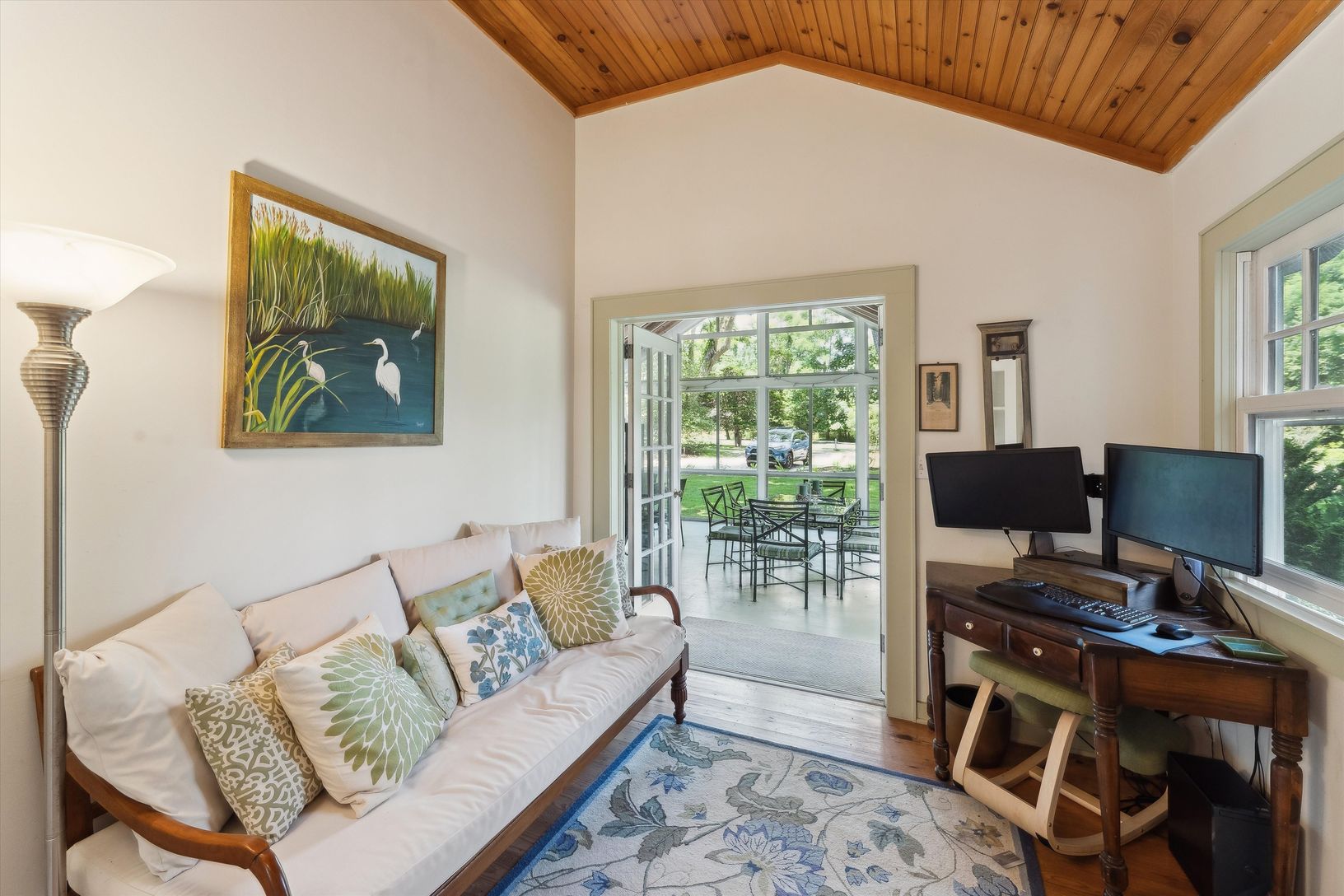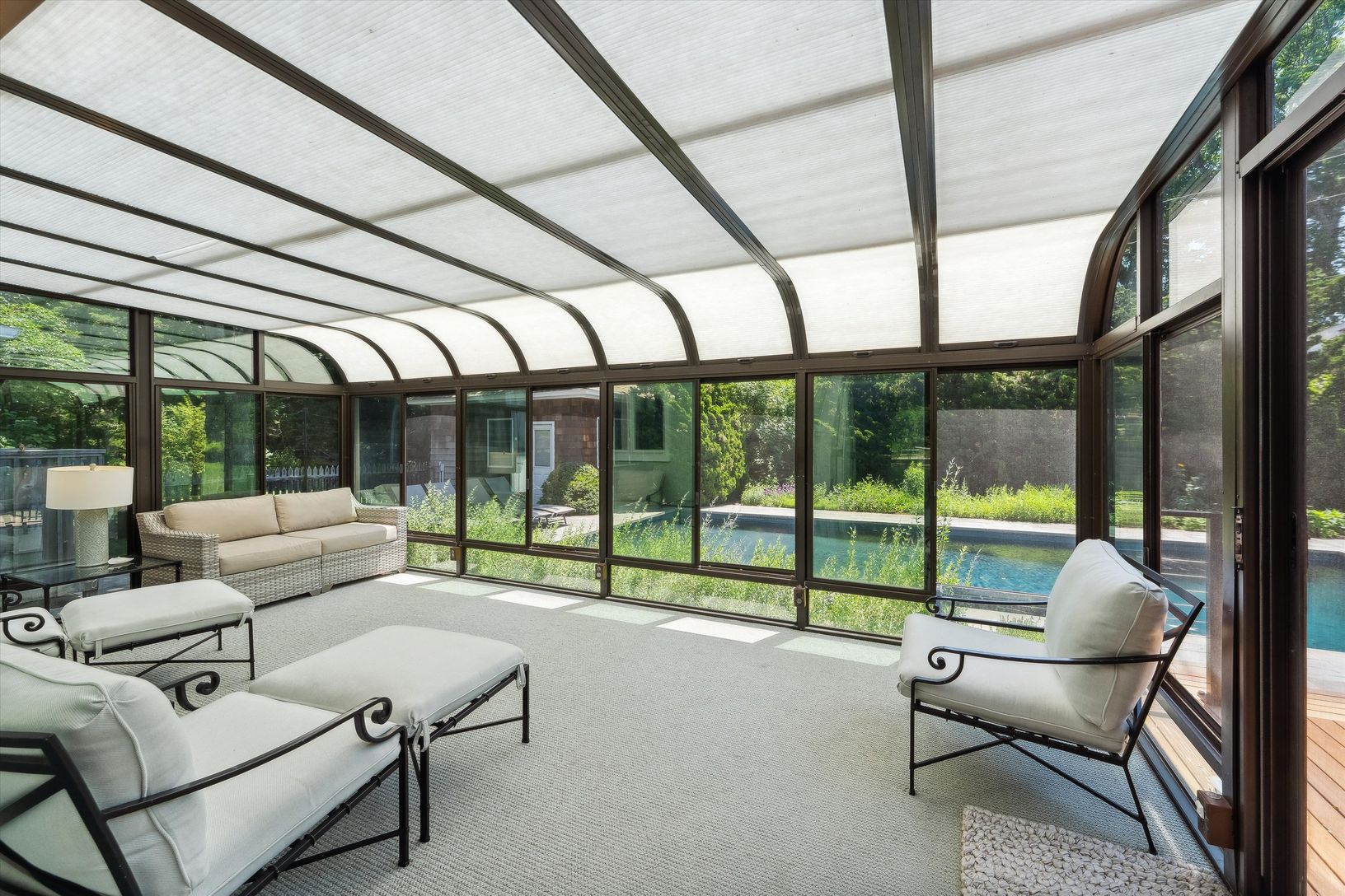 On a quiet lane in Quiogue, this 5 BR / 4 BR is the ideal summer retreat. Inside is an open kitchen, living room with fireplace, glassed-in sunroom, office with daybed, generous dining room, and four bedrooms including a master suite with a private screened-in porch. Outside there are beautiful gardens, wide lawns, a heated gunite pool, large screened in porch, and a pool/guest cottage with queen bed and bath. Basement level has ping-pong and