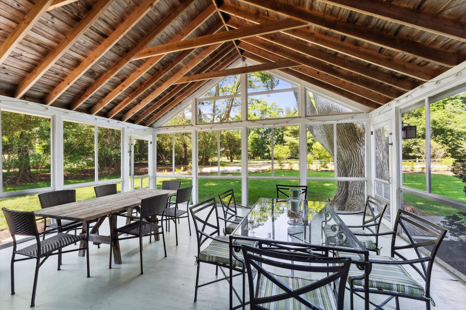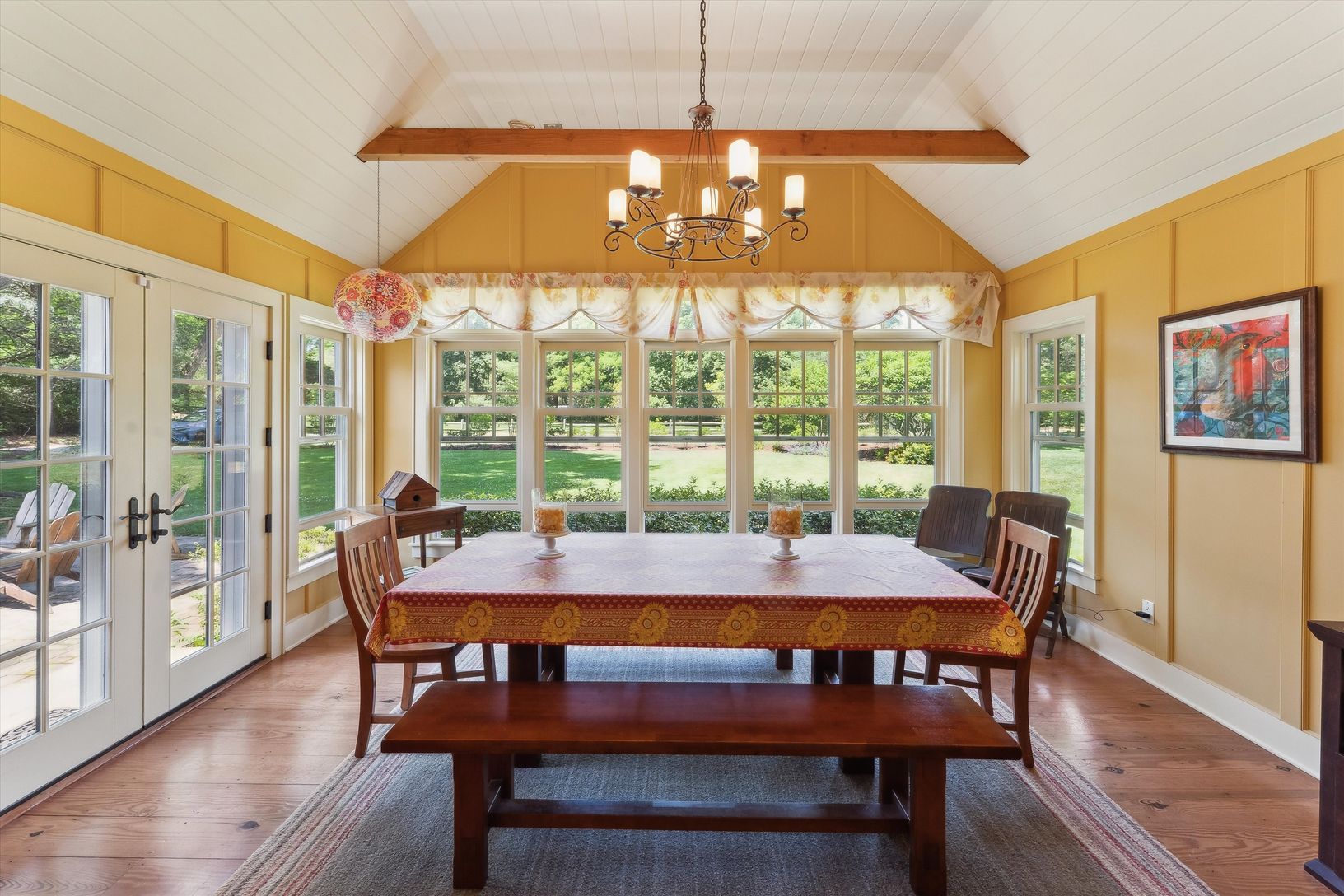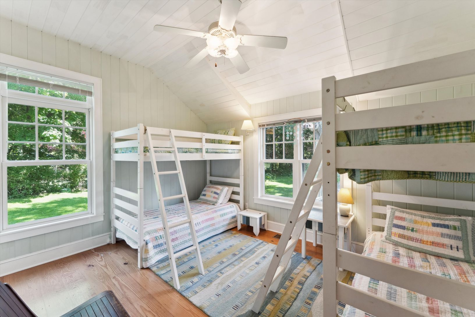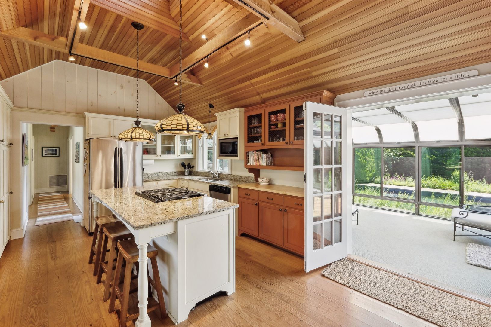 On a quiet lane in Quiogue, this 5 BR / 4 BR is the ideal summer retreat. Inside is an open kitchen, living room with fireplace, glassed-in sunroom, office with daybed, generous dining room, and four bedrooms including a master suite with a private screened-in porch. Outside there are beautiful gardens, wide lawns, a heated gunite pool, large screened in porch, and a pool/guest cottage with queen bed and bath. Basement level has ping-pong and