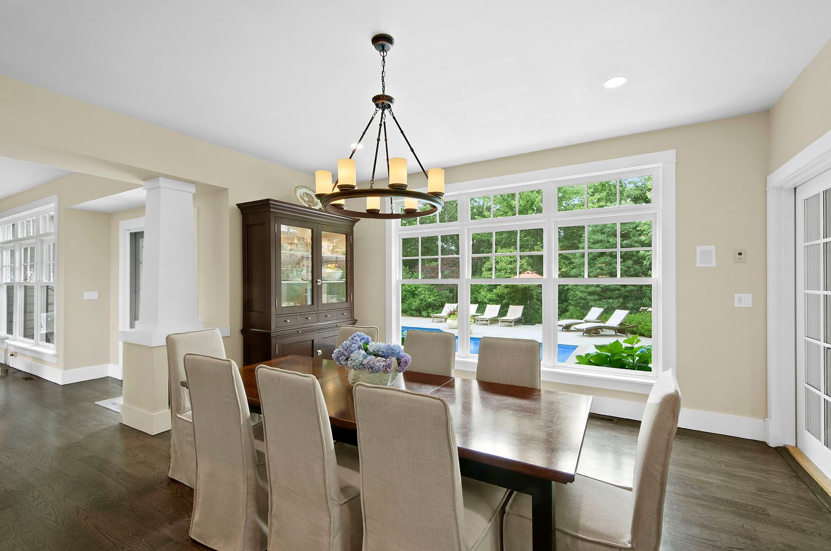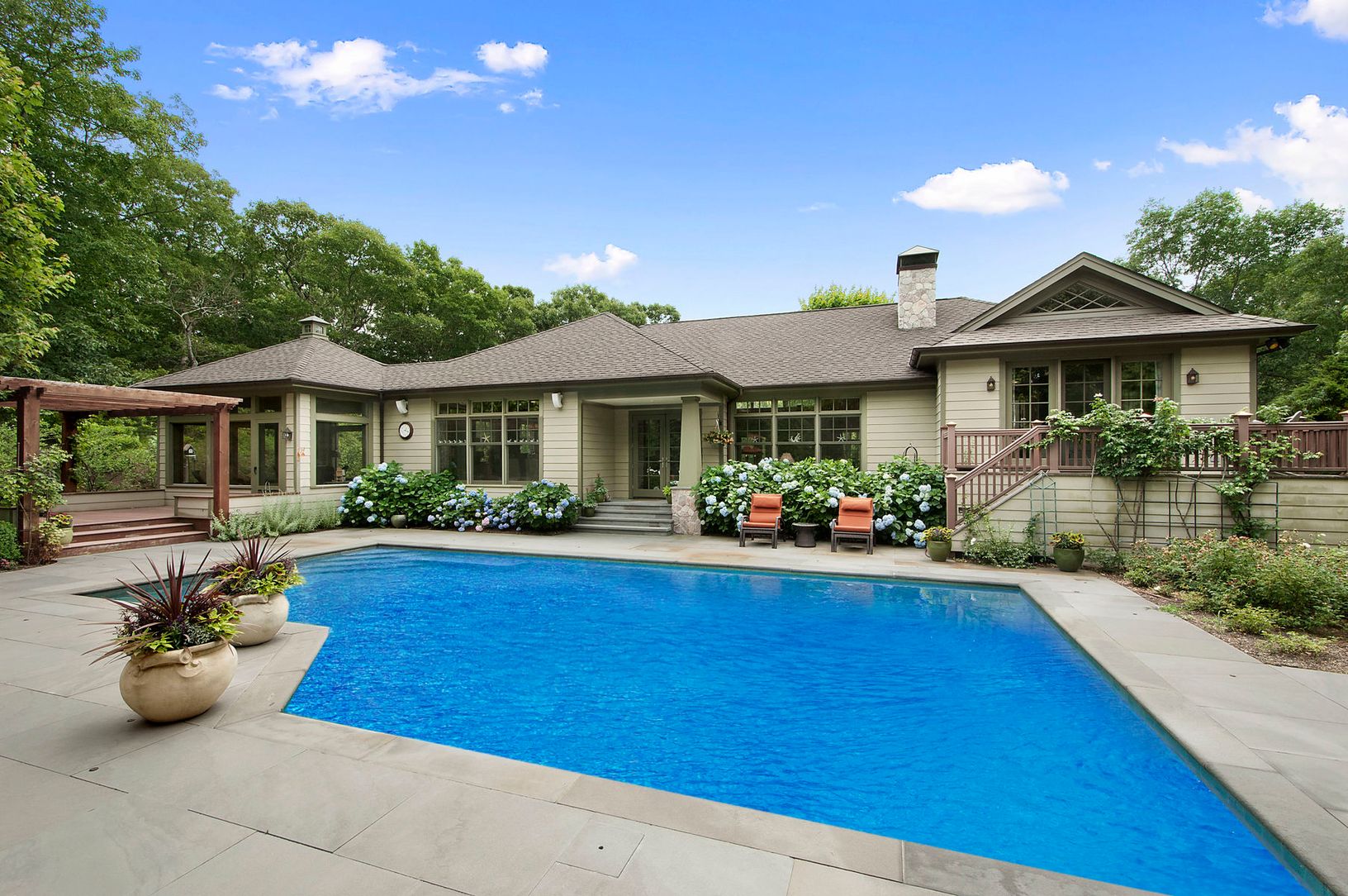 This secluded beauty is located in a desirable neighborhood of the Northwest Woods and brings a complete Hamptons home feel. Situated on a wooded cul-de-sac, this very private and luxurious home is an ideal place to enjoy peace and quiet. The main entrance brings your eye directly across the house to the dazzling pool area thanks to invisible screen doors and windows. The great room is the center of the house, opening up the entire house. With
