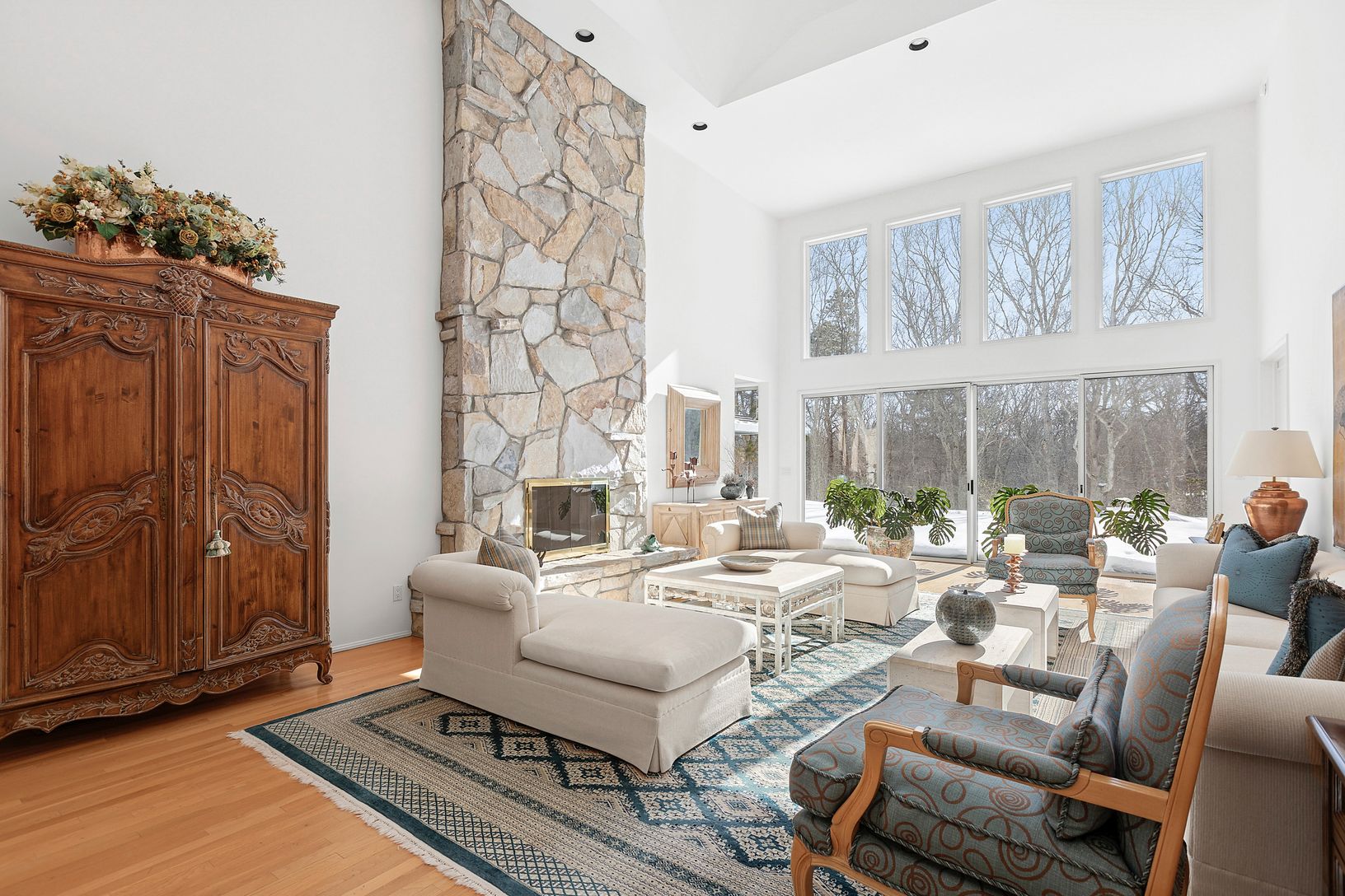 Situated on 1.2 acres along a quiet East Hampton street, this single-level residence offers more than 3,150 square feet of well-balanced living space designed for effortless indoor-outdoor living. The home features four generously sized bedrooms and three and a half bathrooms, all thoughtfully arranged for comfort and ease. At the center of the home, a well-appointed kitchen opens to expansive living and dining areas, creating an inviting sett