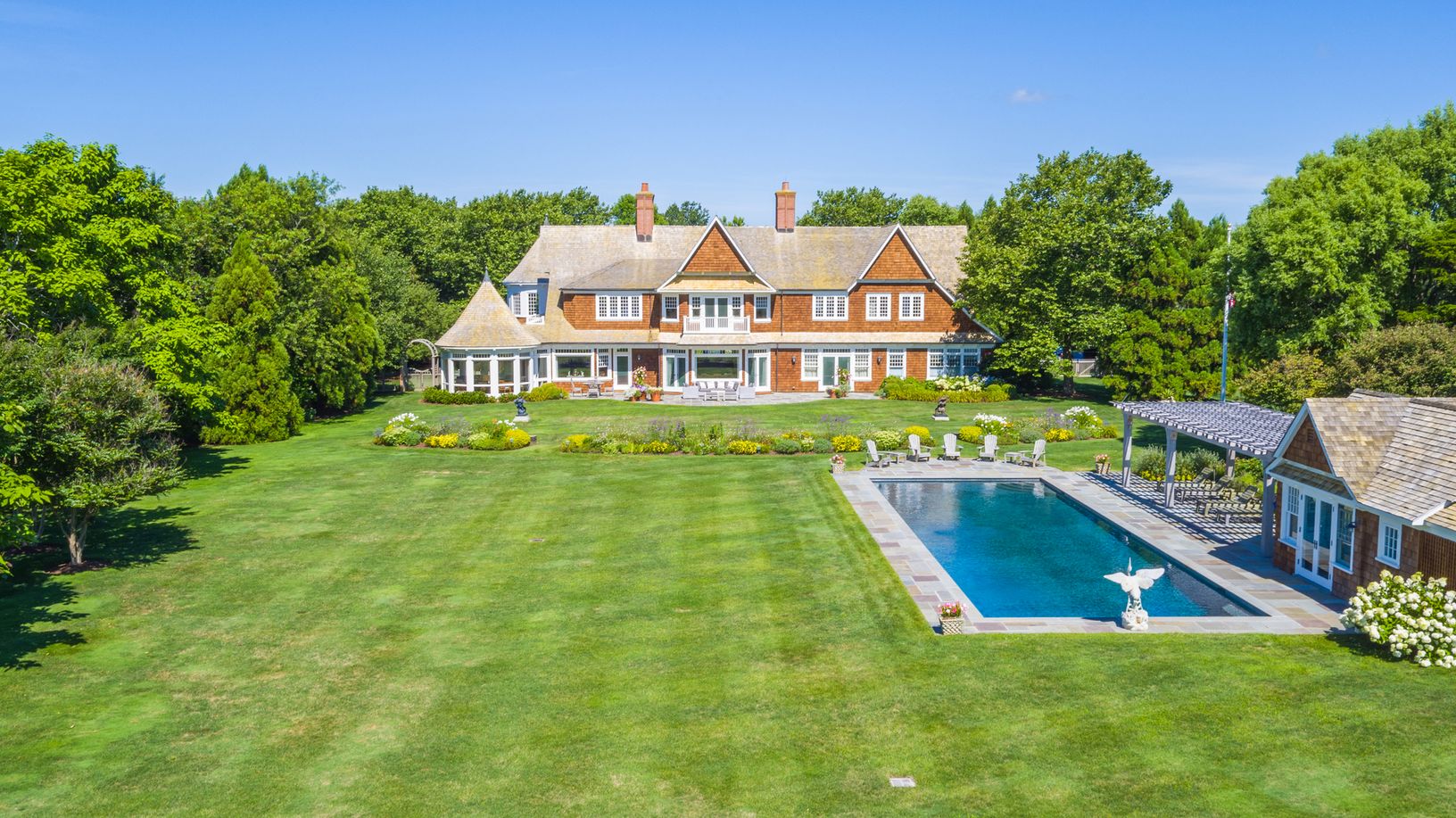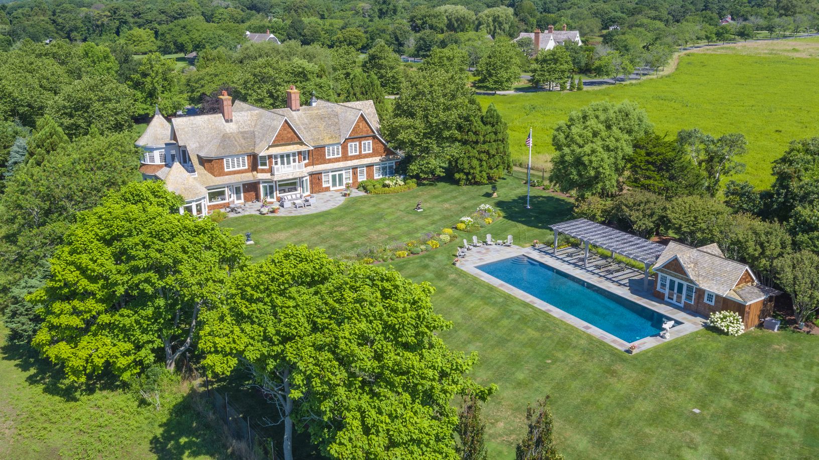 This stunning 2.4 acre home sits on a quiet waterfront peninsula on Georgica Cove. The home boasts five bedrooms and six and one-half baths plus a 60 ft. heated swimming pool and pool house. Built in 1997 by Caramagna Builders and designed by architects Zwirko & Ortmann, this home features a two-story entrance foyer, living room with bay windows, library, circular dining room and a country kitchen with fireplace, porch/sunroom with radiant