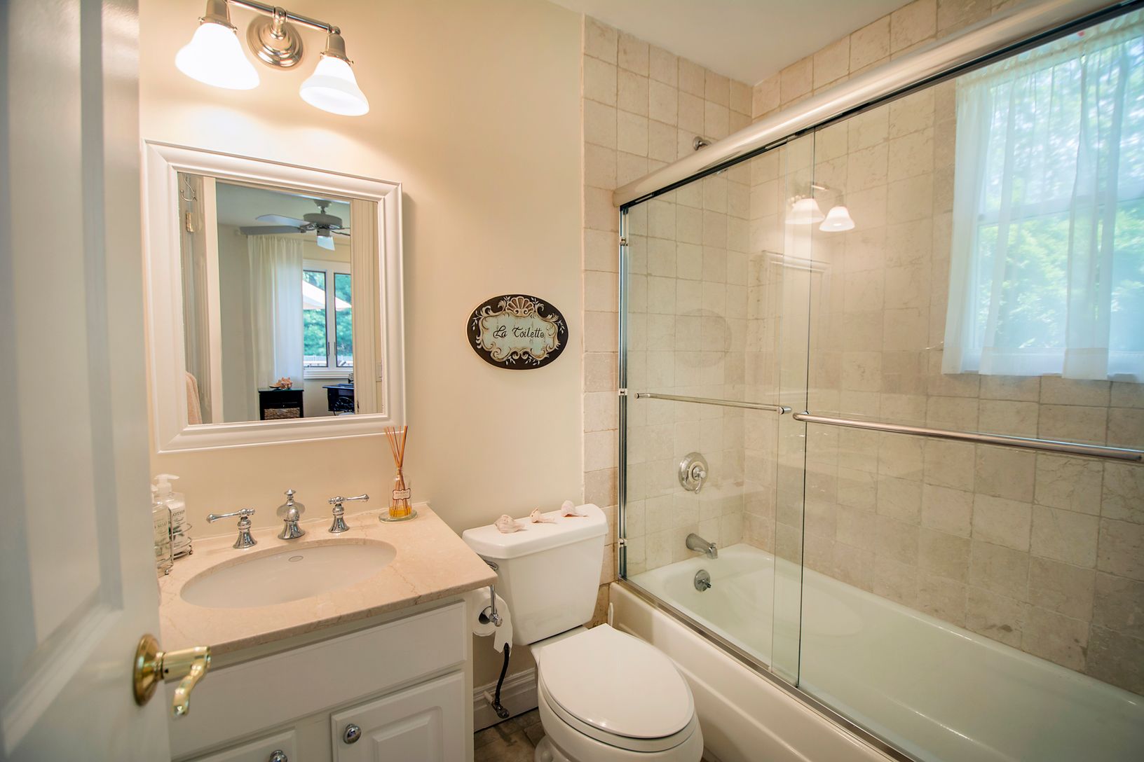 Located in a Southampton-North waterfront community, this recently redecorated shingle-style traditional home has been refreshed and decorated with light and bright furnishings, offering comfort and ease in every room. Set on almost a half-acre with in-ground heated pool, the covered front deck opens to an open floor plan starting with the living room with large flat screen TV, and doors out to the large deck. The fully-modern kitchen with sta