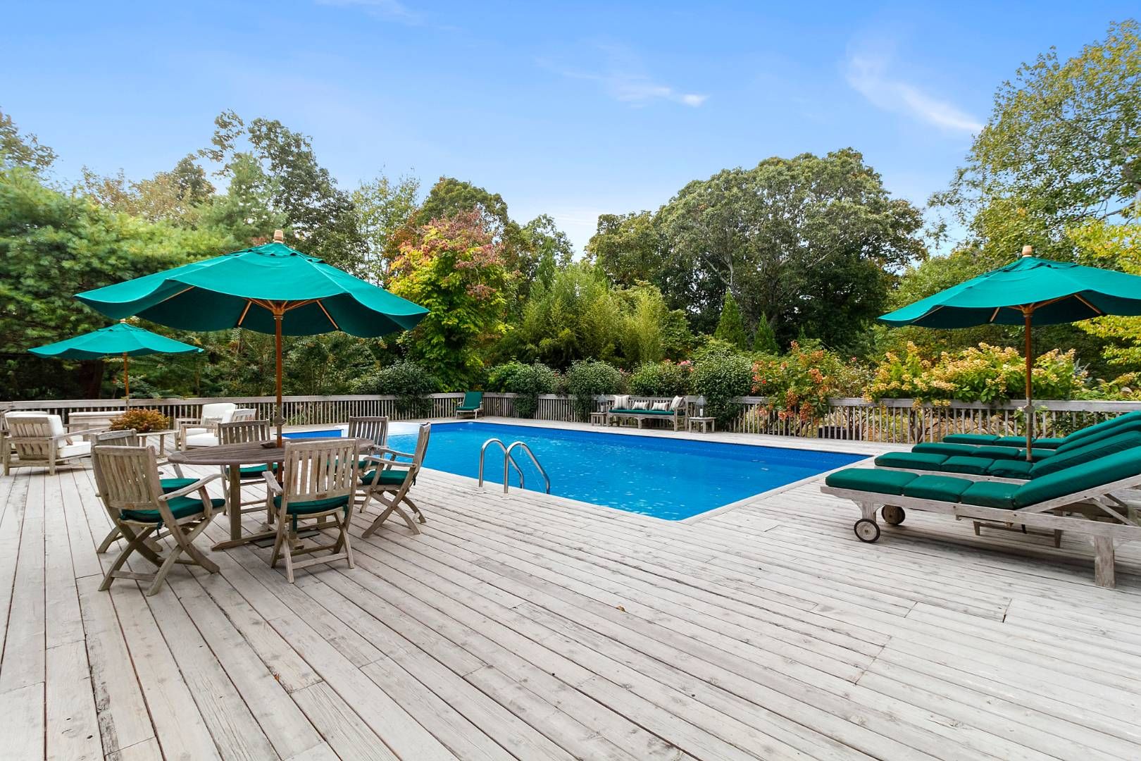 Spend this summer in this clean Post Modern nestled on a private 2.3 +/- acre lot, minutes from ocean and bay beaches, fine dining, horse riding stables and world-class golf courses. A spectacular spot for a hideaway --but central proximity for entertaining and everyday living-- the home features floor-to-ceiling windows exposing an expansive deck and 20' x 40' pool, and a custom gourmet kitchen that flows into the living and dining area. A tw