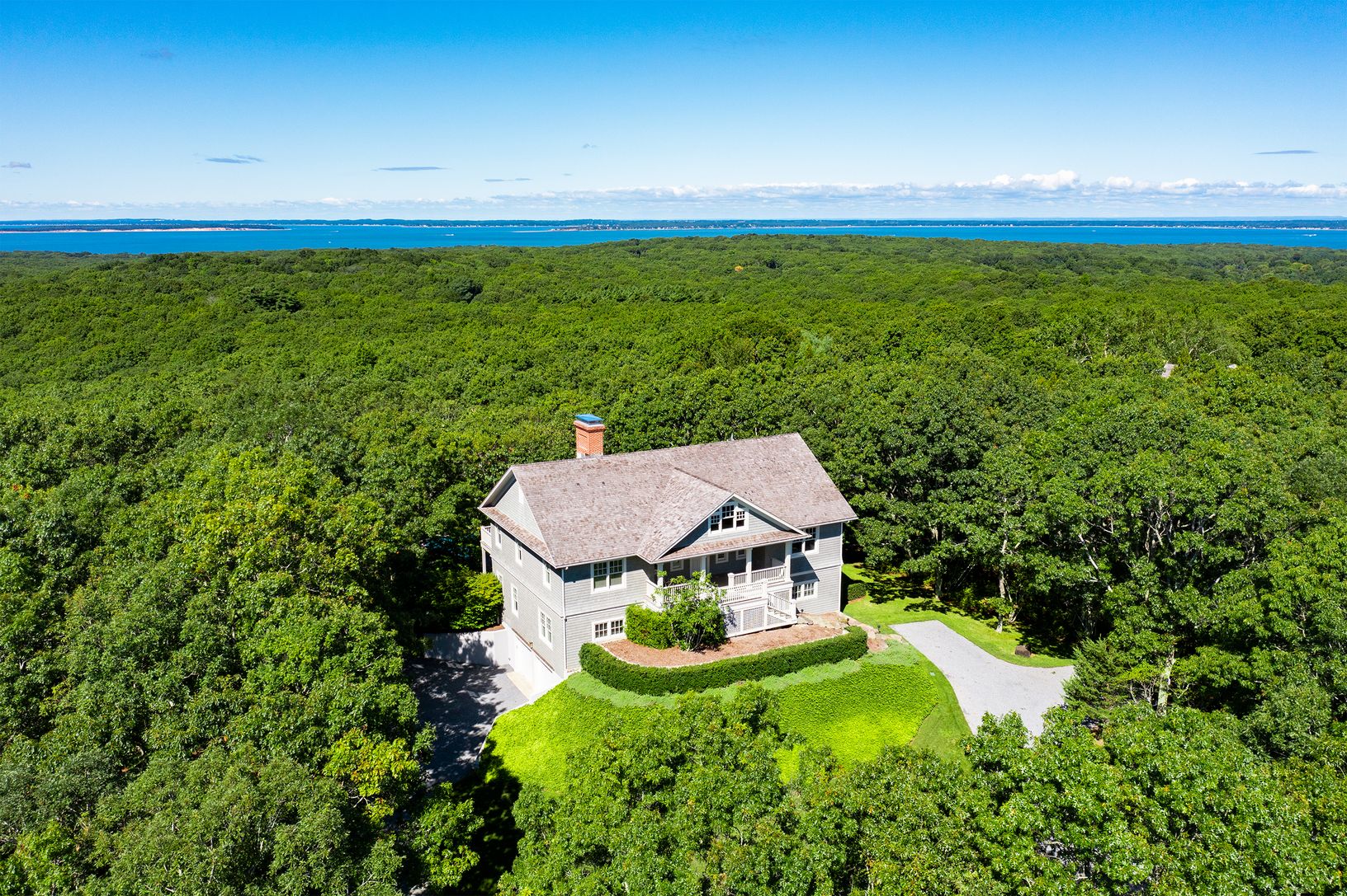 Perched on a gentle hilltop in a quiet enclave that is secluded yet minutes to four Hamptons villages, this charming custom traditional features stunning water views of Peconic Bay. From its airy open plan main level, the magnificent vistas and ever changing light are on display from the double height living room, dining area, chef's kitchen and primary bedroom suite. All rooms are generously proportioned, including the three guest bedrooms pl