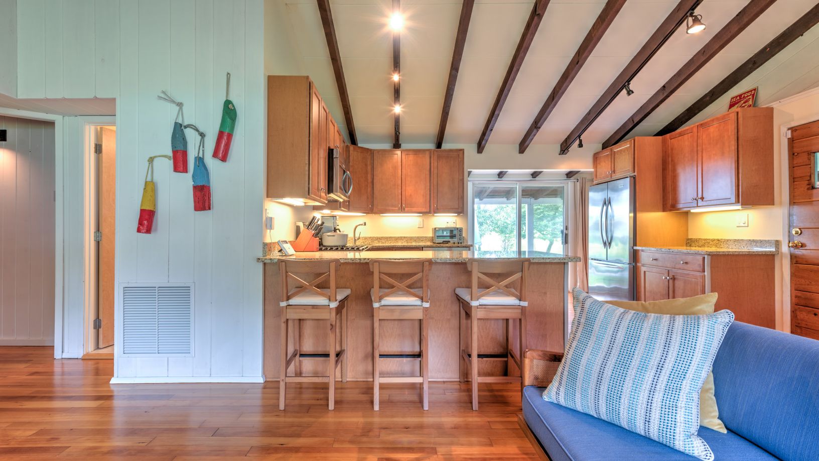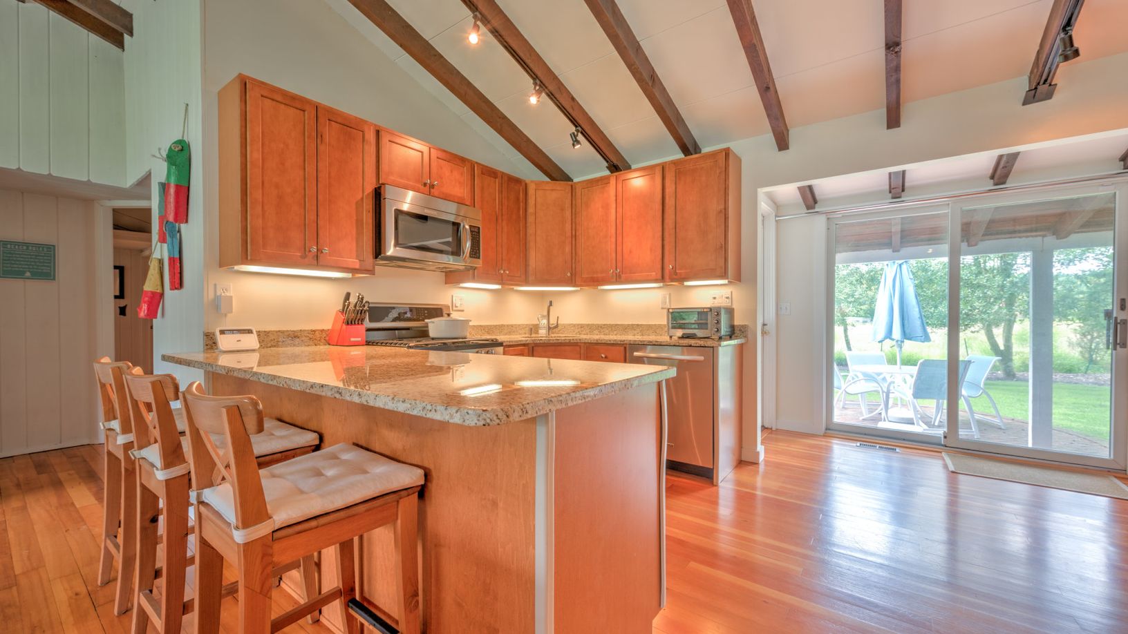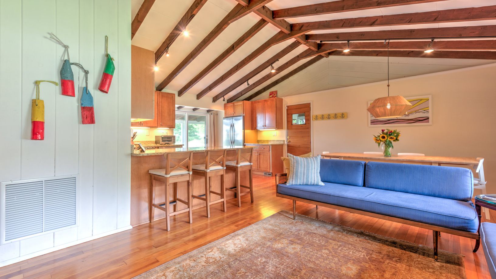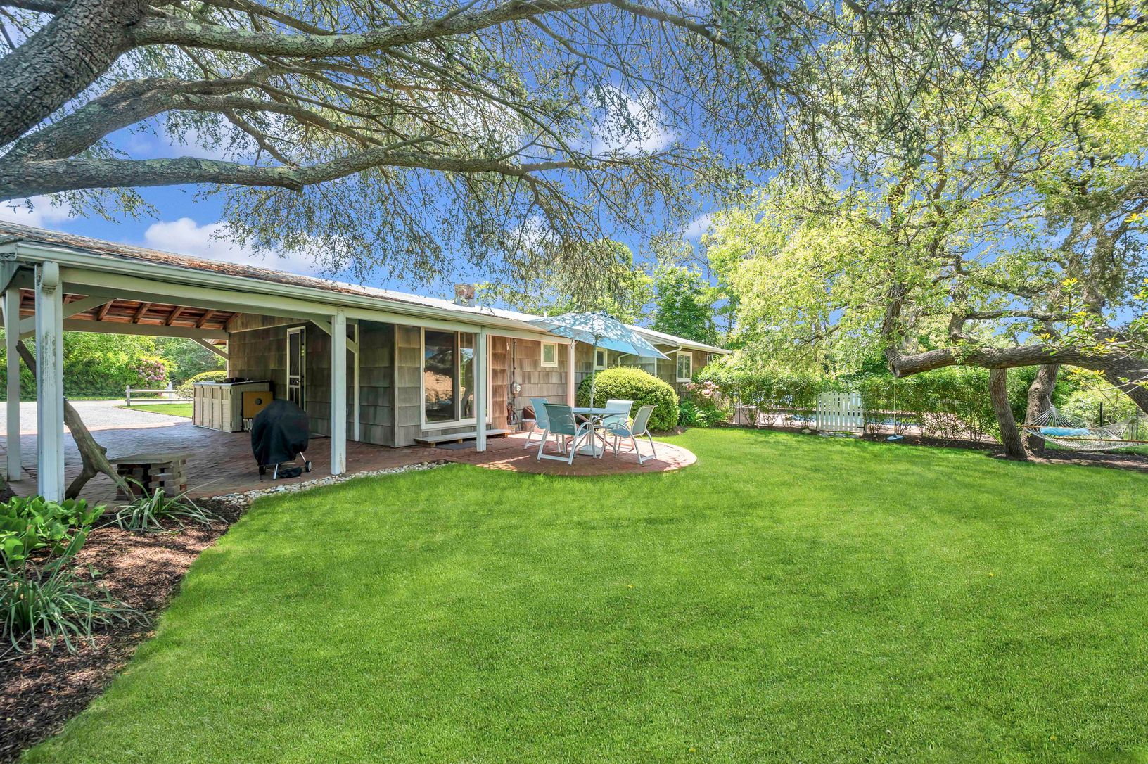 This beautiful raftered home is the classic Hamptons vacation for anyone looking for a little getaway. When you walk through the doors of this Southampton home, you will be welcomed by a true open-plan living and dining area. The common area is all-inclusive allowing for you to cook dinner while mingling with all guest