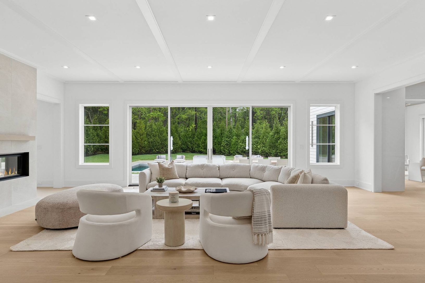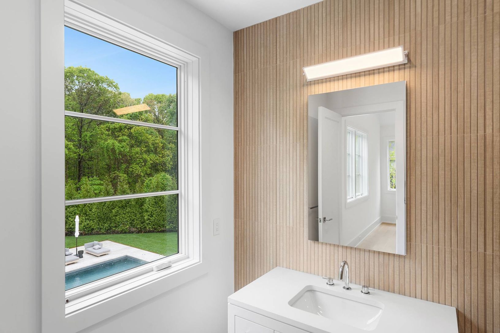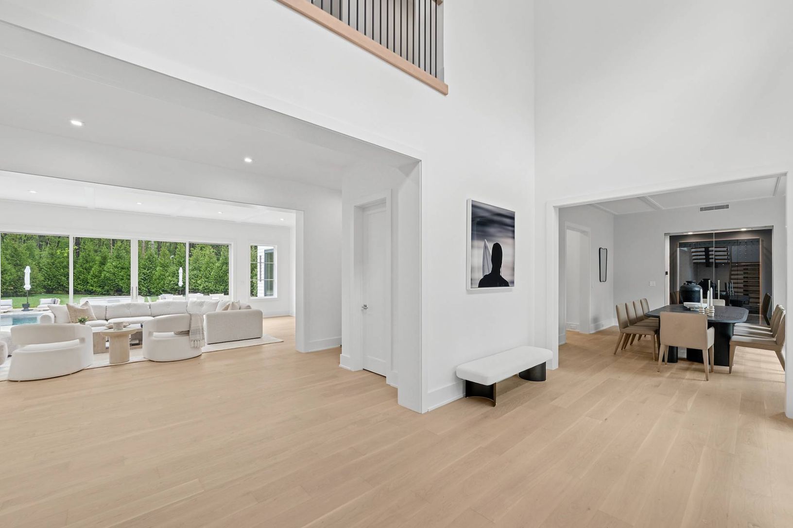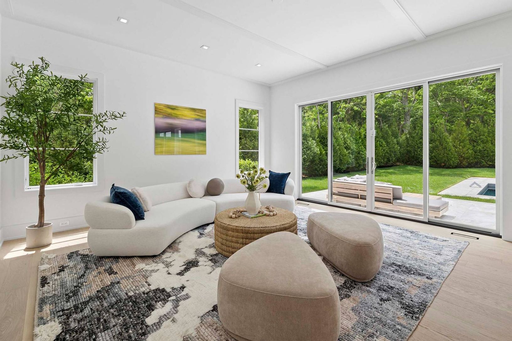 Ready for immediate occupancy and fully furnished. Stunning new construction from renowned Hamptons Paramount Development Group, South of the Highway in Wainscott. Sited on a flag lot off the end of a cul-de-sac and surrounded by scenic easement, this brand-new home has 7,366 +/- sq. ft. of living space on 3 levels with 7 bedrooms, 7.5 baths, an attached 2-car garage, and heated saltwater pool with an optional pool house. Seamless luxury insid