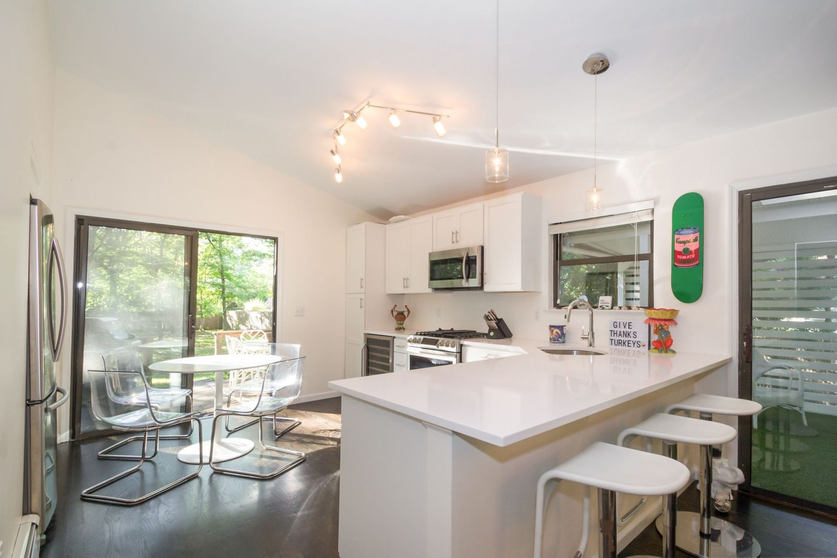 A sweet contemporary home awaits you in the Springs! This lovely two bedroom, two bathroom home sits on a large lot on a quiet street. Less than a ten minute ride to both East Hampton Village , Amagansett Square , and to bay beaches, this home has been fully renovated throughout with new hardwood flooring, new white kitchen cabinets, Silestone countertops and new appliances including a wine cooler, gas stove, microwave, refrigerator and dishw
