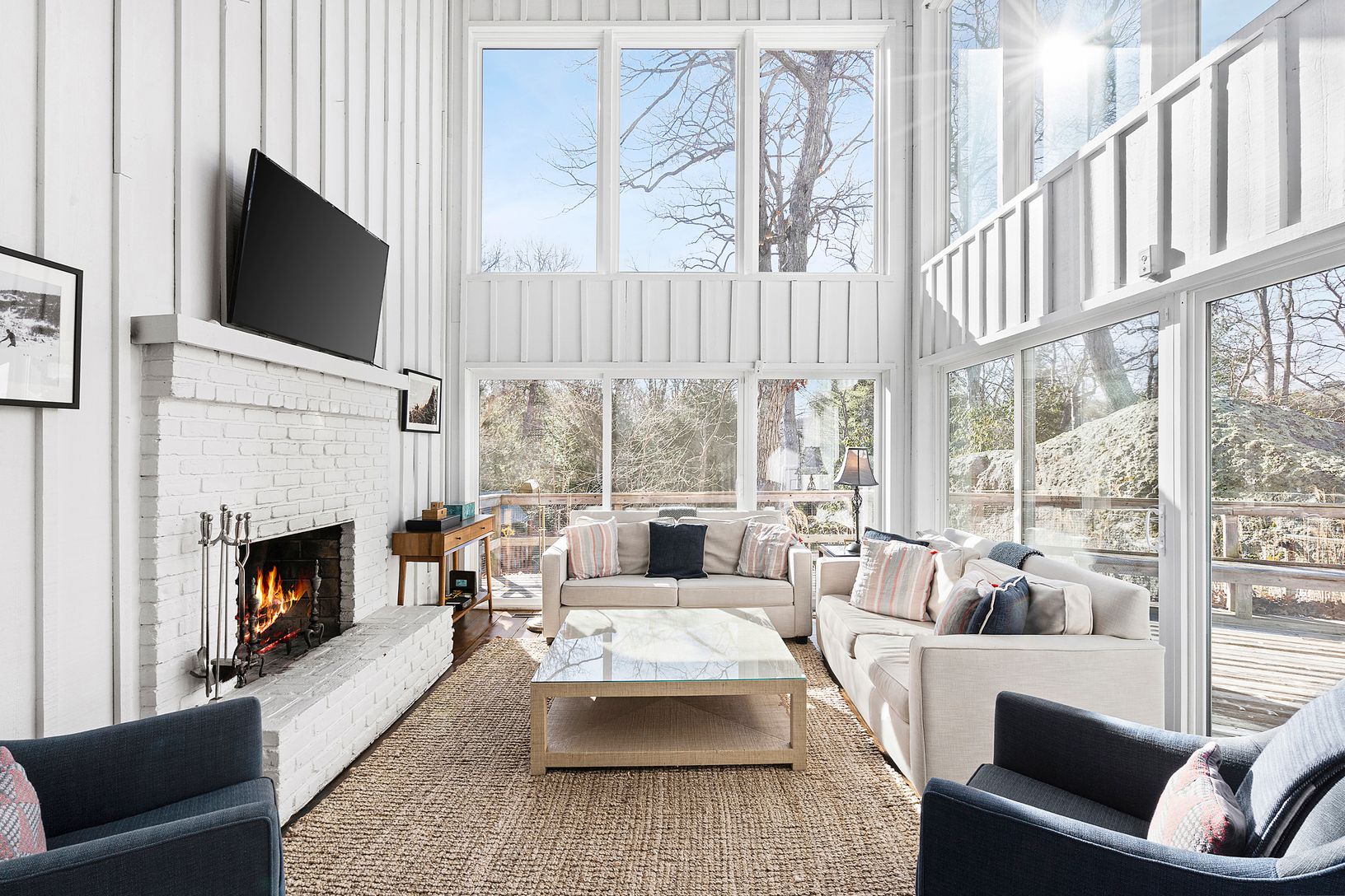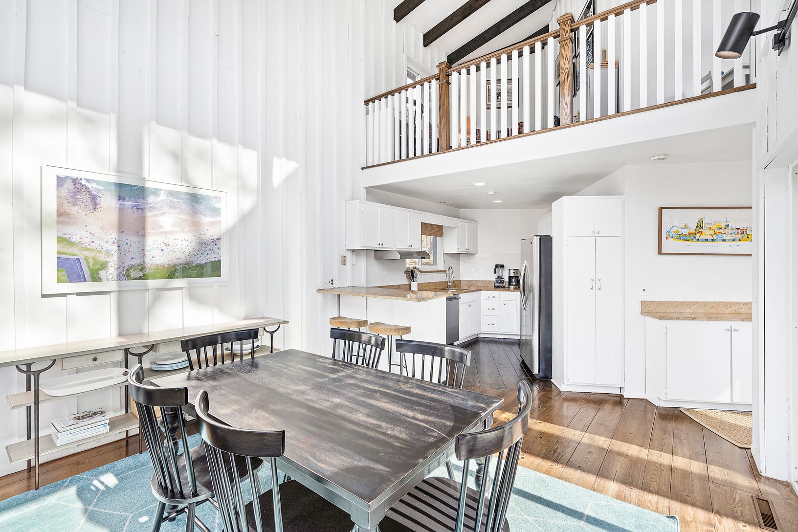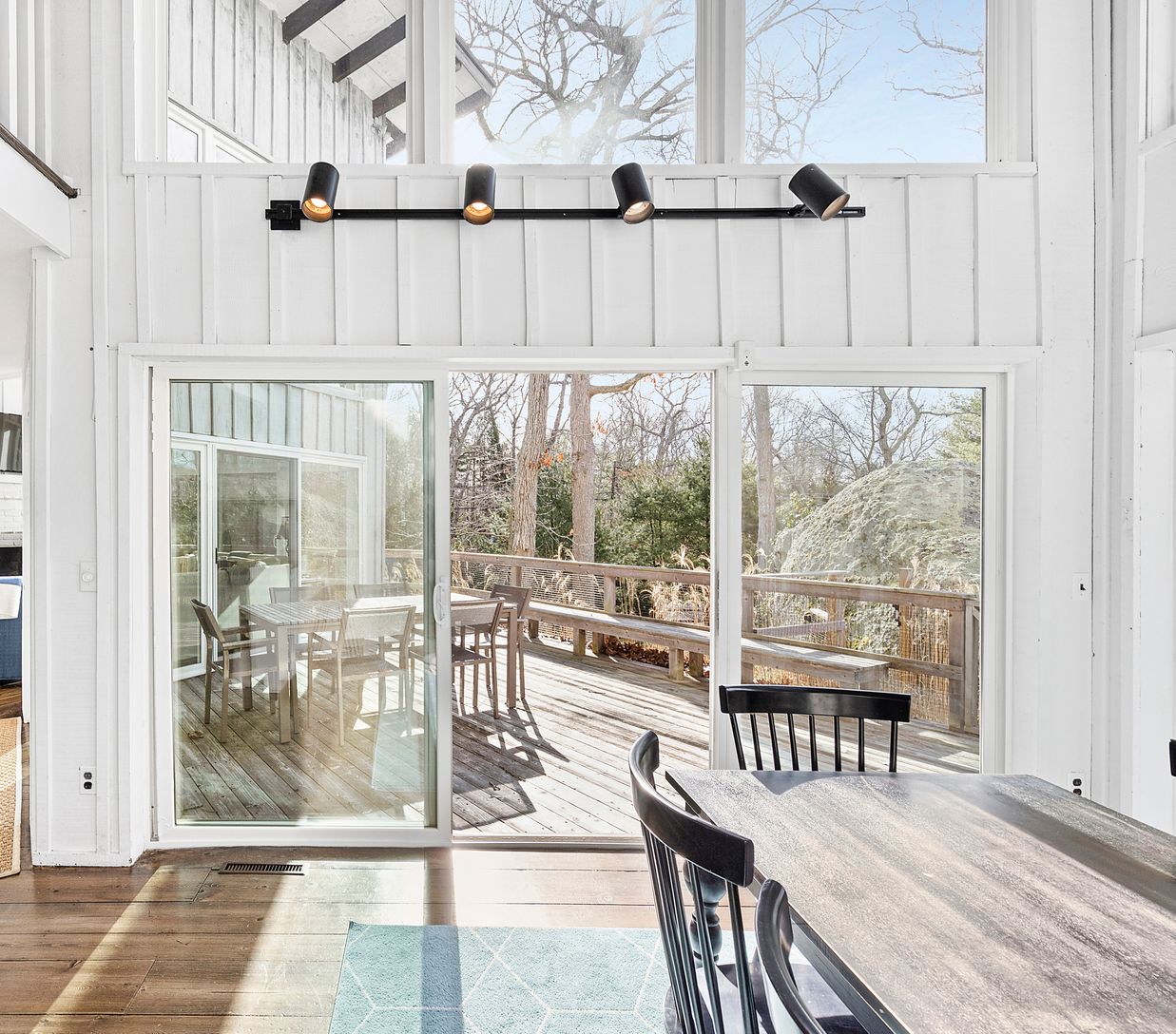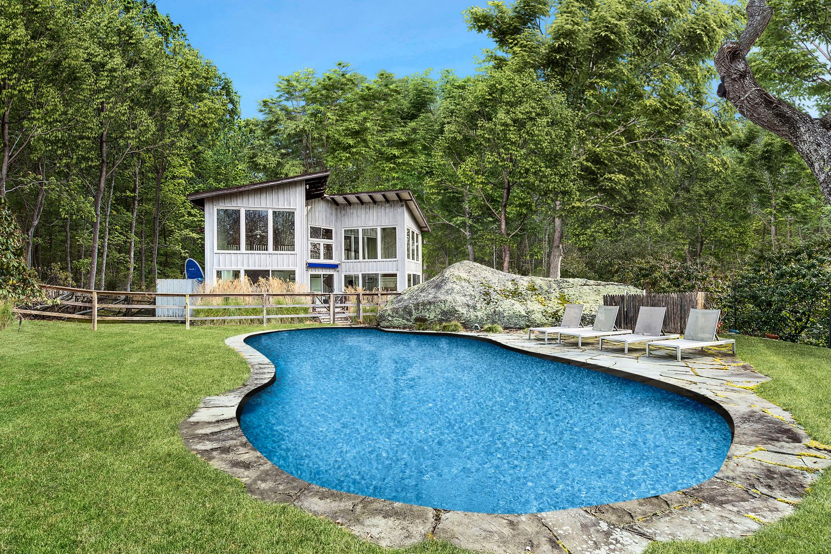 On top of a hill near Three Mile Harbor sits this 4-bedroom home, located on a quiet street in East Hampton’s sought-after Settlers Landing neighborhood. This South-facing modern beach house is one of the most architecturally interesting homes in the area, featuring one of the largest boulders on Long Island! The contemporary design features towering walls of double-height glass on almost all exposures, flooding the space with sunlight. The fi