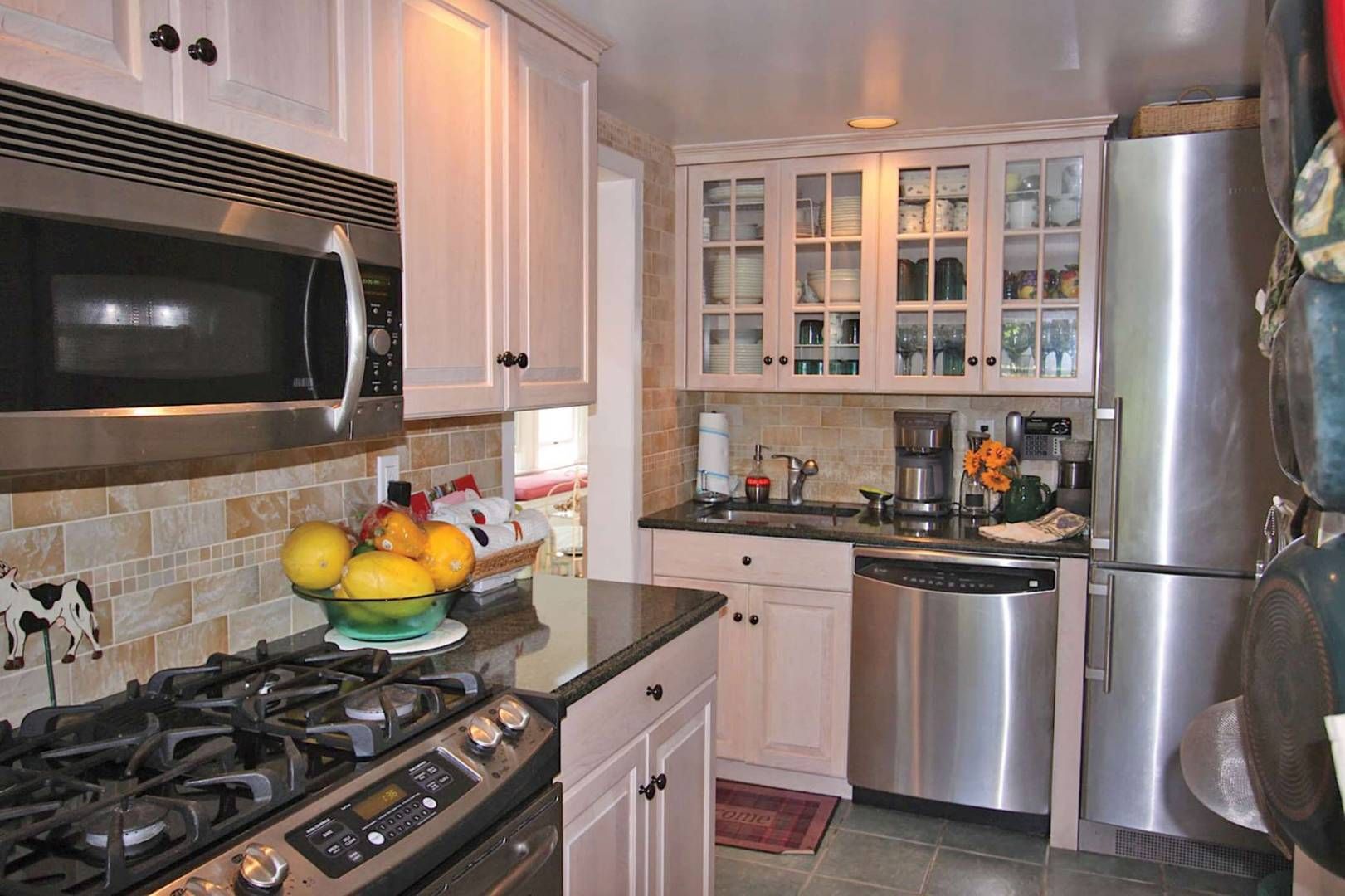 Just a block from the bay in Southampton discover this utterly captivating cottage. Situated on a little-traveled lane south of the highway this two bedroom home is beautifully finished and set in a private backyard lush with lawn, flowers and trees. Inside the neat, gray-shingled exterior discover artfully finished and light-filled interiors. Enter to a bright, sunny living room with skylights and windows on two sides. The dining room feature