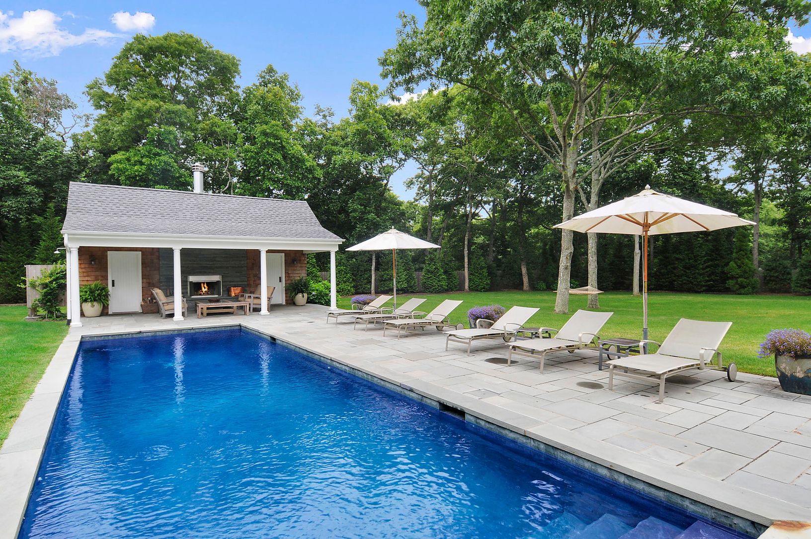 This meticulously renovated 3 bedroom, 3 bath traditional near East Hampton Village has an exquisite pool house, gunite pool and free-standing garage on a beautifully landscaped shy acre. Perfect for entertaining: sophisticated and comfortable living room with fireplace, backyard porch, bluestone patio and cabana with bath. Located close to town beaches and shops at the end of a small cul-de-sac.
