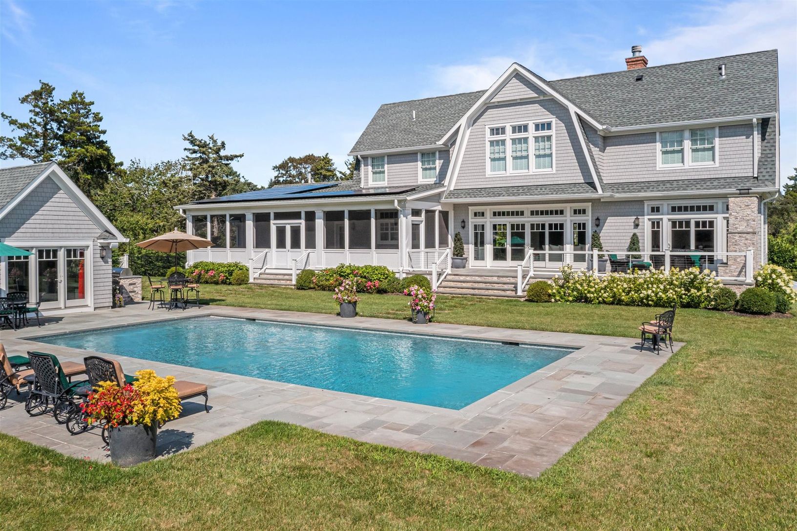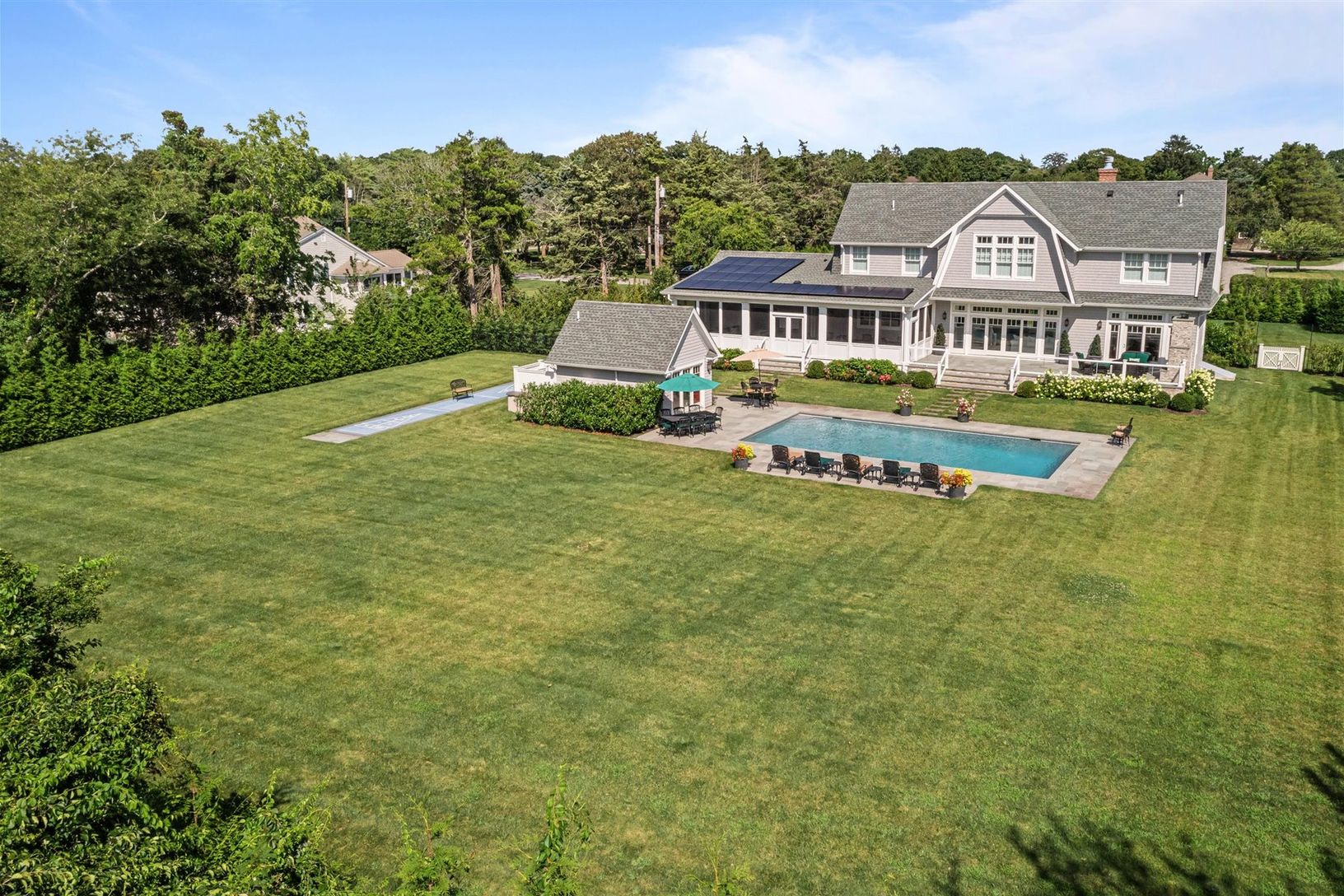 Located in the highly desirable estate section of Quogue Village, this elegant residence blends classic Hamptons style with modern functionality and amenities. Custom built in 2020, the home is sited on 1.04+/- acres and offers the efficiency and cost-effectiveness of geo-thermal heat/CAC and solar power. A stunning double-height entry foyer welcomes with a view out to the pool and grounds. Offering a user-friendly and graciously-scaled open f