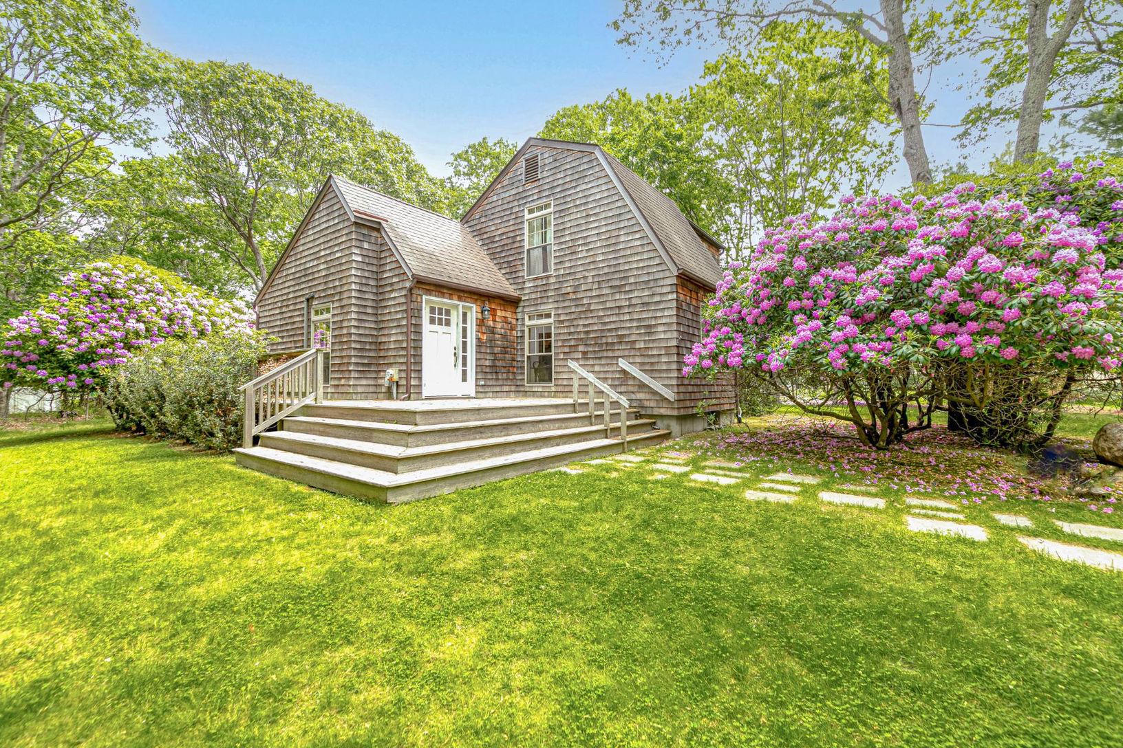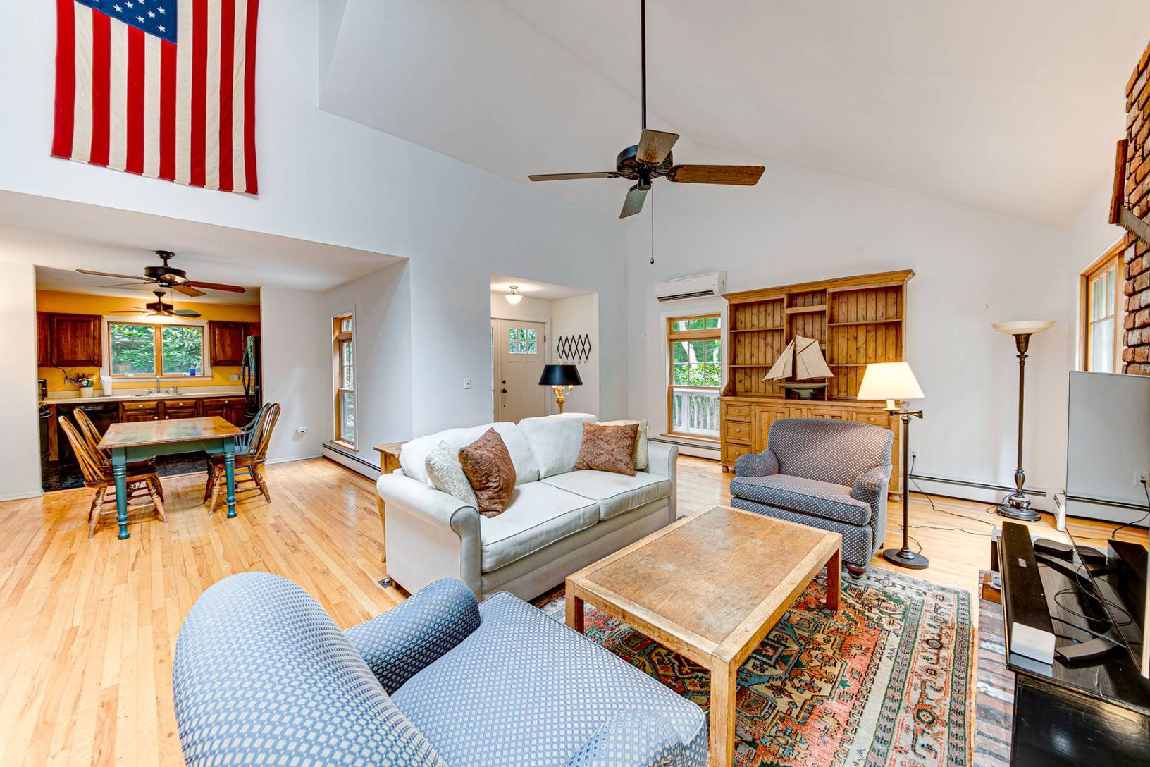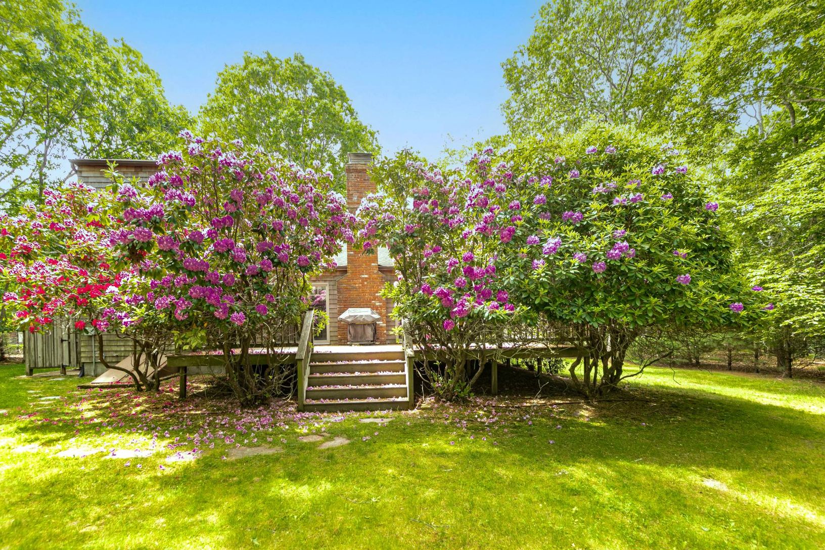 Located on a pretty cul-de-sac street in East Hampton's artist enclave of Springs, this well-maintained three bedroom, two bath home, offers a lovely country retreat away from the hustle & bustle of city life. Surrounded by mature rhododendron trees and situated on a secluded acre, the first floor features a living room with high ceilings and a central fireplace flanked by 2 sets of glass doors that lead to a spacious deck. An open dining