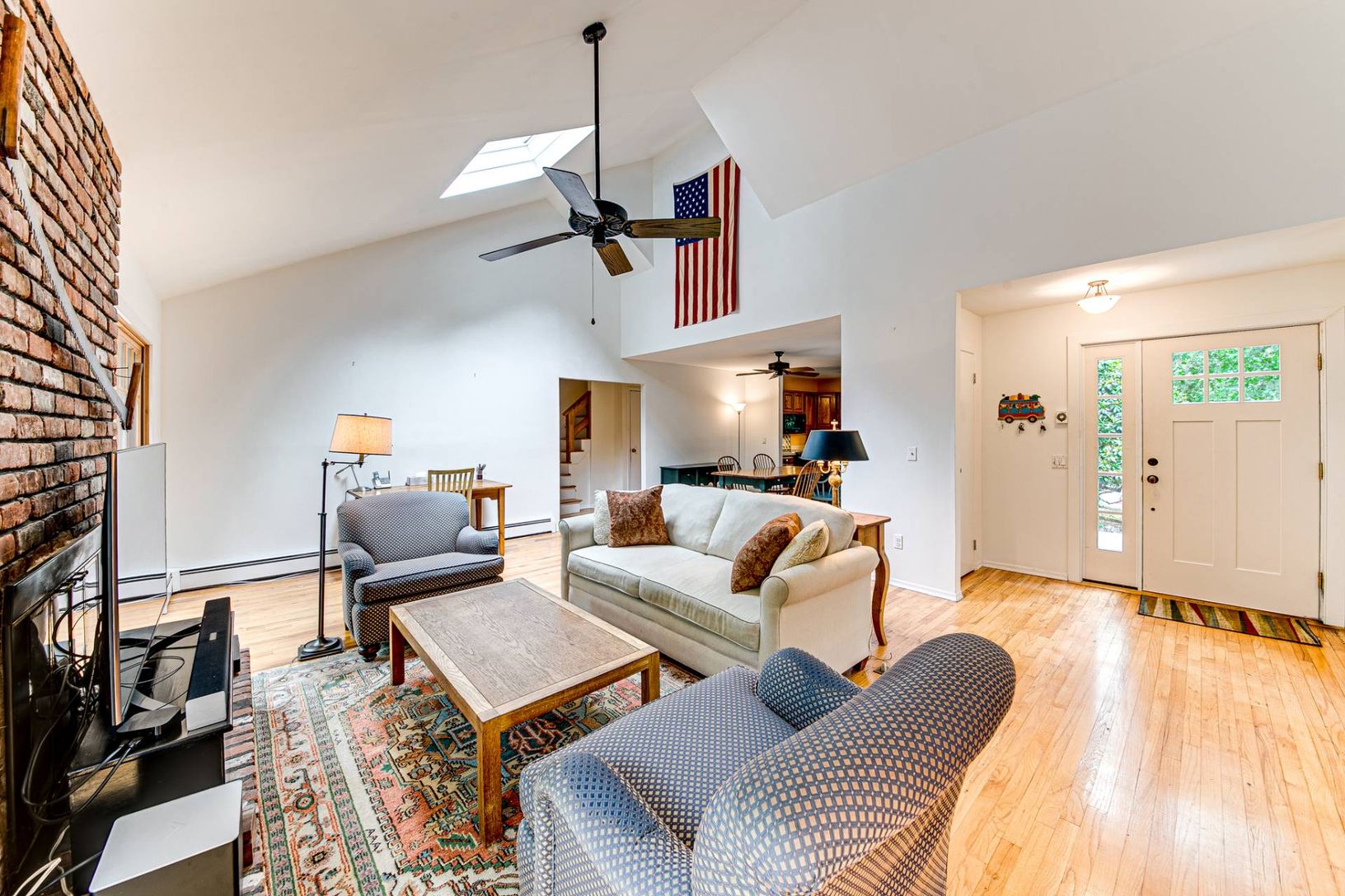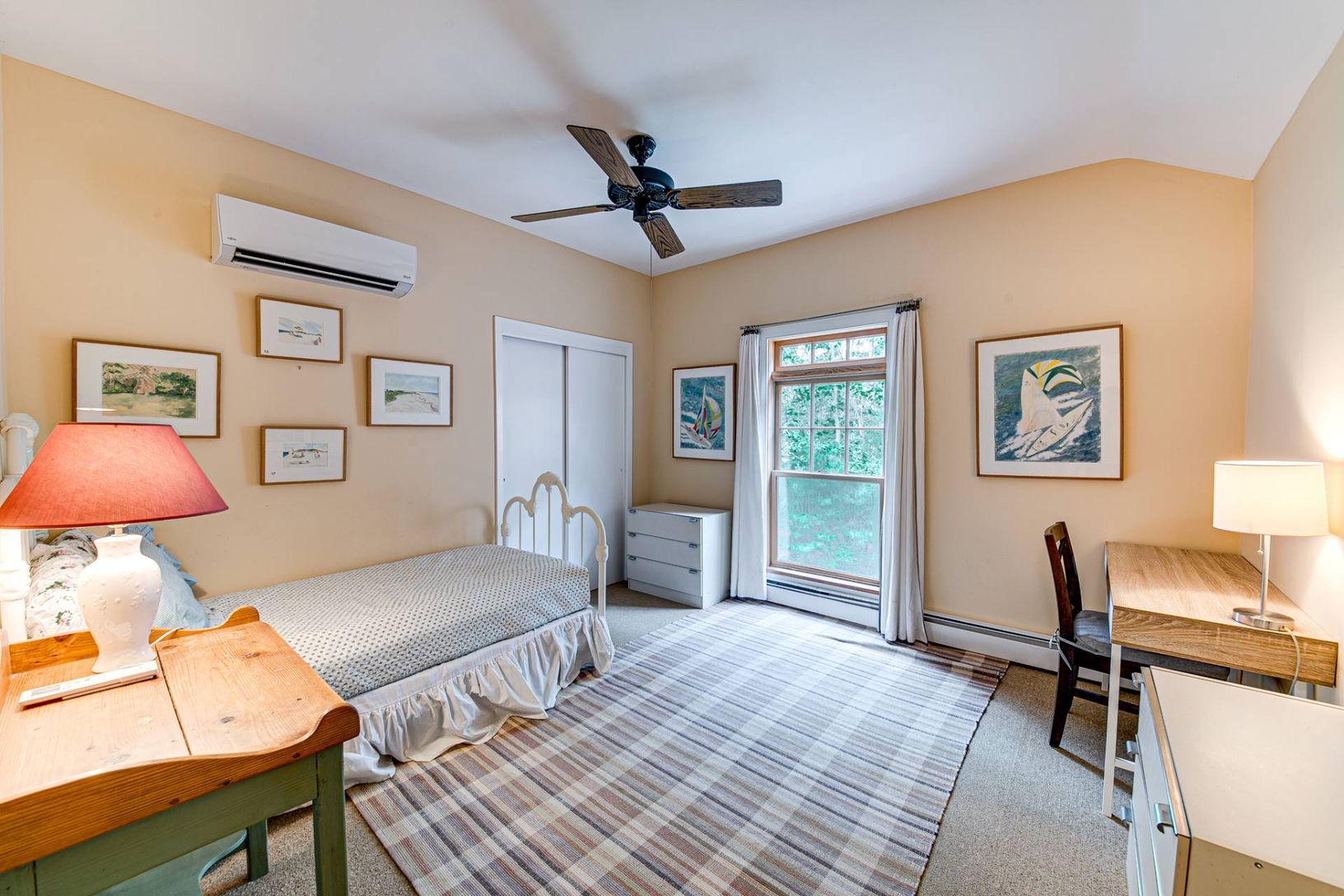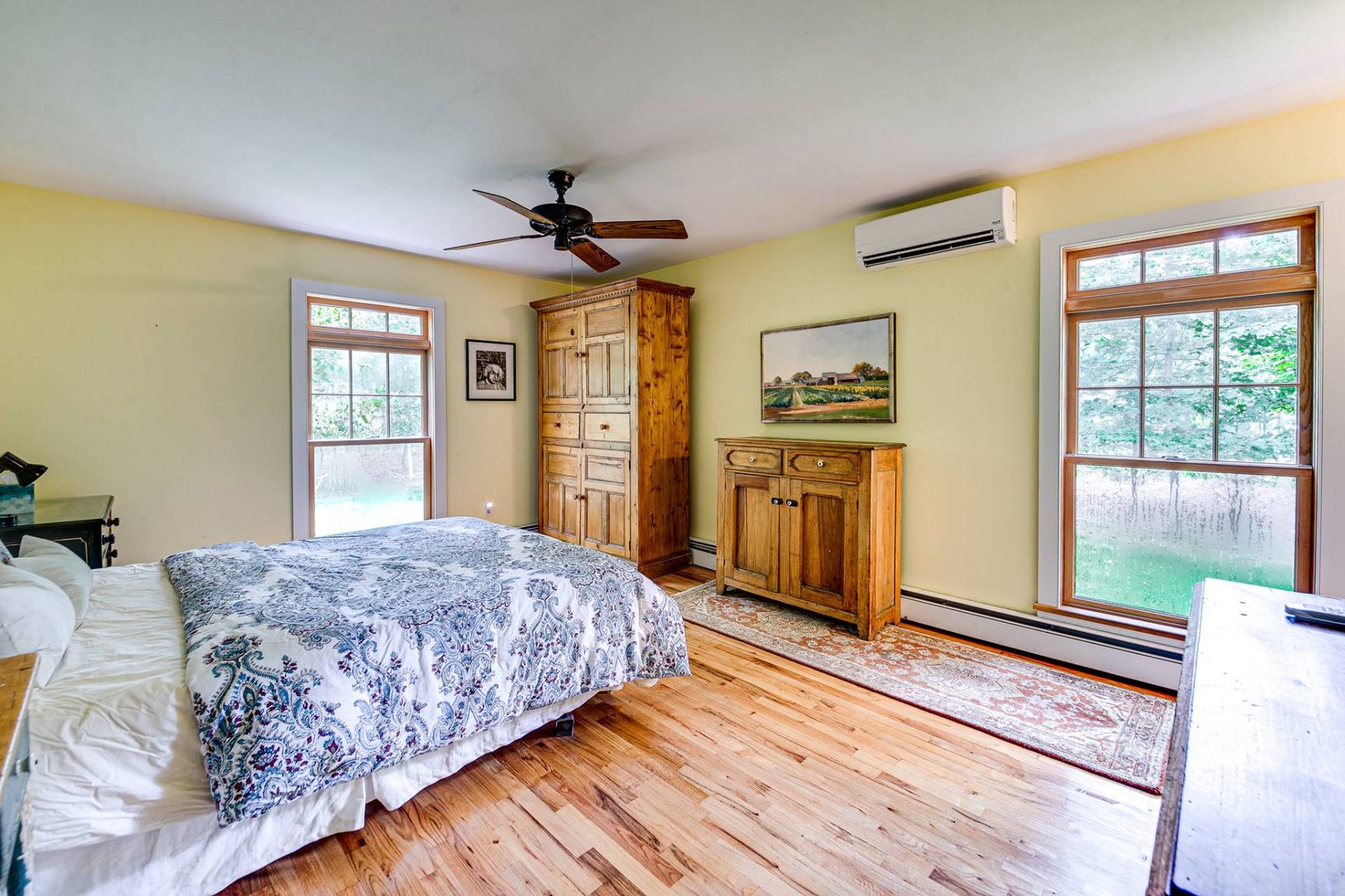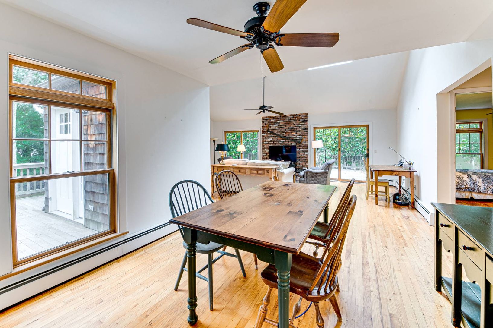 Located on a pretty cul-de-sac street in East Hampton's artist enclave of Springs, this well-maintained three bedroom, two bath home, offers a lovely country retreat away from the hustle & bustle of city life. Surrounded by mature rhododendron trees and situated on a secluded acre, the first floor features a living room with high ceilings and a central fireplace flanked by 2 sets of glass doors that lead to a spacious deck. An open dining