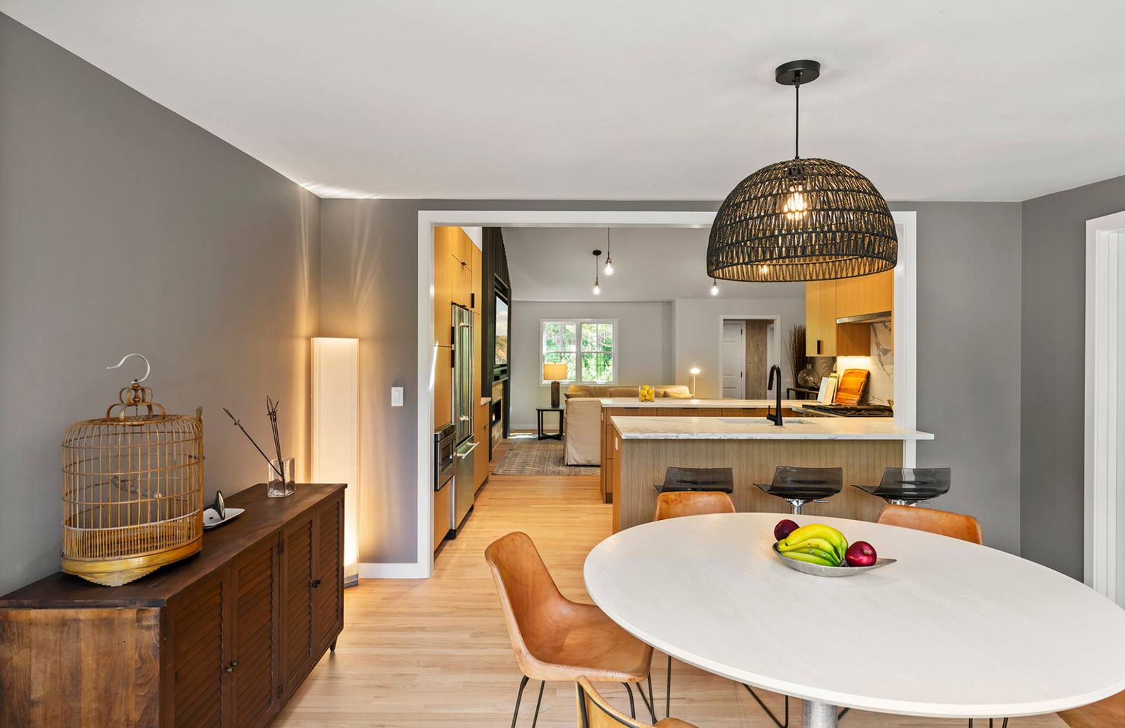 Welcome to this stunningly renovated four-bedroom, four-bath home - just one block from private beach access, with mooring rights! This single-level home is filled with sunlight and soaring ceilings throughout. You'll love the open layout and the warmth of the huge gas fireplace in the living room, complete with built-ins. The kitchen features handmade white oak cabinetry, and every bathroom has been beautifully appointed. Hardwood oak floors